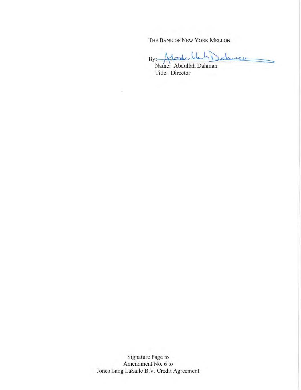 THE BANK OF NEW YORK MELLON py: ded holo ae Name: Abdullah Dahman Title: Director Signature Page to Amendment No. 6 to Jones Lang LaSalle B.V. Credit Agreement