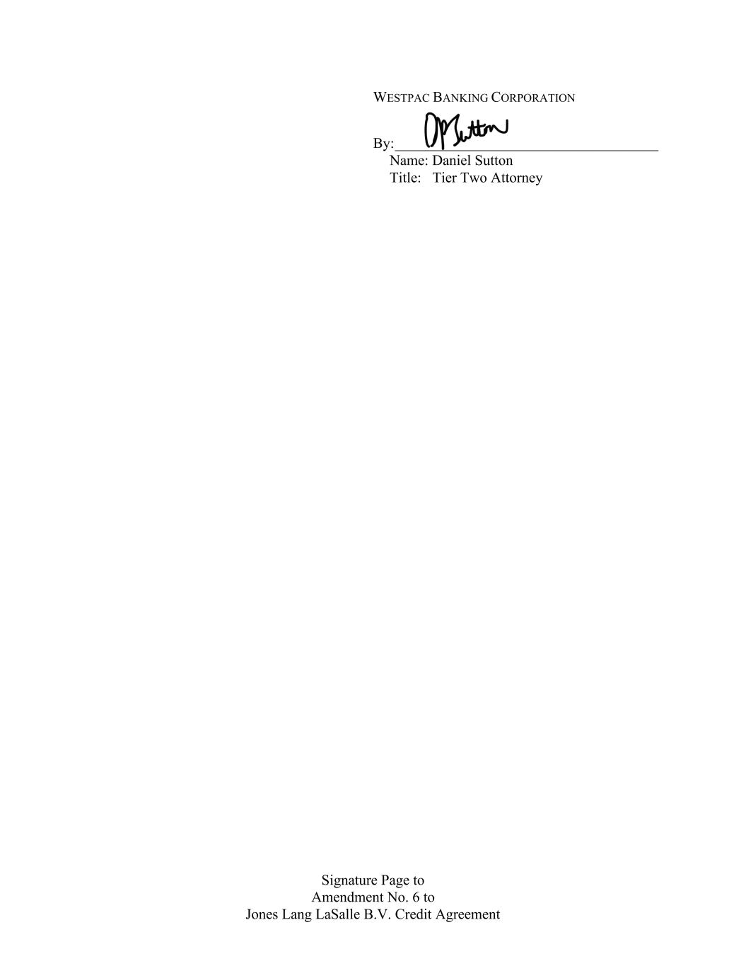Signature Page to Amendment No. 6 to Jones Lang LaSalle B.V. Credit Agreement WESTPAC BANKING CORPORATION By: ____________________________________ Name: Daniel Sutton Title: Tier Two Attorney
