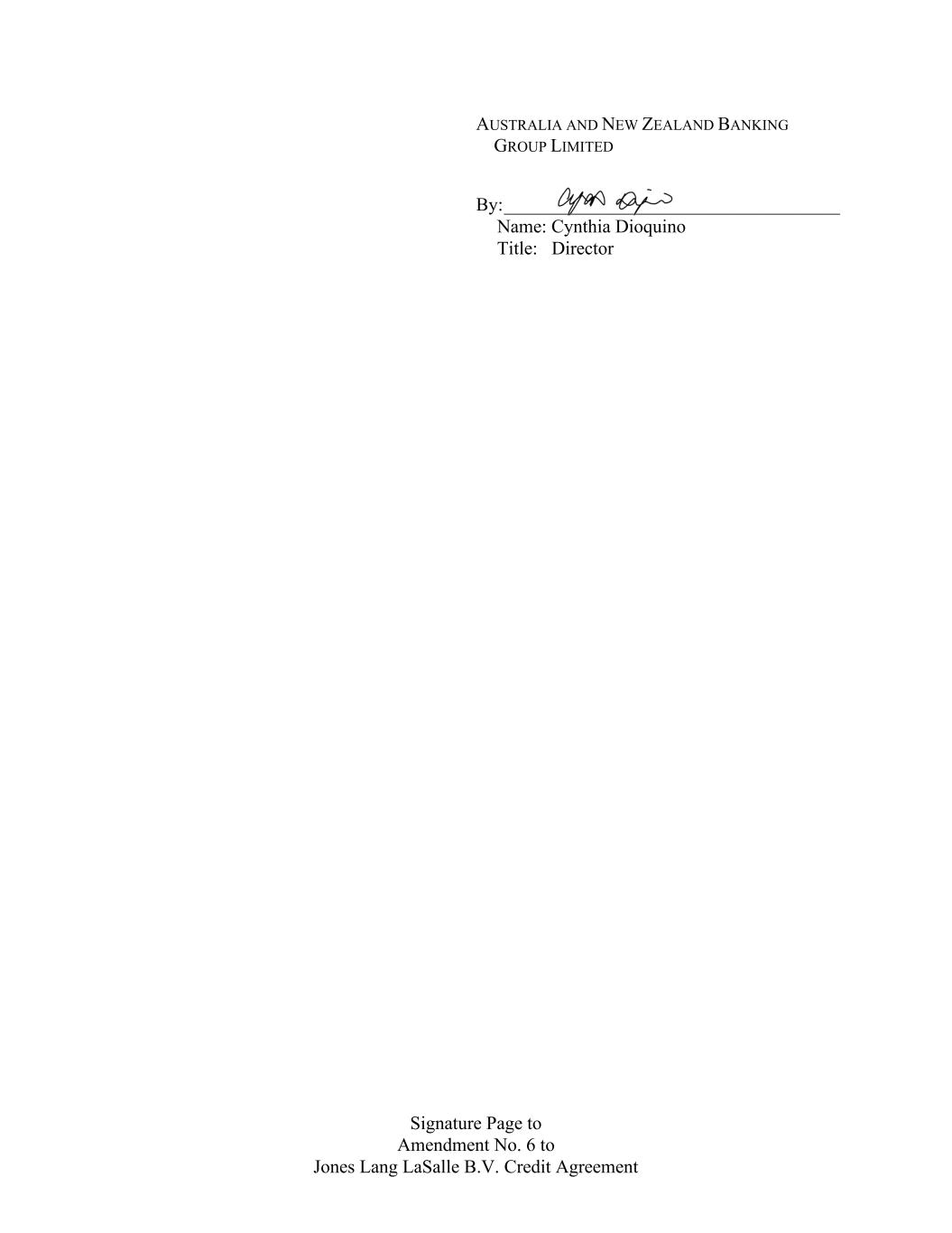 Signature Page to Amendment No. 6 to Jones Lang LaSalle B.V. Credit Agreement AUSTRALIA AND NEW ZEALAND BANKING GROUP LIMITED By: ____________________________________ Name: Cynthia Dioquino Title: Director