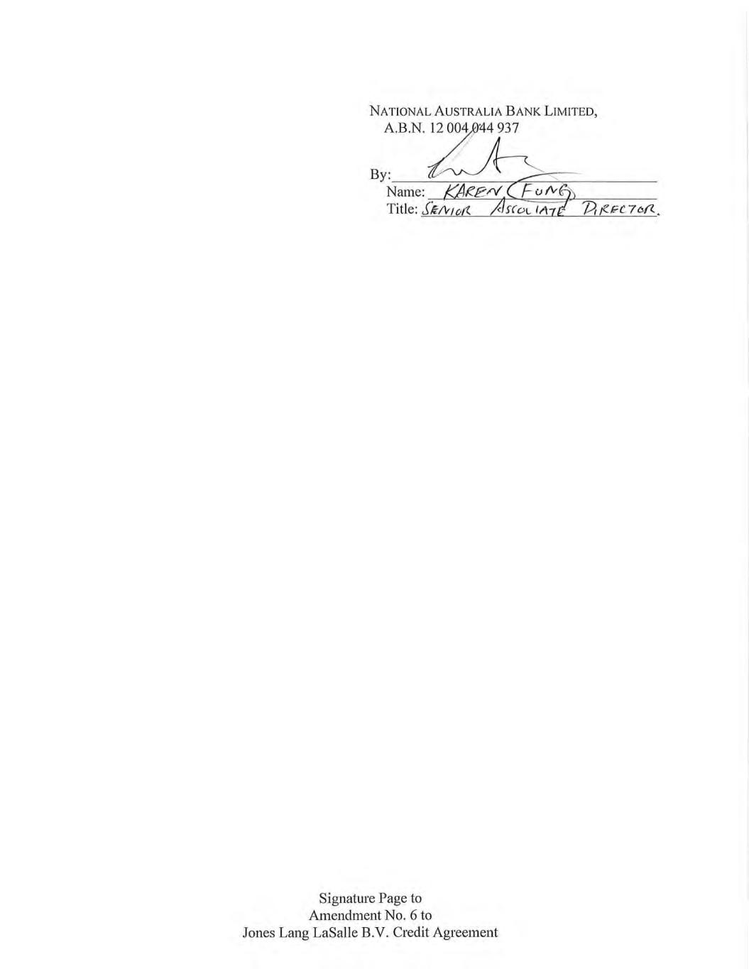NATIONAL AUSTRALIA BANK LIMITED, A.B.N. 12 004,044 937 SS Name: K4eeV.C Fur ©) Title: e~ent Alstociare DiRECTOR. Signature Page to Amendment No. 6 to Jones Lang LaSalle B.V. Credit Agreement