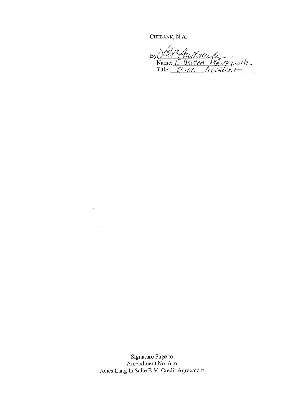CITIBANK, N.A. ay Au fkou fs, Name: L. Dorten_ Ma Low! tr Title (Vice — frvdtilenl— Signature Page to Amendment No. 6 to Jones Lang LaSalle B.V. Credit Agreement