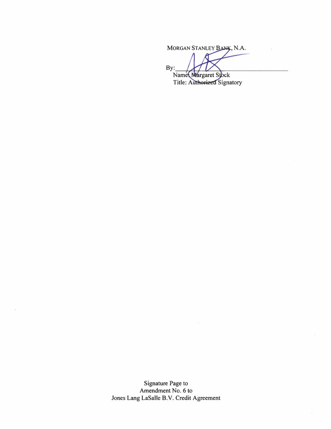 MORGAN STANLEY B ,N.A. By: Name( N&rgaret Stock Title: A wed Signatory Signature Page to Amendment No. 6 to Jones Lang LaSalle B.V. Credit Agreement