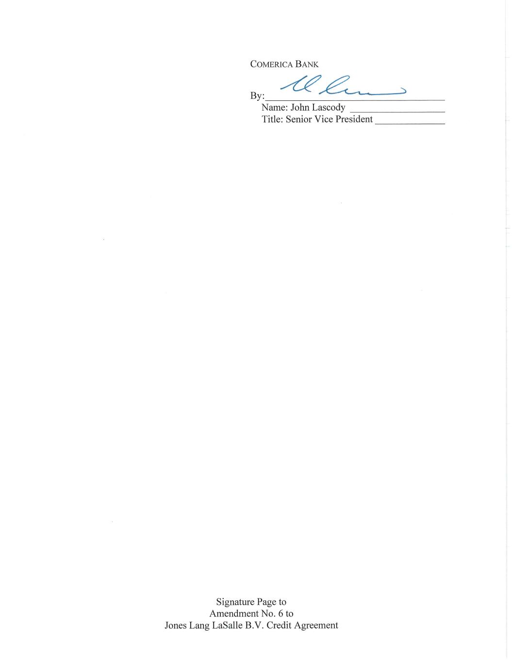 COMERICA BANK Name: John Lascody Title: Senior Vice President Signature Page to Amendment No. 6 to Jones Lang LaSalle B.V. Credit Agreement