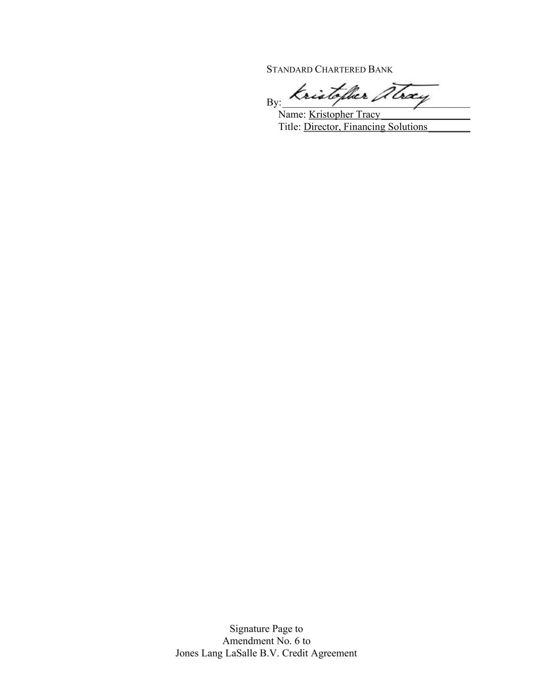 Signature Page to Amendment No. 6 to Jones Lang LaSalle B.V. Credit Agreement STANDARD CHARTERED BANK By: ____________________________________ Name: Kristopher Tracy _________________ Title: Director, Financing Solutions ________