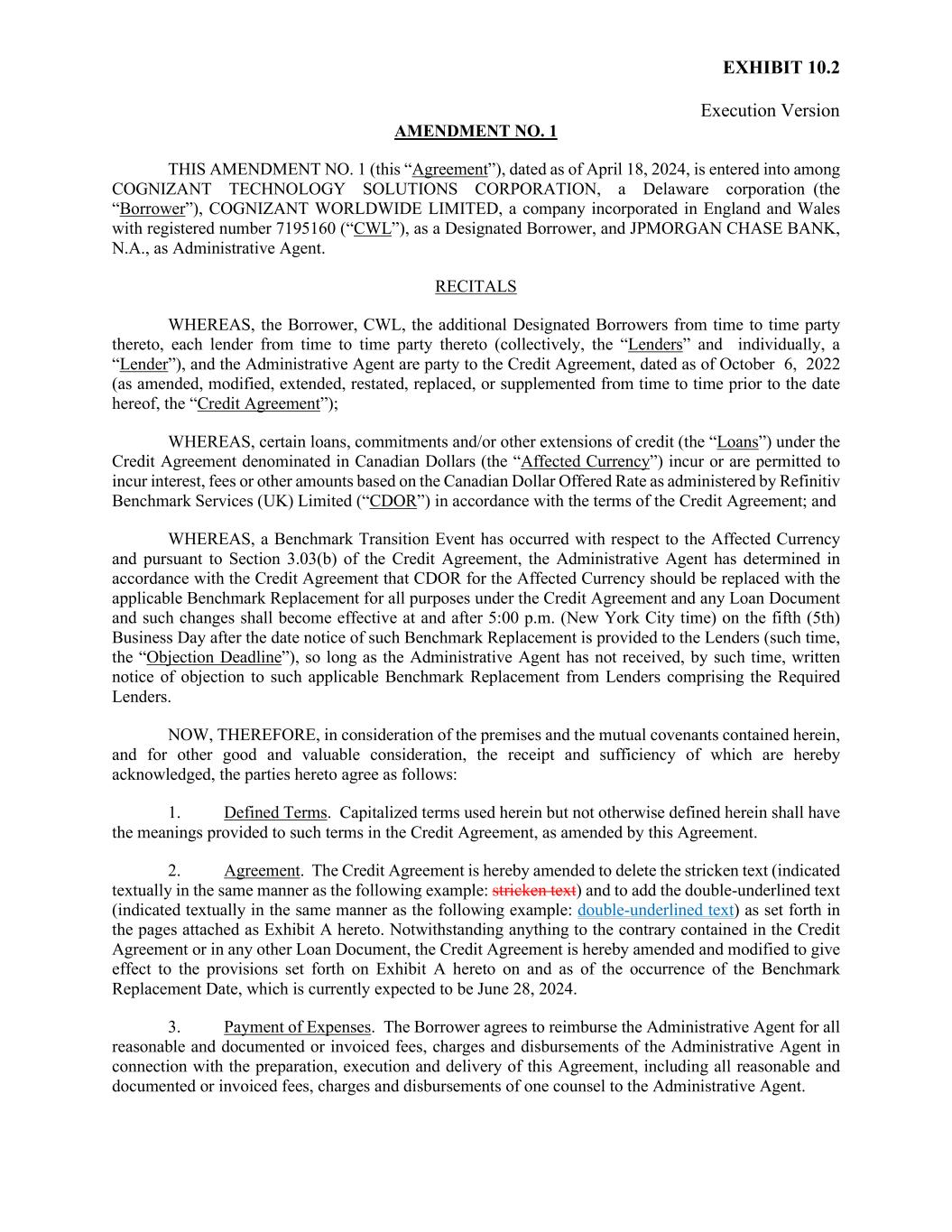 EXHIBIT 10.2 Execution Version AMENDMENT NO. 1 THIS AMENDMENT NO. 1 (this “Agreement”), dated as of April 18, 2024, is entered into among COGNIZANT TECHNOLOGY SOLUTIONS CORPORATION, a Delaware corporation (the “Borrower”), COGNIZANT WORLDWIDE LIMITED, a company incorporated in England and Wales with registered number 7195160 (“CWL”), as a Designated Borrower, and JPMORGAN CHASE BANK, N.A., as Administrative Agent. RECITALS WHEREAS, the Borrower, CWL, the additional Designated Borrowers from time to time party thereto, each lender from time to time party thereto (collectively, the “Lenders” and individually, a “Lender”), and the Administrative Agent are party to the Credit Agreement, dated as of October 6, 2022 (as amended, modified, extended, restated, replaced, or supplemented from time to time prior to the date hereof, the “Credit Agreement”); WHEREAS, certain loans, commitments and/or other extensions of credit (the “Loans”) under the Credit Agreement denominated in Canadian Dollars (the “Affected Currency”) incur or are permitted to incur interest, fees or other amounts based on the Canadian Dollar Offered Rate as administered by Refinitiv Benchmark Services (UK) Limited (“CDOR”) in accordance with the terms of the Credit Agreement; and WHEREAS, a Benchmark Transition Event has occurred with respect to the Affected Currency and pursuant to Section 3.03(b) of the Credit Agreement, the Administrative Agent has determined in accordance with the Credit Agreement that CDOR for the Affected Currency should be replaced with the applicable Benchmark Replacement for all purposes under the Credit Agreement and any Loan Document and such changes shall become effective at and after 5:00 p.m. (New York City time) on the fifth (5th) Business Day after the date notice of such Benchmark Replacement is provided to the Lenders (such time, the “Objection Deadline”), so long as the Administrative Agent has not received, by such time, written notice of objection to such applicable Benchmark Replacement from Lenders comprising the Required Lenders. NOW, THEREFORE, in consideration of the premises and the mutual covenants contained herein, and for other good and valuable consideration, the receipt and sufficiency of which are hereby acknowledged, the parties hereto agree as follows: 1. Defined Terms. Capitalized terms used herein but not otherwise defined herein shall have the meanings provided to such terms in the Credit Agreement, as amended by this Agreement. 2. Agreement. The Credit Agreement is hereby amended to delete the stricken text (indicated textually in the same manner as the following example: stricken text) and to add the double-underlined text (indicated textually in the same manner as the following example: double-underlined text) as set forth in the pages attached as Exhibit A hereto. Notwithstanding anything to the contrary contained in the Credit Agreement or in any other Loan Document, the Credit Agreement is hereby amended and modified to give effect to the provisions set forth on Exhibit A hereto on and as of the occurrence of the Benchmark Replacement Date, which is currently expected to be June 28, 2024. 3. Payment of Expenses. The Borrower agrees to reimburse the Administrative Agent for all reasonable and documented or invoiced fees, charges and disbursements of the Administrative Agent in connection with the preparation, execution and delivery of this Agreement, including all reasonable and documented or invoiced fees, charges and disbursements of one counsel to the Administrative Agent.