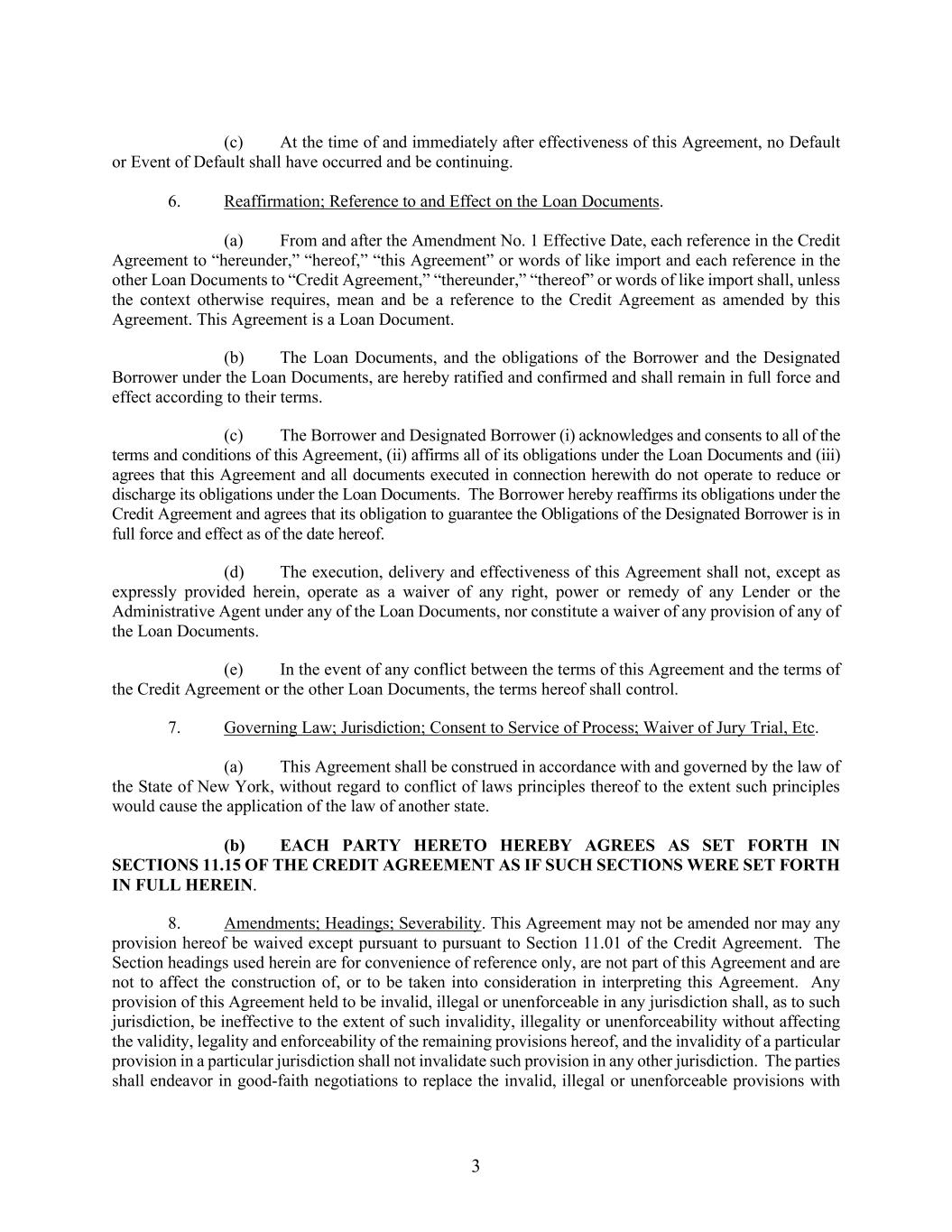 3 (c) At the time of and immediately after effectiveness of this Agreement, no Default or Event of Default shall have occurred and be continuing. 6. Reaffirmation; Reference to and Effect on the Loan Documents. (a) From and after the Amendment No. 1 Effective Date, each reference in the Credit Agreement to “hereunder,” “hereof,” “this Agreement” or words of like import and each reference in the other Loan Documents to “Credit Agreement,” “thereunder,” “thereof” or words of like import shall, unless the context otherwise requires, mean and be a reference to the Credit Agreement as amended by this Agreement. This Agreement is a Loan Document. (b) The Loan Documents, and the obligations of the Borrower and the Designated Borrower under the Loan Documents, are hereby ratified and confirmed and shall remain in full force and effect according to their terms. (c) The Borrower and Designated Borrower (i) acknowledges and consents to all of the terms and conditions of this Agreement, (ii) affirms all of its obligations under the Loan Documents and (iii) agrees that this Agreement and all documents executed in connection herewith do not operate to reduce or discharge its obligations under the Loan Documents. The Borrower hereby reaffirms its obligations under the Credit Agreement and agrees that its obligation to guarantee the Obligations of the Designated Borrower is in full force and effect as of the date hereof. (d) The execution, delivery and effectiveness of this Agreement shall not, except as expressly provided herein, operate as a waiver of any right, power or remedy of any Lender or the Administrative Agent under any of the Loan Documents, nor constitute a waiver of any provision of any of the Loan Documents. (e) In the event of any conflict between the terms of this Agreement and the terms of the Credit Agreement or the other Loan Documents, the terms hereof shall control. 7. Governing Law; Jurisdiction; Consent to Service of Process; Waiver of Jury Trial, Etc. (a) This Agreement shall be construed in accordance with and governed by the law of the State of New York, without regard to conflict of laws principles thereof to the extent such principles would cause the application of the law of another state. (b) EACH PARTY HERETO HEREBY AGREES AS SET FORTH IN SECTIONS 11.15 OF THE CREDIT AGREEMENT AS IF SUCH SECTIONS WERE SET FORTH IN FULL HEREIN. 8. Amendments; Headings; Severability. This Agreement may not be amended nor may any provision hereof be waived except pursuant to pursuant to Section 11.01 of the Credit Agreement. The Section headings used herein are for convenience of reference only, are not part of this Agreement and are not to affect the construction of, or to be taken into consideration in interpreting this Agreement. Any provision of this Agreement held to be invalid, illegal or unenforceable in any jurisdiction shall, as to such jurisdiction, be ineffective to the extent of such invalidity, illegality or unenforceability without affecting the validity, legality and enforceability of the remaining provisions hereof, and the invalidity of a particular provision in a particular jurisdiction shall not invalidate such provision in any other jurisdiction. The parties shall endeavor in good-faith negotiations to replace the invalid, illegal or unenforceable provisions with