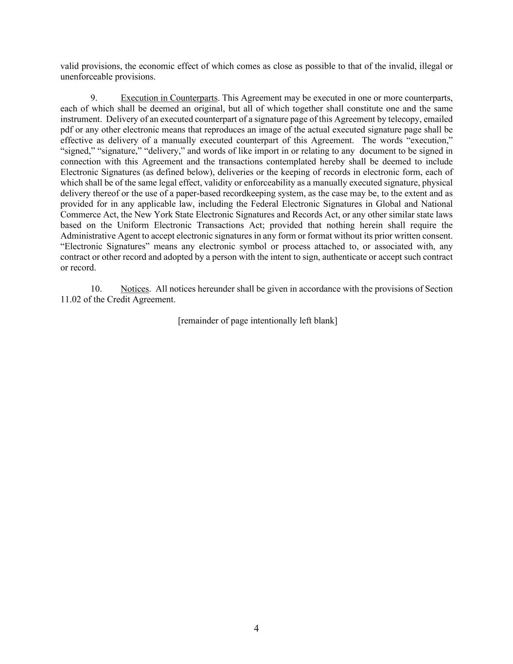 4 valid provisions, the economic effect of which comes as close as possible to that of the invalid, illegal or unenforceable provisions. 9. Execution in Counterparts. This Agreement may be executed in one or more counterparts, each of which shall be deemed an original, but all of which together shall constitute one and the same instrument. Delivery of an executed counterpart of a signature page of this Agreement by telecopy, emailed pdf or any other electronic means that reproduces an image of the actual executed signature page shall be effective as delivery of a manually executed counterpart of this Agreement. The words “execution,” “signed,” “signature,” “delivery,” and words of like import in or relating to any document to be signed in connection with this Agreement and the transactions contemplated hereby shall be deemed to include Electronic Signatures (as defined below), deliveries or the keeping of records in electronic form, each of which shall be of the same legal effect, validity or enforceability as a manually executed signature, physical delivery thereof or the use of a paper-based recordkeeping system, as the case may be, to the extent and as provided for in any applicable law, including the Federal Electronic Signatures in Global and National Commerce Act, the New York State Electronic Signatures and Records Act, or any other similar state laws based on the Uniform Electronic Transactions Act; provided that nothing herein shall require the Administrative Agent to accept electronic signatures in any form or format without its prior written consent. “Electronic Signatures” means any electronic symbol or process attached to, or associated with, any contract or other record and adopted by a person with the intent to sign, authenticate or accept such contract or record. 10. Notices. All notices hereunder shall be given in accordance with the provisions of Section 11.02 of the Credit Agreement. [remainder of page intentionally left blank]