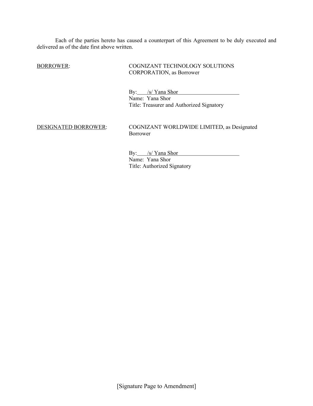 [Signature Page to Amendment] Each of the parties hereto has caused a counterpart of this Agreement to be duly executed and delivered as of the date first above written. BORROWER: COGNIZANT TECHNOLOGY SOLUTIONS CORPORATION, as Borrower By: /s/ Yana Shor Name: Yana Shor Title: Treasurer and Authorized Signatory DESIGNATED BORROWER: COGNIZANT WORLDWIDE LIMITED, as Designated Borrower By: /s/ Yana Shor Name: Yana Shor Title: Authorized Signatory