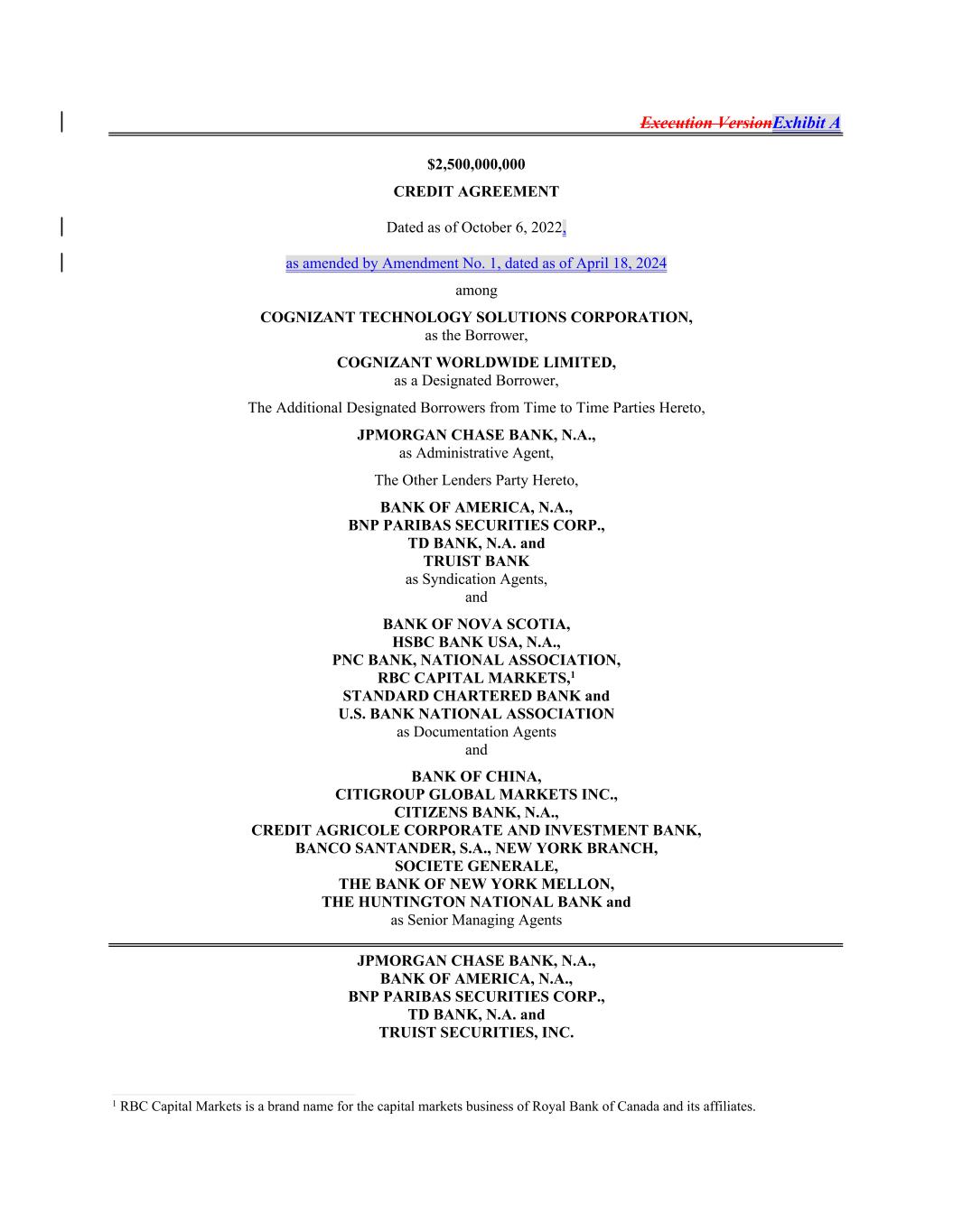 Execution VersionExhibit A $2,500,000,000 CREDIT AGREEMENT Dated as of October 6, 2022, as amended by Amendment No. 1, dated as of April 18, 2024 among COGNIZANT TECHNOLOGY SOLUTIONS CORPORATION, as the Borrower, COGNIZANT WORLDWIDE LIMITED, as a Designated Borrower, The Additional Designated Borrowers from Time to Time Parties Hereto, JPMORGAN CHASE BANK, N.A., as Administrative Agent, The Other Lenders Party Hereto, BANK OF AMERICA, N.A., BNP PARIBAS SECURITIES CORP., TD BANK, N.A. and TRUIST BANK as Syndication Agents, and BANK OF NOVA SCOTIA, HSBC BANK USA, N.A., PNC BANK, NATIONAL ASSOCIATION, RBC CAPITAL MARKETS,1 STANDARD CHARTERED BANK and U.S. BANK NATIONAL ASSOCIATION as Documentation Agents and BANK OF CHINA, CITIGROUP GLOBAL MARKETS INC., CITIZENS BANK, N.A., CREDIT AGRICOLE CORPORATE AND INVESTMENT BANK, BANCO SANTANDER, S.A., NEW YORK BRANCH, SOCIETE GENERALE, THE BANK OF NEW YORK MELLON, THE HUNTINGTON NATIONAL BANK and as Senior Managing Agents JPMORGAN CHASE BANK, N.A., BANK OF AMERICA, N.A., BNP PARIBAS SECURITIES CORP., TD BANK, N.A. and TRUIST SECURITIES, INC. 1 RBC Capital Markets is a brand name for the capital markets business of Royal Bank of Canada and its affiliates.