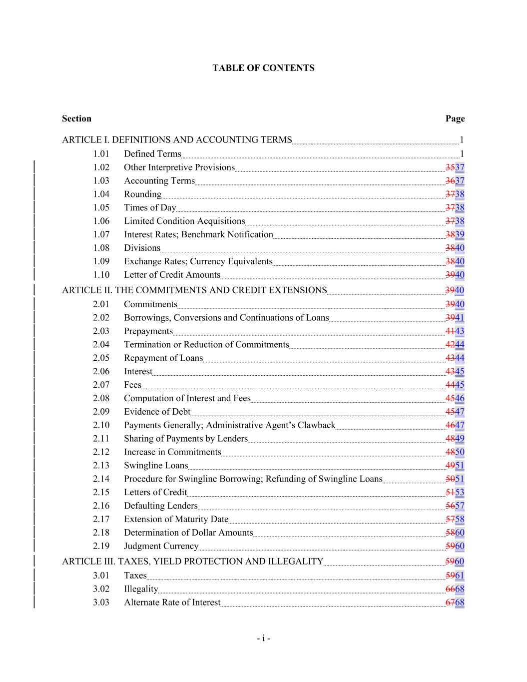 TABLE OF CONTENTS Section Page ARTICLE I. DEFINITIONS AND ACCOUNTING TERMS 1 1.01 Defined Terms 1 1.02 Other Interpretive Provisions 3537 1.03 Accounting Terms 3637 1.04 Rounding 3738 1.05 Times of Day 3738 1.06 Limited Condition Acquisitions 3738 1.07 Interest Rates; Benchmark Notification 3839 1.08 Divisions 3840 1.09 Exchange Rates; Currency Equivalents 3840 1.10 Letter of Credit Amounts 3940 ARTICLE II. THE COMMITMENTS AND CREDIT EXTENSIONS 3940 2.01 Commitments 3940 2.02 Borrowings, Conversions and Continuations of Loans 3941 2.03 Prepayments 4143 2.04 Termination or Reduction of Commitments 4244 2.05 Repayment of Loans 4344 2.06 Interest 4345 2.07 Fees 4445 2.08 Computation of Interest and Fees 4546 2.09 Evidence of Debt 4547 2.10 Payments Generally; Administrative Agent’s Clawback 4647 2.11 Sharing of Payments by Lenders 4849 2.12 Increase in Commitments 4850 2.13 Swingline Loans 4951 2.14 Procedure for Swingline Borrowing; Refunding of Swingline Loans 5051 2.15 Letters of Credit 5153 2.16 Defaulting Lenders 5657 2.17 Extension of Maturity Date 5758 2.18 Determination of Dollar Amounts 5860 2.19 Judgment Currency 5960 ARTICLE III. TAXES, YIELD PROTECTION AND ILLEGALITY 5960 3.01 Taxes 5961 3.02 Illegality 6668 3.03 Alternate Rate of Interest 6768 - i -