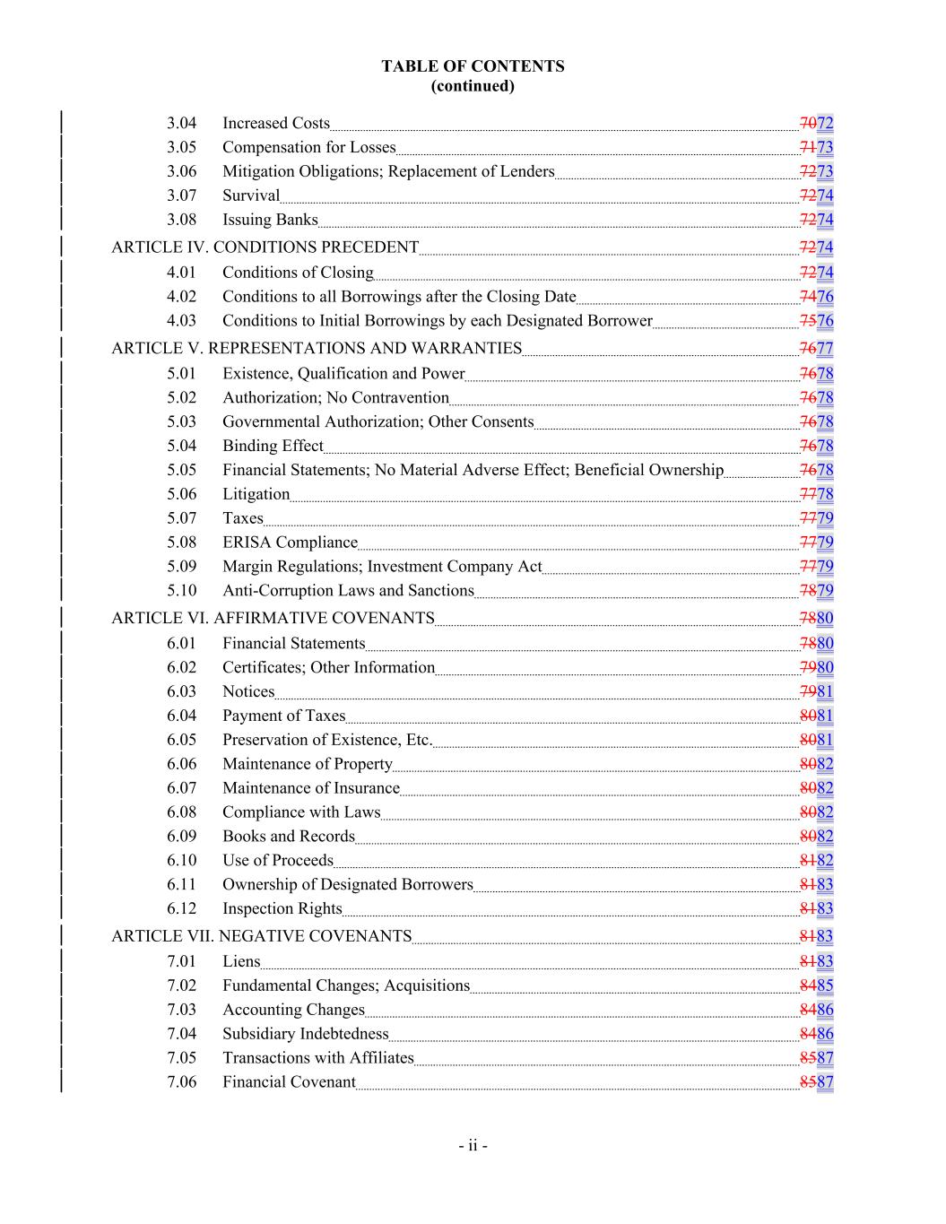 TABLE OF CONTENTS (continued) 3.04 Increased Costs 7072 3.05 Compensation for Losses 7173 3.06 Mitigation Obligations; Replacement of Lenders 7273 3.07 Survival 7274 3.08 Issuing Banks 7274 ARTICLE IV. CONDITIONS PRECEDENT 7274 4.01 Conditions of Closing 7274 4.02 Conditions to all Borrowings after the Closing Date 7476 4.03 Conditions to Initial Borrowings by each Designated Borrower 7576 ARTICLE V. REPRESENTATIONS AND WARRANTIES 7677 5.01 Existence, Qualification and Power 7678 5.02 Authorization; No Contravention 7678 5.03 Governmental Authorization; Other Consents 7678 5.04 Binding Effect 7678 5.05 Financial Statements; No Material Adverse Effect; Beneficial Ownership 7678 5.06 Litigation 7778 5.07 Taxes 7779 5.08 ERISA Compliance 7779 5.09 Margin Regulations; Investment Company Act 7779 5.10 Anti-Corruption Laws and Sanctions 7879 ARTICLE VI. AFFIRMATIVE COVENANTS 7880 6.01 Financial Statements 7880 6.02 Certificates; Other Information 7980 6.03 Notices 7981 6.04 Payment of Taxes 8081 6.05 Preservation of Existence, Etc. 8081 6.06 Maintenance of Property 8082 6.07 Maintenance of Insurance 8082 6.08 Compliance with Laws 8082 6.09 Books and Records 8082 6.10 Use of Proceeds 8182 6.11 Ownership of Designated Borrowers 8183 6.12 Inspection Rights 8183 ARTICLE VII. NEGATIVE COVENANTS 8183 7.01 Liens 8183 7.02 Fundamental Changes; Acquisitions 8485 7.03 Accounting Changes 8486 7.04 Subsidiary Indebtedness 8486 7.05 Transactions with Affiliates 8587 7.06 Financial Covenant 8587 - ii -