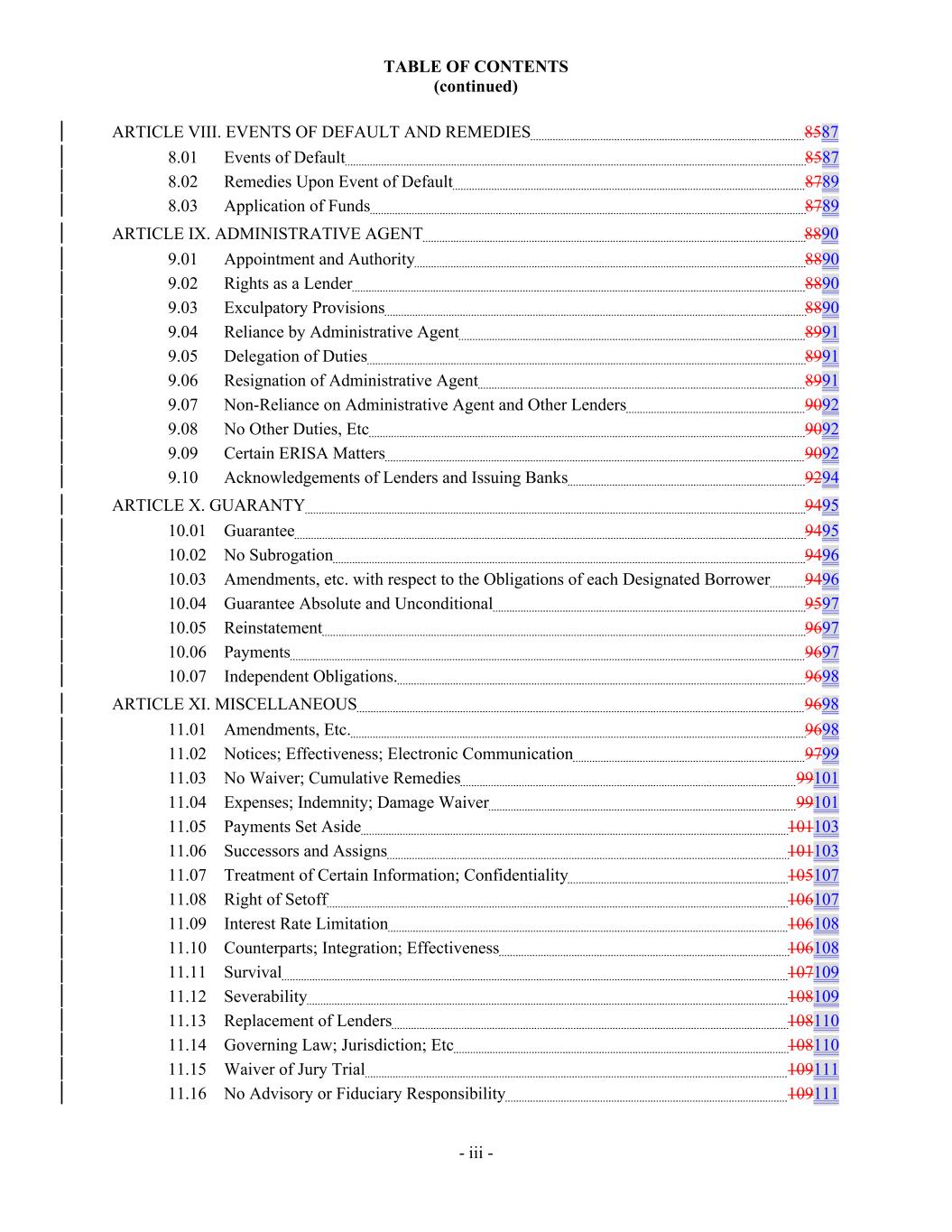 TABLE OF CONTENTS (continued) ARTICLE VIII. EVENTS OF DEFAULT AND REMEDIES 8587 8.01 Events of Default 8587 8.02 Remedies Upon Event of Default 8789 8.03 Application of Funds 8789 ARTICLE IX. ADMINISTRATIVE AGENT 8890 9.01 Appointment and Authority 8890 9.02 Rights as a Lender 8890 9.03 Exculpatory Provisions 8890 9.04 Reliance by Administrative Agent 8991 9.05 Delegation of Duties 8991 9.06 Resignation of Administrative Agent 8991 9.07 Non-Reliance on Administrative Agent and Other Lenders 9092 9.08 No Other Duties, Etc 9092 9.09 Certain ERISA Matters 9092 9.10 Acknowledgements of Lenders and Issuing Banks 9294 ARTICLE X. GUARANTY 9495 10.01 Guarantee 9495 10.02 No Subrogation 9496 10.03 Amendments, etc. with respect to the Obligations of each Designated Borrower 9496 10.04 Guarantee Absolute and Unconditional 9597 10.05 Reinstatement 9697 10.06 Payments 9697 10.07 Independent Obligations. 9698 ARTICLE XI. MISCELLANEOUS 9698 11.01 Amendments, Etc. 9698 11.02 Notices; Effectiveness; Electronic Communication 9799 11.03 No Waiver; Cumulative Remedies 99101 11.04 Expenses; Indemnity; Damage Waiver 99101 11.05 Payments Set Aside 101103 11.06 Successors and Assigns 101103 11.07 Treatment of Certain Information; Confidentiality 105107 11.08 Right of Setoff 106107 11.09 Interest Rate Limitation 106108 11.10 Counterparts; Integration; Effectiveness 106108 11.11 Survival 107109 11.12 Severability 108109 11.13 Replacement of Lenders 108110 11.14 Governing Law; Jurisdiction; Etc 108110 11.15 Waiver of Jury Trial 109111 11.16 No Advisory or Fiduciary Responsibility 109111 - iii -