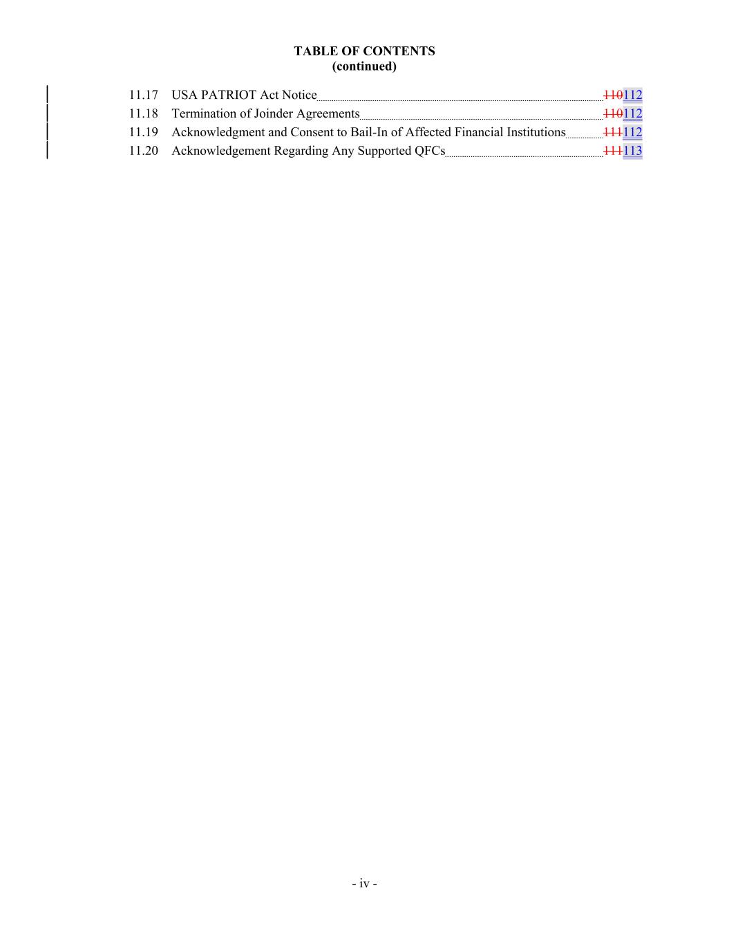 TABLE OF CONTENTS (continued) 11.17 USA PATRIOT Act Notice 110112 11.18 Termination of Joinder Agreements 110112 11.19 Acknowledgment and Consent to Bail-In of Affected Financial Institutions 111112 11.20 Acknowledgement Regarding Any Supported QFCs 111113 - iv -