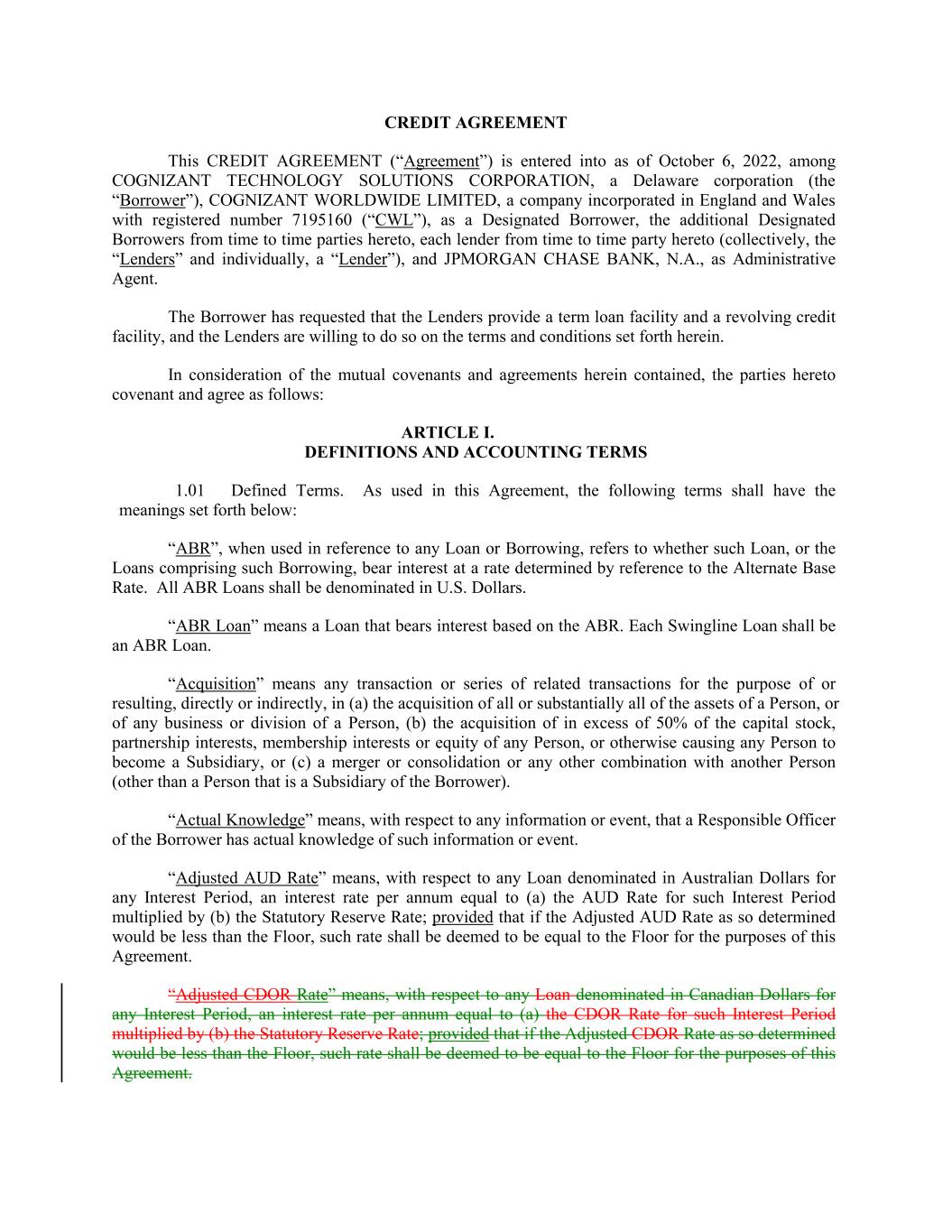 CREDIT AGREEMENT This CREDIT AGREEMENT (“Agreement”) is entered into as of October 6, 2022, among COGNIZANT TECHNOLOGY SOLUTIONS CORPORATION, a Delaware corporation (the “Borrower”), COGNIZANT WORLDWIDE LIMITED, a company incorporated in England and Wales with registered number 7195160 (“CWL”), as a Designated Borrower, the additional Designated Borrowers from time to time parties hereto, each lender from time to time party hereto (collectively, the “Lenders” and individually, a “Lender”), and JPMORGAN CHASE BANK, N.A., as Administrative Agent. The Borrower has requested that the Lenders provide a term loan facility and a revolving credit facility, and the Lenders are willing to do so on the terms and conditions set forth herein. In consideration of the mutual covenants and agreements herein contained, the parties hereto covenant and agree as follows: ARTICLE I. DEFINITIONS AND ACCOUNTING TERMS 1.01 Defined Terms. As used in this Agreement, the following terms shall have the meanings set forth below: “ABR”, when used in reference to any Loan or Borrowing, refers to whether such Loan, or the Loans comprising such Borrowing, bear interest at a rate determined by reference to the Alternate Base Rate. All ABR Loans shall be denominated in U.S. Dollars. “ABR Loan” means a Loan that bears interest based on the ABR. Each Swingline Loan shall be an ABR Loan. “Acquisition” means any transaction or series of related transactions for the purpose of or resulting, directly or indirectly, in (a) the acquisition of all or substantially all of the assets of a Person, or of any business or division of a Person, (b) the acquisition of in excess of 50% of the capital stock, partnership interests, membership interests or equity of any Person, or otherwise causing any Person to become a Subsidiary, or (c) a merger or consolidation or any other combination with another Person (other than a Person that is a Subsidiary of the Borrower). “Actual Knowledge” means, with respect to any information or event, that a Responsible Officer of the Borrower has actual knowledge of such information or event. “Adjusted AUD Rate” means, with respect to any Loan denominated in Australian Dollars for any Interest Period, an interest rate per annum equal to (a) the AUD Rate for such Interest Period multiplied by (b) the Statutory Reserve Rate; provided that if the Adjusted AUD Rate as so determined would be less than the Floor, such rate shall be deemed to be equal to the Floor for the purposes of this Agreement. “Adjusted CDOR Rate” means, with respect to any Loan denominated in Canadian Dollars for any Interest Period, an interest rate per annum equal to (a) the CDOR Rate for such Interest Period multiplied by (b) the Statutory Reserve Rate; provided that if the Adjusted CDOR Rate as so determined would be less than the Floor, such rate shall be deemed to be equal to the Floor for the purposes of this Agreement.