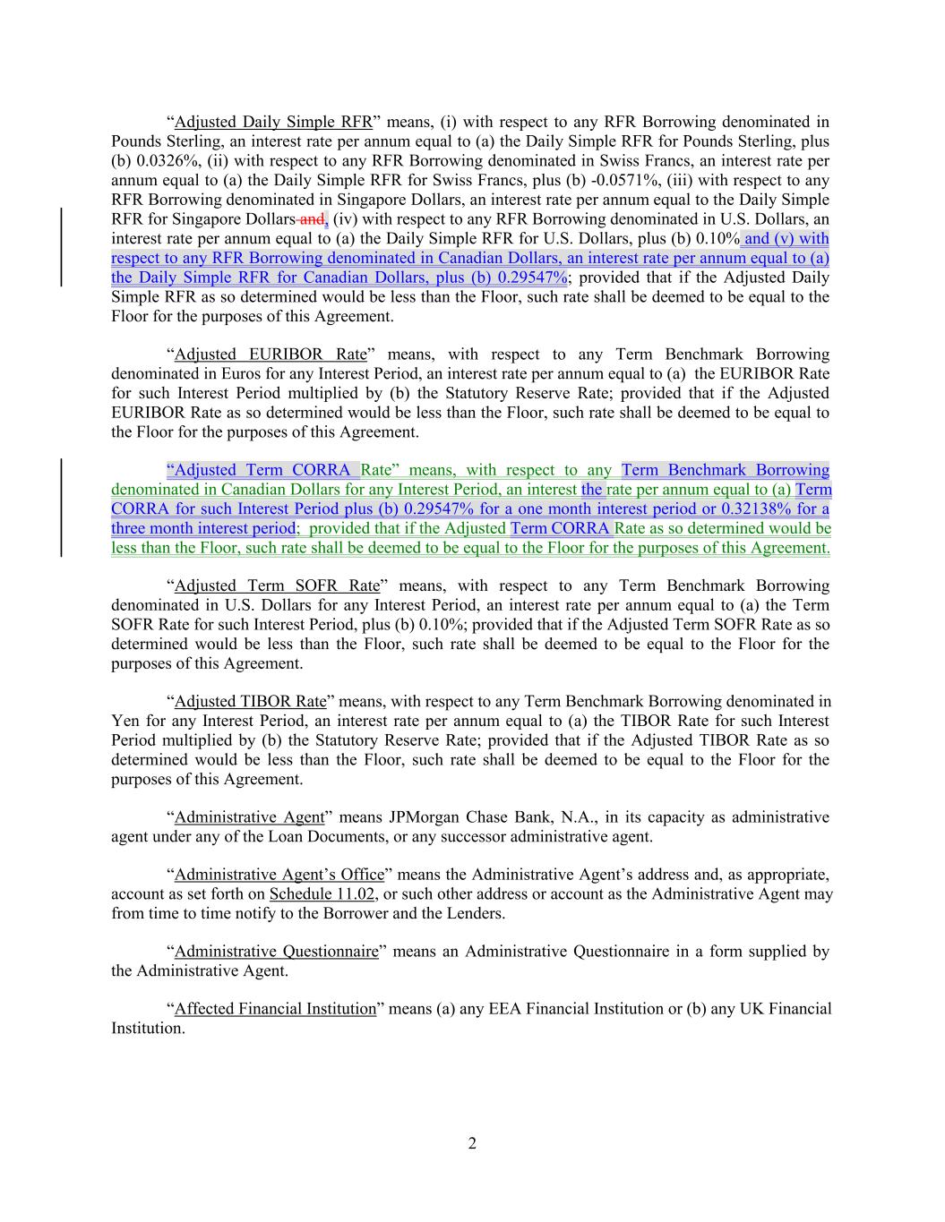 “Adjusted Daily Simple RFR” means, (i) with respect to any RFR Borrowing denominated in Pounds Sterling, an interest rate per annum equal to (a) the Daily Simple RFR for Pounds Sterling, plus (b) 0.0326%, (ii) with respect to any RFR Borrowing denominated in Swiss Francs, an interest rate per annum equal to (a) the Daily Simple RFR for Swiss Francs, plus (b) -0.0571%, (iii) with respect to any RFR Borrowing denominated in Singapore Dollars, an interest rate per annum equal to the Daily Simple RFR for Singapore Dollars and, (iv) with respect to any RFR Borrowing denominated in U.S. Dollars, an interest rate per annum equal to (a) the Daily Simple RFR for U.S. Dollars, plus (b) 0.10% and (v) with respect to any RFR Borrowing denominated in Canadian Dollars, an interest rate per annum equal to (a) the Daily Simple RFR for Canadian Dollars, plus (b) 0.29547%; provided that if the Adjusted Daily Simple RFR as so determined would be less than the Floor, such rate shall be deemed to be equal to the Floor for the purposes of this Agreement. “Adjusted EURIBOR Rate” means, with respect to any Term Benchmark Borrowing denominated in Euros for any Interest Period, an interest rate per annum equal to (a) the EURIBOR Rate for such Interest Period multiplied by (b) the Statutory Reserve Rate; provided that if the Adjusted EURIBOR Rate as so determined would be less than the Floor, such rate shall be deemed to be equal to the Floor for the purposes of this Agreement. “Adjusted Term CORRA Rate” means, with respect to any Term Benchmark Borrowing denominated in Canadian Dollars for any Interest Period, an interest the rate per annum equal to (a) Term CORRA for such Interest Period plus (b) 0.29547% for a one month interest period or 0.32138% for a three month interest period; provided that if the Adjusted Term CORRA Rate as so determined would be less than the Floor, such rate shall be deemed to be equal to the Floor for the purposes of this Agreement. “Adjusted Term SOFR Rate” means, with respect to any Term Benchmark Borrowing denominated in U.S. Dollars for any Interest Period, an interest rate per annum equal to (a) the Term SOFR Rate for such Interest Period, plus (b) 0.10%; provided that if the Adjusted Term SOFR Rate as so determined would be less than the Floor, such rate shall be deemed to be equal to the Floor for the purposes of this Agreement. “Adjusted TIBOR Rate” means, with respect to any Term Benchmark Borrowing denominated in Yen for any Interest Period, an interest rate per annum equal to (a) the TIBOR Rate for such Interest Period multiplied by (b) the Statutory Reserve Rate; provided that if the Adjusted TIBOR Rate as so determined would be less than the Floor, such rate shall be deemed to be equal to the Floor for the purposes of this Agreement. “Administrative Agent” means JPMorgan Chase Bank, N.A., in its capacity as administrative agent under any of the Loan Documents, or any successor administrative agent. “Administrative Agent’s Office” means the Administrative Agent’s address and, as appropriate, account as set forth on Schedule 11.02, or such other address or account as the Administrative Agent may from time to time notify to the Borrower and the Lenders. “Administrative Questionnaire” means an Administrative Questionnaire in a form supplied by the Administrative Agent. “Affected Financial Institution” means (a) any EEA Financial Institution or (b) any UK Financial Institution. 2