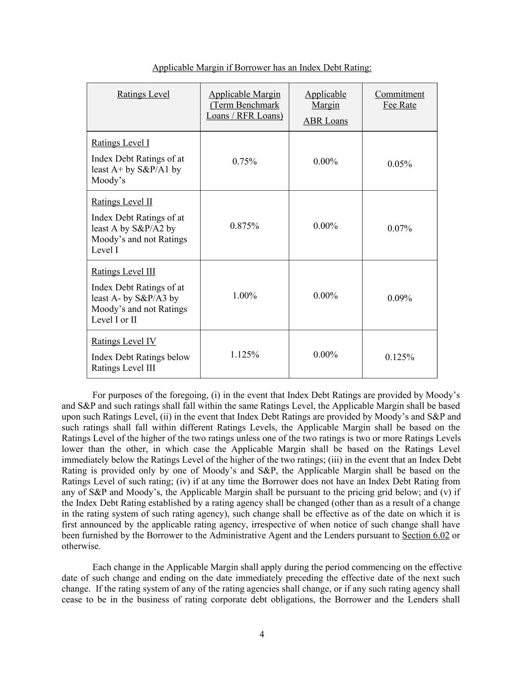 4 Commitment Fee Rate 0.875% 0.00% 0.07% Ratings Level Ratings Level I Index Debt Ratings of at least A+ by S&P/A1 by Moody’s Ratings Level III Index Debt Ratings of at least A- by S&P/A3 by Moody’s and not Ratings Level I or II 1.00% 0.75% 0.00% Applicable Margin (Term Benchmark Loans / RFR Loans) 0.09% 0.00% Applicable Margin if Borrower has an Index Debt Rating: Ratings Level IV Index Debt Ratings below Ratings Level III 0.05% 1.125% Applicable Margin ABR Loans 0.00% 0.125% For purposes of the foregoing, (i) in the event that Index Debt Ratings are provided by Moody’s and S&P and such ratings shall fall within the same Ratings Level, the Applicable Margin shall be based upon such Ratings Level, (ii) in the event that Index Debt Ratings are provided by Moody’s and S&P and such ratings shall fall within different Ratings Levels, the Applicable Margin shall be based on the Ratings Level of the higher of the two ratings unless one of the two ratings is two or more Ratings Levels lower than the other, in which case the Applicable Margin shall be based on the Ratings Level immediately below the Ratings Level of the higher of the two ratings; (iii) in the event that an Index Debt Rating is provided only by one of Moody’s and S&P, the Applicable Margin shall be based on the Ratings Level of such rating; (iv) if at any time the Borrower does not have an Index Debt Rating from any of S&P and Moody’s, the Applicable Margin shall be pursuant to the pricing grid below; and (v) if the Index Debt Rating established by a rating agency shall be changed (other than as a result of a change in the rating system of such rating agency), such change shall be effective as of the date on which it is first announced by the applicable rating agency, irrespective of when notice of such change shall have been furnished by the Borrower to the Administrative Agent and the Lenders pursuant to Section 6.02 or otherwise. Each change in the Applicable Margin shall apply during the period commencing on the effective date of such change and ending on the date immediately preceding the effective date of the next such change. If the rating system of any of the rating agencies shall change, or if any such rating agency shall cease to be in the business of rating corporate debt obligations, the Borrower and the Lenders shall Ratings Level II Index Debt Ratings of at least A by S&P/A2 by Moody’s and not Ratings Level I