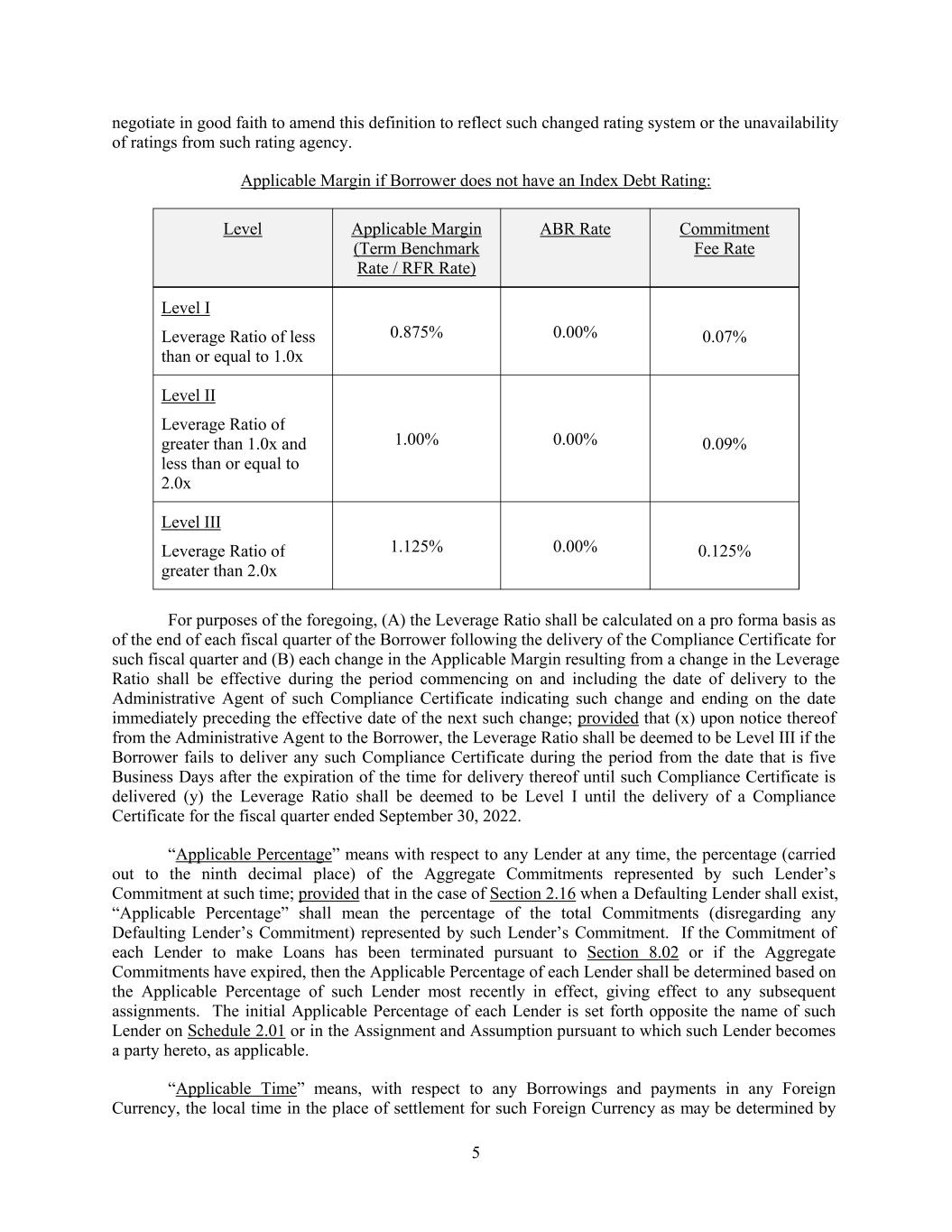 5 0.07% ABR Rate Level II Leverage Ratio of greater than 1.0x and less than or equal to 2.0x Commitment Fee Rate 1.00% 0.00% 0.09% Level Level I Leverage Ratio of less than or equal to 1.0x Level III Leverage Ratio of greater than 2.0x 1.125% 0.875% 0.00% Applicable Margin (Term Benchmark Rate / RFR Rate) 0.125% 0.00% For purposes of the foregoing, (A) the Leverage Ratio shall be calculated on a pro forma basis as of the end of each fiscal quarter of the Borrower following the delivery of the Compliance Certificate for such fiscal quarter and (B) each change in the Applicable Margin resulting from a change in the Leverage Ratio shall be effective during the period commencing on and including the date of delivery to the Administrative Agent of such Compliance Certificate indicating such change and ending on the date immediately preceding the effective date of the next such change; provided that (x) upon notice thereof from the Administrative Agent to the Borrower, the Leverage Ratio shall be deemed to be Level III if the Borrower fails to deliver any such Compliance Certificate during the period from the date that is five Business Days after the expiration of the time for delivery thereof until such Compliance Certificate is delivered (y) the Leverage Ratio shall be deemed to be Level I until the delivery of a Compliance Certificate for the fiscal quarter ended September 30, 2022. “Applicable Percentage” means with respect to any Lender at any time, the percentage (carried out to the ninth decimal place) of the Aggregate Commitments represented by such Lender’s Commitment at such time; provided that in the case of Section 2.16 when a Defaulting Lender shall exist, “Applicable Percentage” shall mean the percentage of the total Commitments (disregarding any Defaulting Lender’s Commitment) represented by such Lender’s Commitment. If the Commitment of each Lender to make Loans has been terminated pursuant to Section 8.02 or if the Aggregate Commitments have expired, then the Applicable Percentage of each Lender shall be determined based on the Applicable Percentage of such Lender most recently in effect, giving effect to any subsequent assignments. The initial Applicable Percentage of each Lender is set forth opposite the name of such Lender on Schedule 2.01 or in the Assignment and Assumption pursuant to which such Lender becomes a party hereto, as applicable. “Applicable Time” means, with respect to any Borrowings and payments in any Foreign Currency, the local time in the place of settlement for such Foreign Currency as may be determined by negotiate in good faith to amend this definition to reflect such changed rating system or the unavailability of ratings from such rating agency. Applicable Margin if Borrower does not have an Index Debt Rating: