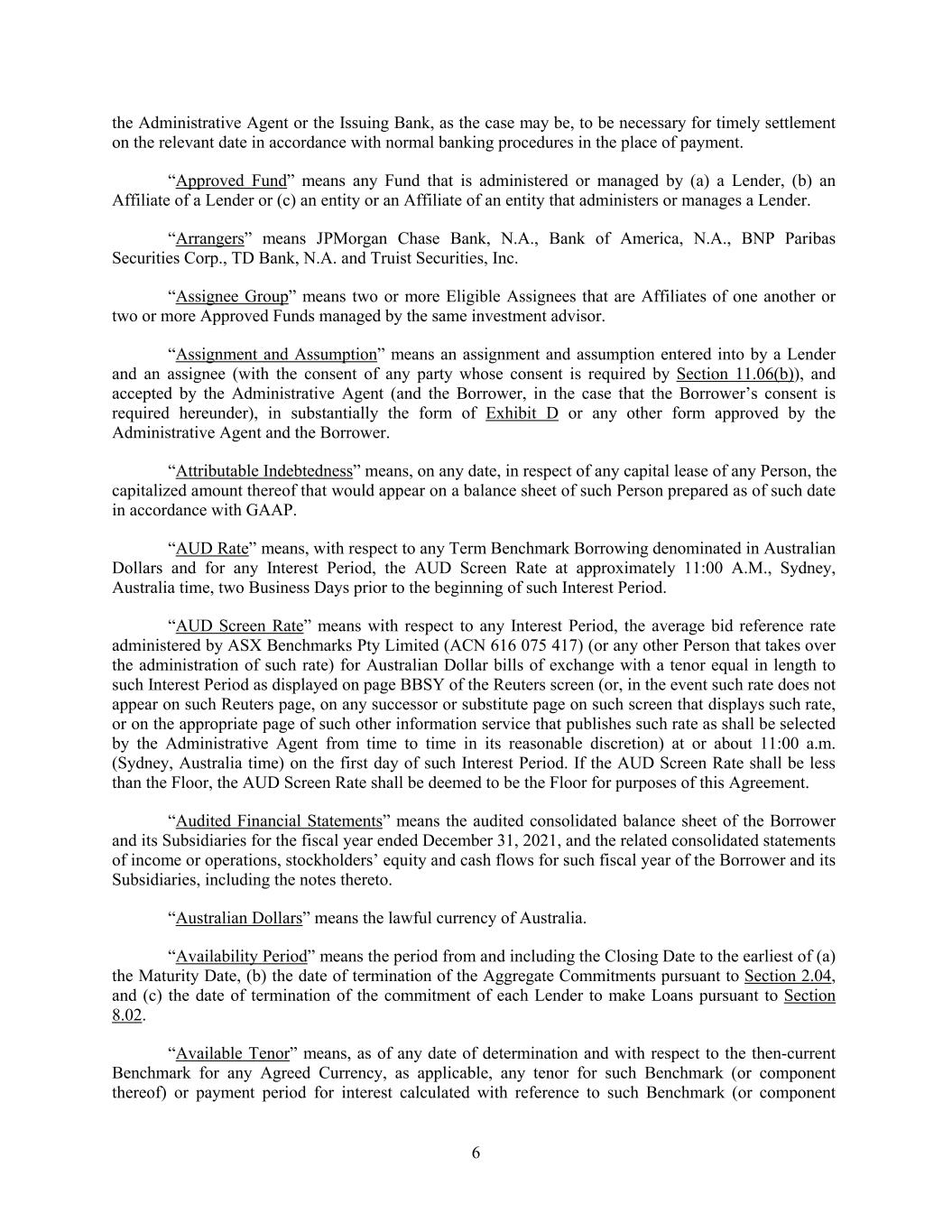 the Administrative Agent or the Issuing Bank, as the case may be, to be necessary for timely settlement on the relevant date in accordance with normal banking procedures in the place of payment. “Approved Fund” means any Fund that is administered or managed by (a) a Lender, (b) an Affiliate of a Lender or (c) an entity or an Affiliate of an entity that administers or manages a Lender. “Arrangers” means JPMorgan Chase Bank, N.A., Bank of America, N.A., BNP Paribas Securities Corp., TD Bank, N.A. and Truist Securities, Inc. “Assignee Group” means two or more Eligible Assignees that are Affiliates of one another or two or more Approved Funds managed by the same investment advisor. “Assignment and Assumption” means an assignment and assumption entered into by a Lender and an assignee (with the consent of any party whose consent is required by Section 11.06(b)), and accepted by the Administrative Agent (and the Borrower, in the case that the Borrower’s consent is required hereunder), in substantially the form of Exhibit D or any other form approved by the Administrative Agent and the Borrower. “Attributable Indebtedness” means, on any date, in respect of any capital lease of any Person, the capitalized amount thereof that would appear on a balance sheet of such Person prepared as of such date in accordance with GAAP. “AUD Rate” means, with respect to any Term Benchmark Borrowing denominated in Australian Dollars and for any Interest Period, the AUD Screen Rate at approximately 11:00 A.M., Sydney, Australia time, two Business Days prior to the beginning of such Interest Period. “AUD Screen Rate” means with respect to any Interest Period, the average bid reference rate administered by ASX Benchmarks Pty Limited (ACN 616 075 417) (or any other Person that takes over the administration of such rate) for Australian Dollar bills of exchange with a tenor equal in length to such Interest Period as displayed on page BBSY of the Reuters screen (or, in the event such rate does not appear on such Reuters page, on any successor or substitute page on such screen that displays such rate, or on the appropriate page of such other information service that publishes such rate as shall be selected by the Administrative Agent from time to time in its reasonable discretion) at or about 11:00 a.m. (Sydney, Australia time) on the first day of such Interest Period. If the AUD Screen Rate shall be less than the Floor, the AUD Screen Rate shall be deemed to be the Floor for purposes of this Agreement. “Audited Financial Statements” means the audited consolidated balance sheet of the Borrower and its Subsidiaries for the fiscal year ended December 31, 2021, and the related consolidated statements of income or operations, stockholders’ equity and cash flows for such fiscal year of the Borrower and its Subsidiaries, including the notes thereto. “Australian Dollars” means the lawful currency of Australia. “Availability Period” means the period from and including the Closing Date to the earliest of (a) the Maturity Date, (b) the date of termination of the Aggregate Commitments pursuant to Section 2.04, and (c) the date of termination of the commitment of each Lender to make Loans pursuant to Section 8.02. “Available Tenor” means, as of any date of determination and with respect to the then-current Benchmark for any Agreed Currency, as applicable, any tenor for such Benchmark (or component thereof) or payment period for interest calculated with reference to such Benchmark (or component 6
