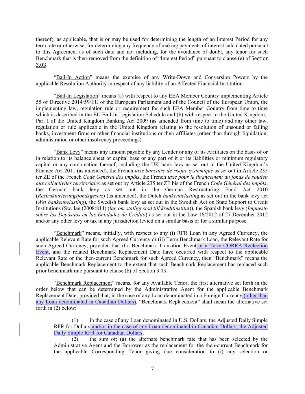 thereof), as applicable, that is or may be used for determining the length of an Interest Period for any term rate or otherwise, for determining any frequency of making payments of interest calculated pursuant to this Agreement as of such date and not including, for the avoidance of doubt, any tenor for such Benchmark that is then-removed from the definition of “Interest Period” pursuant to clause (e) of Section 3.03. “Bail-In Action” means the exercise of any Write-Down and Conversion Powers by the applicable Resolution Authority in respect of any liability of an Affected Financial Institution. “Bail-In Legislation” means (a) with respect to any EEA Member Country implementing Article 55 of Directive 2014/59/EU of the European Parliament and of the Council of the European Union, the implementing law, regulation rule or requirement for such EEA Member Country from time to time which is described in the EU Bail-In Legislation Schedule and (b) with respect to the United Kingdom, Part I of the United Kingdom Banking Act 2009 (as amended from time to time) and any other law, regulation or rule applicable in the United Kingdom relating to the resolution of unsound or failing banks, investment firms or other financial institutions or their affiliates (other than through liquidation, administration or other insolvency proceedings). “Bank Levy” means any amount payable by any Lender or any of its Affiliates on the basis of or in relation to its balance sheet or capital base or any part of it or its liabilities or minimum regulatory capital or any combination thereof, including the UK bank levy as set out in the United Kingdom’s Finance Act 2011 (as amended), the French taxe bancaire de risque systémique as set out in Article 235 ter ZE of the French Code Général des impôts, the French taxe pour le financement du fonds de soutien aux collectivités territoriales as set out by Article 235 ter ZE bis of the French Code Général des impôts, the German bank levy as set out in the German Restructuring Fund Act 2010 (Restrukturierungsfondsgesetz) (as amended), the Dutch bankenbelasting as set out in the bank levy act (Wet bankenbelasting), the Swedish bank levy as set out in the Swedish Act on State Support to Credit Institutions (Sw. lag (2008:814) (lag om statligt stöd till kreditinstitut)), the Spanish bank levy (Impuesto sobre los Depósitos en las Entidades de Crédito) as set out in the Law 16/2012 of 27 December 2012 and/or any other levy or tax in any jurisdiction levied on a similar basis or for a similar purpose. “Benchmark” means, initially, with respect to any (i) RFR Loan in any Agreed Currency, the applicable Relevant Rate for such Agreed Currency or (ii) Term Benchmark Loan, the Relevant Rate for such Agreed Currency; provided that if a Benchmark Transition Event or a Term CORRA Reelection Event, and the related Benchmark Replacement Date have occurred with respect to the applicable Relevant Rate or the then-current Benchmark for such Agreed Currency, then “Benchmark” means the applicable Benchmark Replacement to the extent that such Benchmark Replacement has replaced such prior benchmark rate pursuant to clause (b) of Section 3.03. “Benchmark Replacement” means, for any Available Tenor, the first alternative set forth in the order below that can be determined by the Administrative Agent for the applicable Benchmark Replacement Date; provided that, in the case of any Loan denominated in a Foreign Currency (other than any Loan denominated in Canadian Dollars), “Benchmark Replacement” shall mean the alternative set forth in (2) below: (1) in the case of any Loan denominated in U.S. Dollars, the Adjusted Daily Simple RFR for Dollars and/or in the case of any Loan denominated in Canadian Dollars, the Adjusted Daily Simple RFR for Canadian Dollars; (2) the sum of: (a) the alternate benchmark rate that has been selected by the Administrative Agent and the Borrower as the replacement for the then-current Benchmark for the applicable Corresponding Tenor giving due consideration to (i) any selection or 7