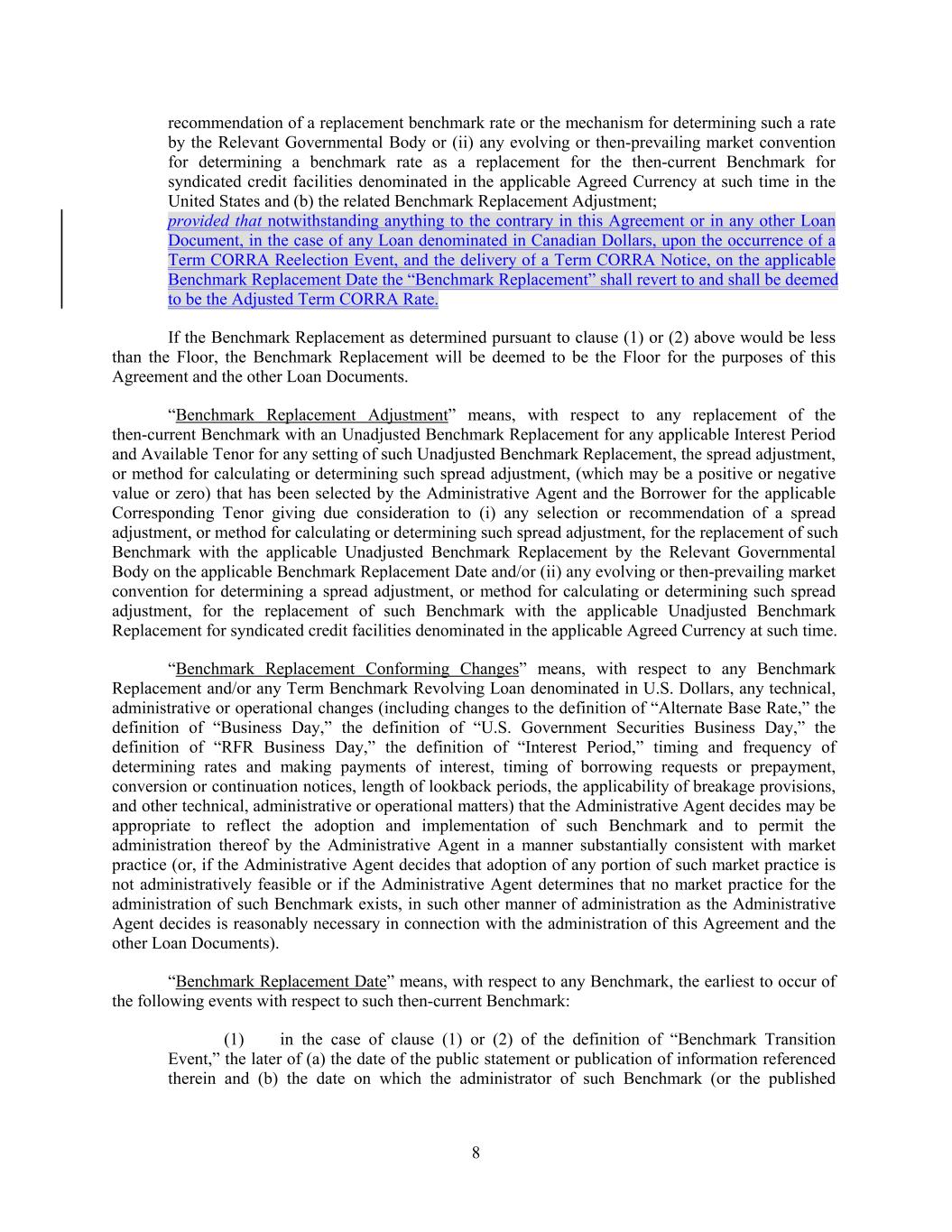 recommendation of a replacement benchmark rate or the mechanism for determining such a rate by the Relevant Governmental Body or (ii) any evolving or then-prevailing market convention for determining a benchmark rate as a replacement for the then-current Benchmark for syndicated credit facilities denominated in the applicable Agreed Currency at such time in the United States and (b) the related Benchmark Replacement Adjustment; provided that notwithstanding anything to the contrary in this Agreement or in any other Loan Document, in the case of any Loan denominated in Canadian Dollars, upon the occurrence of a Term CORRA Reelection Event, and the delivery of a Term CORRA Notice, on the applicable Benchmark Replacement Date the “Benchmark Replacement” shall revert to and shall be deemed to be the Adjusted Term CORRA Rate. If the Benchmark Replacement as determined pursuant to clause (1) or (2) above would be less than the Floor, the Benchmark Replacement will be deemed to be the Floor for the purposes of this Agreement and the other Loan Documents. “Benchmark Replacement Adjustment” means, with respect to any replacement of the then-current Benchmark with an Unadjusted Benchmark Replacement for any applicable Interest Period and Available Tenor for any setting of such Unadjusted Benchmark Replacement, the spread adjustment, or method for calculating or determining such spread adjustment, (which may be a positive or negative value or zero) that has been selected by the Administrative Agent and the Borrower for the applicable Corresponding Tenor giving due consideration to (i) any selection or recommendation of a spread adjustment, or method for calculating or determining such spread adjustment, for the replacement of such Benchmark with the applicable Unadjusted Benchmark Replacement by the Relevant Governmental Body on the applicable Benchmark Replacement Date and/or (ii) any evolving or then-prevailing market convention for determining a spread adjustment, or method for calculating or determining such spread adjustment, for the replacement of such Benchmark with the applicable Unadjusted Benchmark Replacement for syndicated credit facilities denominated in the applicable Agreed Currency at such time. “Benchmark Replacement Conforming Changes” means, with respect to any Benchmark Replacement and/or any Term Benchmark Revolving Loan denominated in U.S. Dollars, any technical, administrative or operational changes (including changes to the definition of “Alternate Base Rate,” the definition of “Business Day,” the definition of “U.S. Government Securities Business Day,” the definition of “RFR Business Day,” the definition of “Interest Period,” timing and frequency of determining rates and making payments of interest, timing of borrowing requests or prepayment, conversion or continuation notices, length of lookback periods, the applicability of breakage provisions, and other technical, administrative or operational matters) that the Administrative Agent decides may be appropriate to reflect the adoption and implementation of such Benchmark and to permit the administration thereof by the Administrative Agent in a manner substantially consistent with market practice (or, if the Administrative Agent decides that adoption of any portion of such market practice is not administratively feasible or if the Administrative Agent determines that no market practice for the administration of such Benchmark exists, in such other manner of administration as the Administrative Agent decides is reasonably necessary in connection with the administration of this Agreement and the other Loan Documents). “Benchmark Replacement Date” means, with respect to any Benchmark, the earliest to occur of the following events with respect to such then-current Benchmark: (1) in the case of clause (1) or (2) of the definition of “Benchmark Transition Event,” the later of (a) the date of the public statement or publication of information referenced therein and (b) the date on which the administrator of such Benchmark (or the published 8