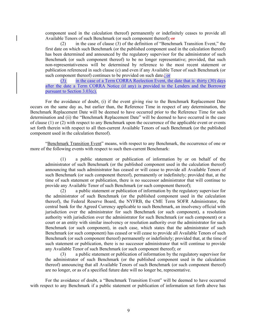 component used in the calculation thereof) permanently or indefinitely ceases to provide all Available Tenors of such Benchmark (or such component thereof); or (2) in the case of clause (3) of the definition of “Benchmark Transition Event,” the first date on which such Benchmark (or the published component used in the calculation thereof) has been determined and announced by the regulatory supervisor for the administrator of such Benchmark (or such component thereof) to be no longer representative; provided, that such non-representativeness will be determined by reference to the most recent statement or publication referenced in such clause (c) and even if any Available Tenor of such Benchmark (or such component thereof) continues to be provided on such date.; or (3) in the case of a Term CORRA Reelection Event, the date that is thirty (30) days after the date a Term CORRA Notice (if any) is provided to the Lenders and the Borrower pursuant to Section 3.03(c). For the avoidance of doubt, (i) if the event giving rise to the Benchmark Replacement Date occurs on the same day as, but earlier than, the Reference Time in respect of any determination, the Benchmark Replacement Date will be deemed to have occurred prior to the Reference Time for such determination and (ii) the “Benchmark Replacement Date” will be deemed to have occurred in the case of clause (1) or (2) with respect to any Benchmark upon the occurrence of the applicable event or events set forth therein with respect to all then-current Available Tenors of such Benchmark (or the published component used in the calculation thereof). “Benchmark Transition Event” means, with respect to any Benchmark, the occurrence of one or more of the following events with respect to such then-current Benchmark: (1) a public statement or publication of information by or on behalf of the administrator of such Benchmark (or the published component used in the calculation thereof) announcing that such administrator has ceased or will cease to provide all Available Tenors of such Benchmark (or such component thereof), permanently or indefinitely; provided that, at the time of such statement or publication, there is no successor administrator that will continue to provide any Available Tenor of such Benchmark (or such component thereof); (2) a public statement or publication of information by the regulatory supervisor for the administrator of such Benchmark (or the published component used in the calculation thereof), the Federal Reserve Board, the NYFRB, the CME Term SOFR Administrator, the central bank for the Agreed Currency applicable to such Benchmark, an insolvency official with jurisdiction over the administrator for such Benchmark (or such component), a resolution authority with jurisdiction over the administrator for such Benchmark (or such component) or a court or an entity with similar insolvency or resolution authority over the administrator for such Benchmark (or such component), in each case, which states that the administrator of such Benchmark (or such component) has ceased or will cease to provide all Available Tenors of such Benchmark (or such component thereof) permanently or indefinitely; provided that, at the time of such statement or publication, there is no successor administrator that will continue to provide any Available Tenor of such Benchmark (or such component thereof); or (3) a public statement or publication of information by the regulatory supervisor for the administrator of such Benchmark (or the published component used in the calculation thereof) announcing that all Available Tenors of such Benchmark (or such component thereof) are no longer, or as of a specified future date will no longer be, representative. For the avoidance of doubt, a “Benchmark Transition Event” will be deemed to have occurred with respect to any Benchmark if a public statement or publication of information set forth above has 9
