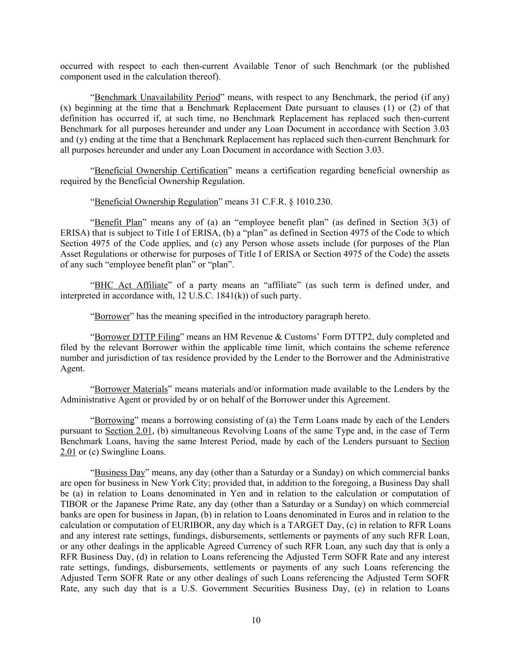 occurred with respect to each then-current Available Tenor of such Benchmark (or the published component used in the calculation thereof). “Benchmark Unavailability Period” means, with respect to any Benchmark, the period (if any) (x) beginning at the time that a Benchmark Replacement Date pursuant to clauses (1) or (2) of that definition has occurred if, at such time, no Benchmark Replacement has replaced such then-current Benchmark for all purposes hereunder and under any Loan Document in accordance with Section 3.03 and (y) ending at the time that a Benchmark Replacement has replaced such then-current Benchmark for all purposes hereunder and under any Loan Document in accordance with Section 3.03. “Beneficial Ownership Certification” means a certification regarding beneficial ownership as required by the Beneficial Ownership Regulation. “Beneficial Ownership Regulation” means 31 C.F.R. § 1010.230. “Benefit Plan” means any of (a) an “employee benefit plan” (as defined in Section 3(3) of ERISA) that is subject to Title I of ERISA, (b) a “plan” as defined in Section 4975 of the Code to which Section 4975 of the Code applies, and (c) any Person whose assets include (for purposes of the Plan Asset Regulations or otherwise for purposes of Title I of ERISA or Section 4975 of the Code) the assets of any such “employee benefit plan” or “plan”. “BHC Act Affiliate” of a party means an “affiliate” (as such term is defined under, and interpreted in accordance with, 12 U.S.C. 1841(k)) of such party. “Borrower” has the meaning specified in the introductory paragraph hereto. “Borrower DTTP Filing” means an HM Revenue & Customs’ Form DTTP2, duly completed and filed by the relevant Borrower within the applicable time limit, which contains the scheme reference number and jurisdiction of tax residence provided by the Lender to the Borrower and the Administrative Agent. “Borrower Materials” means materials and/or information made available to the Lenders by the Administrative Agent or provided by or on behalf of the Borrower under this Agreement. “Borrowing” means a borrowing consisting of (a) the Term Loans made by each of the Lenders pursuant to Section 2.01, (b) simultaneous Revolving Loans of the same Type and, in the case of Term Benchmark Loans, having the same Interest Period, made by each of the Lenders pursuant to Section 2.01 or (c) Swingline Loans. “Business Day” means, any day (other than a Saturday or a Sunday) on which commercial banks are open for business in New York City; provided that, in addition to the foregoing, a Business Day shall be (a) in relation to Loans denominated in Yen and in relation to the calculation or computation of TIBOR or the Japanese Prime Rate, any day (other than a Saturday or a Sunday) on which commercial banks are open for business in Japan, (b) in relation to Loans denominated in Euros and in relation to the calculation or computation of EURIBOR, any day which is a TARGET Day, (c) in relation to RFR Loans and any interest rate settings, fundings, disbursements, settlements or payments of any such RFR Loan, or any other dealings in the applicable Agreed Currency of such RFR Loan, any such day that is only a RFR Business Day, (d) in relation to Loans referencing the Adjusted Term SOFR Rate and any interest rate settings, fundings, disbursements, settlements or payments of any such Loans referencing the Adjusted Term SOFR Rate or any other dealings of such Loans referencing the Adjusted Term SOFR Rate, any such day that is a U.S. Government Securities Business Day, (e) in relation to Loans 10