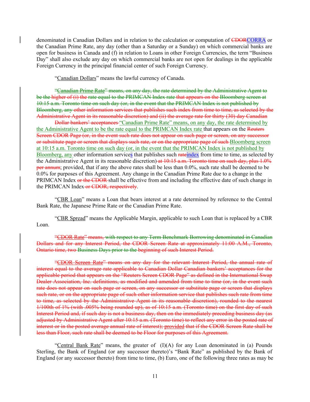 denominated in Canadian Dollars and in relation to the calculation or computation of CDORCORRA or the Canadian Prime Rate, any day (other than a Saturday or a Sunday) on which commercial banks are open for business in Canada and (f) in relation to Loans in other Foreign Currencies, the term “Business Day” shall also exclude any day on which commercial banks are not open for dealings in the applicable Foreign Currency in the principal financial center of such Foreign Currency. “Canadian Dollars” means the lawful currency of Canada. “Canadian Prime Rate” means, on any day, the rate determined by the Administrative Agent to be the higher of (i) the rate equal to the PRIMCAN Index rate that appears on the Bloomberg screen at 10:15 a.m. Toronto time on such day (or, in the event that the PRIMCAN Index is not published by Bloomberg, any other information services that publishes such index from time to time, as selected by the Administrative Agent in its reasonable discretion) and (ii) the average rate for thirty (30) day Canadian Dollar bankers’ acceptances “Canadian Prime Rate” means, on any day, the rate determined by the Administrative Agent to be the rate equal to the PRIMCAN Index rate that appears on the Reuters Screen CDOR Page (or, in the event such rate does not appear on such page or screen, on any successor or substitute page or screen that displays such rate, or on the appropriate page of such Bloomberg screen at 10:15 a.m. Toronto time on such day (or, in the event that the PRIMCAN Index is not published by Bloomberg, any other information services that publishes such rateindex from time to time, as selected by the Administrative Agent in its reasonable discretion) at 10:15 a.m. Toronto time on such day, plus 1.0% per annum; provided, that if any the above rates shall be less than 0.0%, such rate shall be deemed to be 0.0% for purposes of this Agreement. Any change in the Canadian Prime Rate due to a change in the PRIMCAN Index or the CDOR shall be effective from and including the effective date of such change in the PRIMCAN Index or CDOR, respectively. “CBR Loan” means a Loan that bears interest at a rate determined by reference to the Central Bank Rate, the Japanese Prime Rate or the Canadian Prime Rate. “CBR Spread” means the Applicable Margin, applicable to such Loan that is replaced by a CBR Loan. “CDOR Rate” means, with respect to any Term Benchmark Borrowing denominated in Canadian Dollars and for any Interest Period, the CDOR Screen Rate at approximately 11:00 A.M., Toronto, Ontario time, two Business Days prior to the beginning of such Interest Period. “CDOR Screen Rate” means on any day for the relevant Interest Period, the annual rate of interest equal to the average rate applicable to Canadian Dollar Canadian bankers’ acceptances for the applicable period that appears on the “Reuters Screen CDOR Page” as defined in the International Swap Dealer Association, Inc. definitions, as modified and amended from time to time (or, in the event such rate does not appear on such page or screen, on any successor or substitute page or screen that displays such rate, or on the appropriate page of such other information service that publishes such rate from time to time, as selected by the Administrative Agent in its reasonable discretion), rounded to the nearest 1/100th of 1% (with .005% being rounded up), as of 10:15 a.m. (Toronto time) on the first day of such Interest Period and, if such day is not a business day, then on the immediately preceding business day (as adjusted by Administrative Agent after 10:15 a.m. (Toronto time) to reflect any error in the posted rate of interest or in the posted average annual rate of interest); provided that if the CDOR Screen Rate shall be less than Floor, such rate shall be deemed to be Floor for purposes of this Agreement. “Central Bank Rate” means, the greater of (I)(A) for any Loan denominated in (a) Pounds Sterling, the Bank of England (or any successor thereto)’s “Bank Rate” as published by the Bank of England (or any successor thereto) from time to time, (b) Euro, one of the following three rates as may be 11