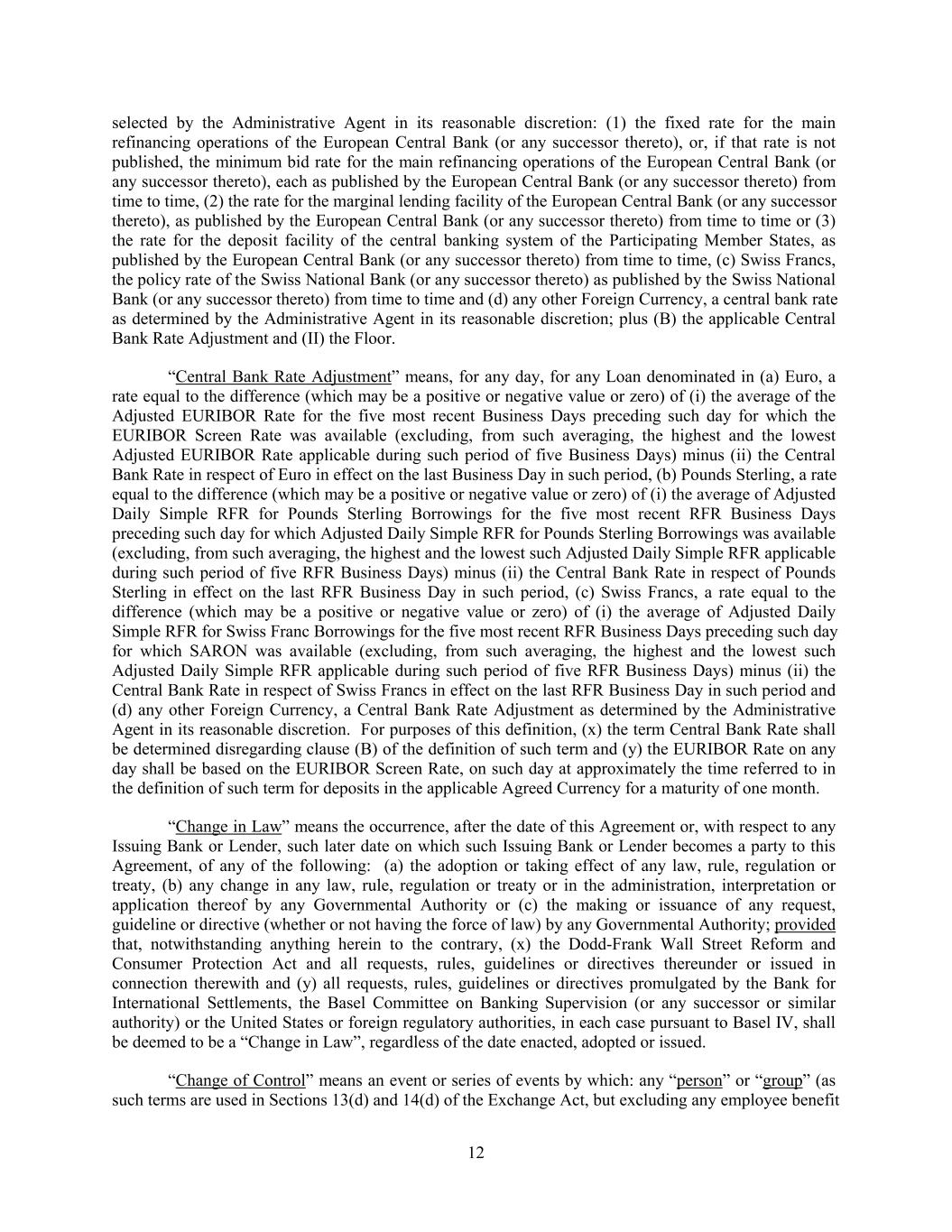 selected by the Administrative Agent in its reasonable discretion: (1) the fixed rate for the main refinancing operations of the European Central Bank (or any successor thereto), or, if that rate is not published, the minimum bid rate for the main refinancing operations of the European Central Bank (or any successor thereto), each as published by the European Central Bank (or any successor thereto) from time to time, (2) the rate for the marginal lending facility of the European Central Bank (or any successor thereto), as published by the European Central Bank (or any successor thereto) from time to time or (3) the rate for the deposit facility of the central banking system of the Participating Member States, as published by the European Central Bank (or any successor thereto) from time to time, (c) Swiss Francs, the policy rate of the Swiss National Bank (or any successor thereto) as published by the Swiss National Bank (or any successor thereto) from time to time and (d) any other Foreign Currency, a central bank rate as determined by the Administrative Agent in its reasonable discretion; plus (B) the applicable Central Bank Rate Adjustment and (II) the Floor. “Central Bank Rate Adjustment” means, for any day, for any Loan denominated in (a) Euro, a rate equal to the difference (which may be a positive or negative value or zero) of (i) the average of the Adjusted EURIBOR Rate for the five most recent Business Days preceding such day for which the EURIBOR Screen Rate was available (excluding, from such averaging, the highest and the lowest Adjusted EURIBOR Rate applicable during such period of five Business Days) minus (ii) the Central Bank Rate in respect of Euro in effect on the last Business Day in such period, (b) Pounds Sterling, a rate equal to the difference (which may be a positive or negative value or zero) of (i) the average of Adjusted Daily Simple RFR for Pounds Sterling Borrowings for the five most recent RFR Business Days preceding such day for which Adjusted Daily Simple RFR for Pounds Sterling Borrowings was available (excluding, from such averaging, the highest and the lowest such Adjusted Daily Simple RFR applicable during such period of five RFR Business Days) minus (ii) the Central Bank Rate in respect of Pounds Sterling in effect on the last RFR Business Day in such period, (c) Swiss Francs, a rate equal to the difference (which may be a positive or negative value or zero) of (i) the average of Adjusted Daily Simple RFR for Swiss Franc Borrowings for the five most recent RFR Business Days preceding such day for which SARON was available (excluding, from such averaging, the highest and the lowest such Adjusted Daily Simple RFR applicable during such period of five RFR Business Days) minus (ii) the Central Bank Rate in respect of Swiss Francs in effect on the last RFR Business Day in such period and (d) any other Foreign Currency, a Central Bank Rate Adjustment as determined by the Administrative Agent in its reasonable discretion. For purposes of this definition, (x) the term Central Bank Rate shall be determined disregarding clause (B) of the definition of such term and (y) the EURIBOR Rate on any day shall be based on the EURIBOR Screen Rate, on such day at approximately the time referred to in the definition of such term for deposits in the applicable Agreed Currency for a maturity of one month. “Change in Law” means the occurrence, after the date of this Agreement or, with respect to any Issuing Bank or Lender, such later date on which such Issuing Bank or Lender becomes a party to this Agreement, of any of the following: (a) the adoption or taking effect of any law, rule, regulation or treaty, (b) any change in any law, rule, regulation or treaty or in the administration, interpretation or application thereof by any Governmental Authority or (c) the making or issuance of any request, guideline or directive (whether or not having the force of law) by any Governmental Authority; provided that, notwithstanding anything herein to the contrary, (x) the Dodd-Frank Wall Street Reform and Consumer Protection Act and all requests, rules, guidelines or directives thereunder or issued in connection therewith and (y) all requests, rules, guidelines or directives promulgated by the Bank for International Settlements, the Basel Committee on Banking Supervision (or any successor or similar authority) or the United States or foreign regulatory authorities, in each case pursuant to Basel IV, shall be deemed to be a “Change in Law”, regardless of the date enacted, adopted or issued. “Change of Control” means an event or series of events by which: any “person” or “group” (as such terms are used in Sections 13(d) and 14(d) of the Exchange Act, but excluding any employee benefit 12