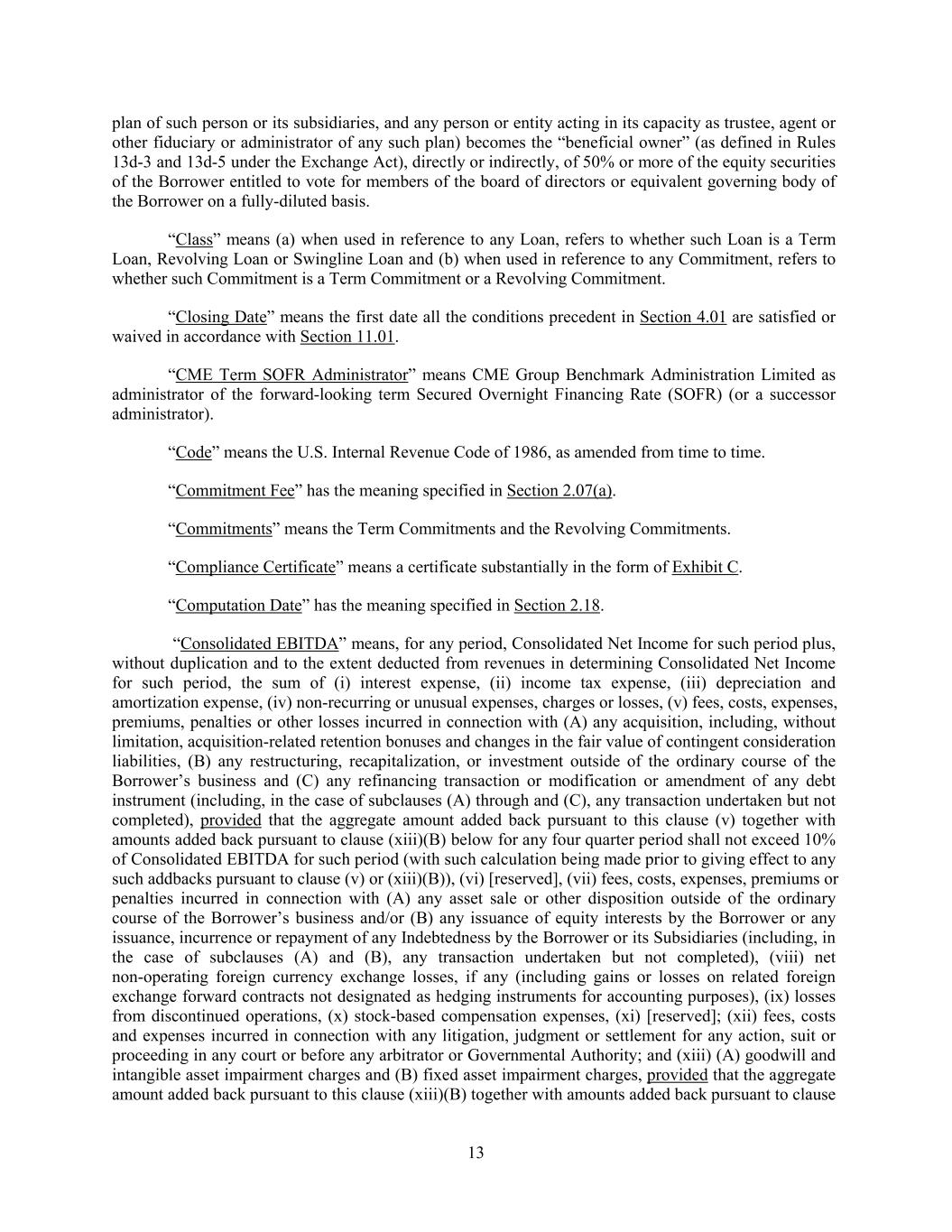 plan of such person or its subsidiaries, and any person or entity acting in its capacity as trustee, agent or other fiduciary or administrator of any such plan) becomes the “beneficial owner” (as defined in Rules 13d-3 and 13d-5 under the Exchange Act), directly or indirectly, of 50% or more of the equity securities of the Borrower entitled to vote for members of the board of directors or equivalent governing body of the Borrower on a fully-diluted basis. “Class” means (a) when used in reference to any Loan, refers to whether such Loan is a Term Loan, Revolving Loan or Swingline Loan and (b) when used in reference to any Commitment, refers to whether such Commitment is a Term Commitment or a Revolving Commitment. “Closing Date” means the first date all the conditions precedent in Section 4.01 are satisfied or waived in accordance with Section 11.01. “CME Term SOFR Administrator” means CME Group Benchmark Administration Limited as administrator of the forward-looking term Secured Overnight Financing Rate (SOFR) (or a successor administrator). “Code” means the U.S. Internal Revenue Code of 1986, as amended from time to time. “Commitment Fee” has the meaning specified in Section 2.07(a). “Commitments” means the Term Commitments and the Revolving Commitments. “Compliance Certificate” means a certificate substantially in the form of Exhibit C. “Computation Date” has the meaning specified in Section 2.18. “Consolidated EBITDA” means, for any period, Consolidated Net Income for such period plus, without duplication and to the extent deducted from revenues in determining Consolidated Net Income for such period, the sum of (i) interest expense, (ii) income tax expense, (iii) depreciation and amortization expense, (iv) non-recurring or unusual expenses, charges or losses, (v) fees, costs, expenses, premiums, penalties or other losses incurred in connection with (A) any acquisition, including, without limitation, acquisition-related retention bonuses and changes in the fair value of contingent consideration liabilities, (B) any restructuring, recapitalization, or investment outside of the ordinary course of the Borrower’s business and (C) any refinancing transaction or modification or amendment of any debt instrument (including, in the case of subclauses (A) through and (C), any transaction undertaken but not completed), provided that the aggregate amount added back pursuant to this clause (v) together with amounts added back pursuant to clause (xiii)(B) below for any four quarter period shall not exceed 10% of Consolidated EBITDA for such period (with such calculation being made prior to giving effect to any such addbacks pursuant to clause (v) or (xiii)(B)), (vi) [reserved], (vii) fees, costs, expenses, premiums or penalties incurred in connection with (A) any asset sale or other disposition outside of the ordinary course of the Borrower’s business and/or (B) any issuance of equity interests by the Borrower or any issuance, incurrence or repayment of any Indebtedness by the Borrower or its Subsidiaries (including, in the case of subclauses (A) and (B), any transaction undertaken but not completed), (viii) net non-operating foreign currency exchange losses, if any (including gains or losses on related foreign exchange forward contracts not designated as hedging instruments for accounting purposes), (ix) losses from discontinued operations, (x) stock-based compensation expenses, (xi) [reserved]; (xii) fees, costs and expenses incurred in connection with any litigation, judgment or settlement for any action, suit or proceeding in any court or before any arbitrator or Governmental Authority; and (xiii) (A) goodwill and intangible asset impairment charges and (B) fixed asset impairment charges, provided that the aggregate amount added back pursuant to this clause (xiii)(B) together with amounts added back pursuant to clause 13