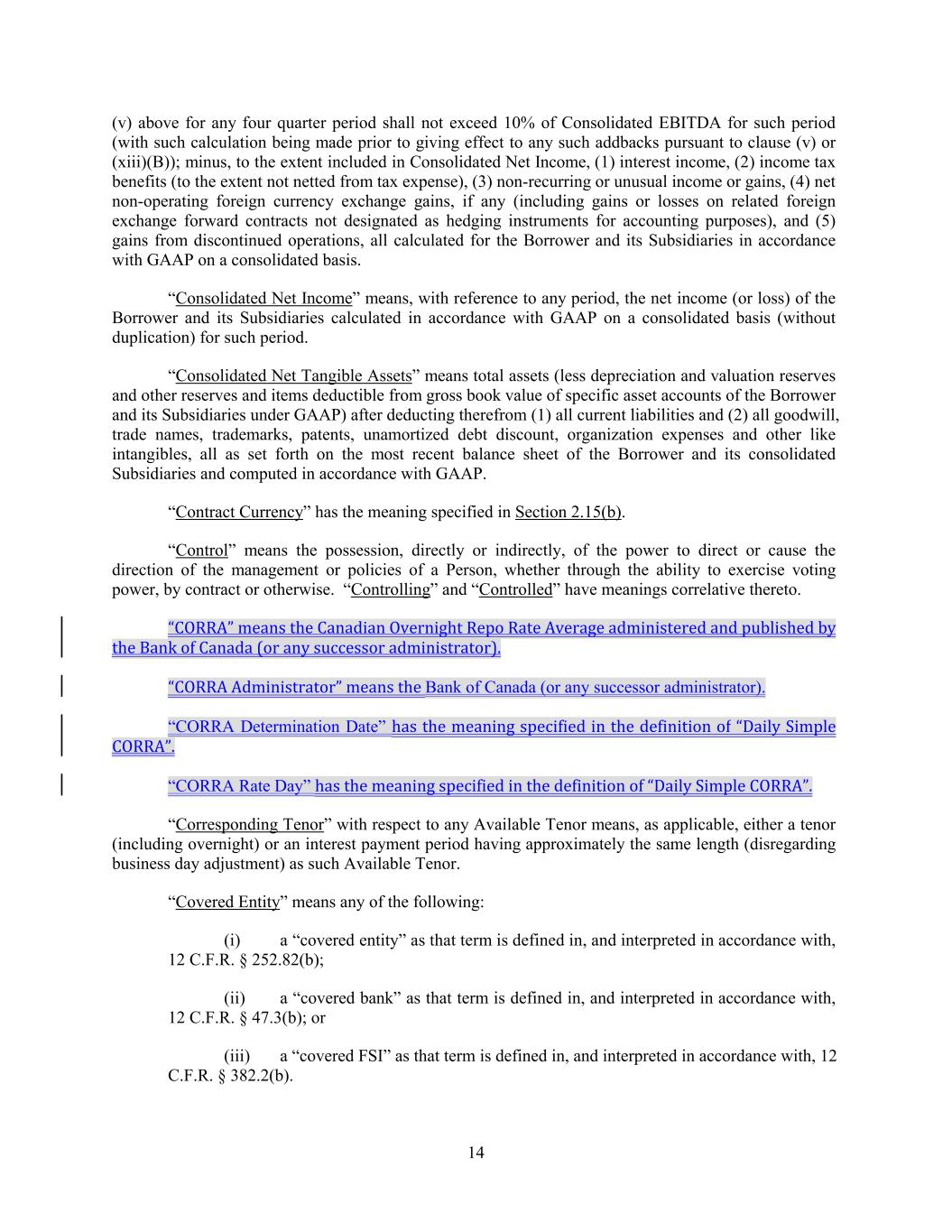 (v) above for any four quarter period shall not exceed 10% of Consolidated EBITDA for such period (with such calculation being made prior to giving effect to any such addbacks pursuant to clause (v) or (xiii)(B)); minus, to the extent included in Consolidated Net Income, (1) interest income, (2) income tax benefits (to the extent not netted from tax expense), (3) non-recurring or unusual income or gains, (4) net non-operating foreign currency exchange gains, if any (including gains or losses on related foreign exchange forward contracts not designated as hedging instruments for accounting purposes), and (5) gains from discontinued operations, all calculated for the Borrower and its Subsidiaries in accordance with GAAP on a consolidated basis. “Consolidated Net Income” means, with reference to any period, the net income (or loss) of the Borrower and its Subsidiaries calculated in accordance with GAAP on a consolidated basis (without duplication) for such period. “Consolidated Net Tangible Assets” means total assets (less depreciation and valuation reserves and other reserves and items deductible from gross book value of specific asset accounts of the Borrower and its Subsidiaries under GAAP) after deducting therefrom (1) all current liabilities and (2) all goodwill, trade names, trademarks, patents, unamortized debt discount, organization expenses and other like intangibles, all as set forth on the most recent balance sheet of the Borrower and its consolidated Subsidiaries and computed in accordance with GAAP. “Contract Currency” has the meaning specified in Section 2.15(b). “Control” means the possession, directly or indirectly, of the power to direct or cause the direction of the management or policies of a Person, whether through the ability to exercise voting power, by contract or otherwise. “Controlling” and “Controlled” have meanings correlative thereto. “CORRA” means the Canadian Overnight Repo Rate Average administered and published by the Bank of Canada (or any successor administrator). “CORRA Administrator” means the Bank of Canada (or any successor administrator). “CORRA Determination Date” has the meaning specified in the definition of “Daily Simple CORRA”. “CORRA Rate Day” has the meaning specified in the definition of “Daily Simple CORRA”. “Corresponding Tenor” with respect to any Available Tenor means, as applicable, either a tenor (including overnight) or an interest payment period having approximately the same length (disregarding business day adjustment) as such Available Tenor. “Covered Entity” means any of the following: (i) a “covered entity” as that term is defined in, and interpreted in accordance with, 12 C.F.R. § 252.82(b); (ii) a “covered bank” as that term is defined in, and interpreted in accordance with, 12 C.F.R. § 47.3(b); or (iii) a “covered FSI” as that term is defined in, and interpreted in accordance with, 12 C.F.R. § 382.2(b). 14