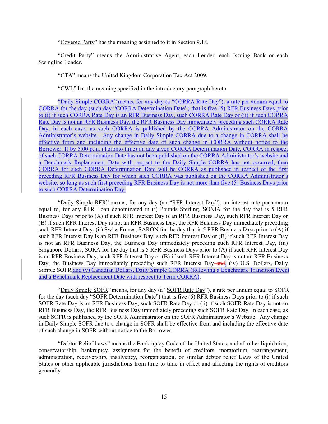 “Covered Party” has the meaning assigned to it in Section 9.18. “Credit Party” means the Administrative Agent, each Lender, each Issuing Bank or each Swingline Lender. “CTA” means the United Kingdom Corporation Tax Act 2009. “CWL” has the meaning specified in the introductory paragraph hereto. “Daily Simple CORRA” means, for any day (a “CORRA Rate Day”), a rate per annum equal to CORRA for the day (such day “CORRA Determination Date”) that is five (5) RFR Business Days prior to (i) if such CORRA Rate Day is an RFR Business Day, such CORRA Rate Day or (ii) if such CORRA Rate Day is not an RFR Business Day, the RFR Business Day immediately preceding such CORRA Rate Day, in each case, as such CORRA is published by the CORRA Administrator on the CORRA Administrator’s website. Any change in Daily Simple CORRA due to a change in CORRA shall be effective from and including the effective date of such change in CORRA without notice to the Borrower. If by 5:00 p.m. (Toronto time) on any given CORRA Determination Date, CORRA in respect of such CORRA Determination Date has not been published on the CORRA Administrator’s website and a Benchmark Replacement Date with respect to the Daily Simple CORRA has not occurred, then CORRA for such CORRA Determination Date will be CORRA as published in respect of the first preceding RFR Business Day for which such CORRA was published on the CORRA Administrator’s website, so long as such first preceding RFR Business Day is not more than five (5) Business Days prior to such CORRA Determination Day. “Daily Simple RFR” means, for any day (an “RFR Interest Day”), an interest rate per annum equal to, for any RFR Loan denominated in (i) Pounds Sterling, SONIA for the day that is 5 RFR Business Days prior to (A) if such RFR Interest Day is an RFR Business Day, such RFR Interest Day or (B) if such RFR Interest Day is not an RFR Business Day, the RFR Business Day immediately preceding such RFR Interest Day, (ii) Swiss Francs, SARON for the day that is 5 RFR Business Days prior to (A) if such RFR Interest Day is an RFR Business Day, such RFR Interest Day or (B) if such RFR Interest Day is not an RFR Business Day, the Business Day immediately preceding such RFR Interest Day, (iii) Singapore Dollars, SORA for the day that is 5 RFR Business Days prior to (A) if such RFR Interest Day is an RFR Business Day, such RFR Interest Day or (B) if such RFR Interest Day is not an RFR Business Day, the Business Day immediately preceding such RFR Interest Day and, (iv) U.S. Dollars, Daily Simple SOFR and (v) Canadian Dollars, Daily Simple CORRA (following a Benchmark Transition Event and a Benchmark Replacement Date with respect to Term CORRA). “Daily Simple SOFR” means, for any day (a “SOFR Rate Day”), a rate per annum equal to SOFR for the day (such day “SOFR Determination Date”) that is five (5) RFR Business Days prior to (i) if such SOFR Rate Day is an RFR Business Day, such SOFR Rate Day or (ii) if such SOFR Rate Day is not an RFR Business Day, the RFR Business Day immediately preceding such SOFR Rate Day, in each case, as such SOFR is published by the SOFR Administrator on the SOFR Administrator’s Website. Any change in Daily Simple SOFR due to a change in SOFR shall be effective from and including the effective date of such change in SOFR without notice to the Borrower. “Debtor Relief Laws” means the Bankruptcy Code of the United States, and all other liquidation, conservatorship, bankruptcy, assignment for the benefit of creditors, moratorium, rearrangement, administration, receivership, insolvency, reorganization, or similar debtor relief Laws of the United States or other applicable jurisdictions from time to time in effect and affecting the rights of creditors generally. 15