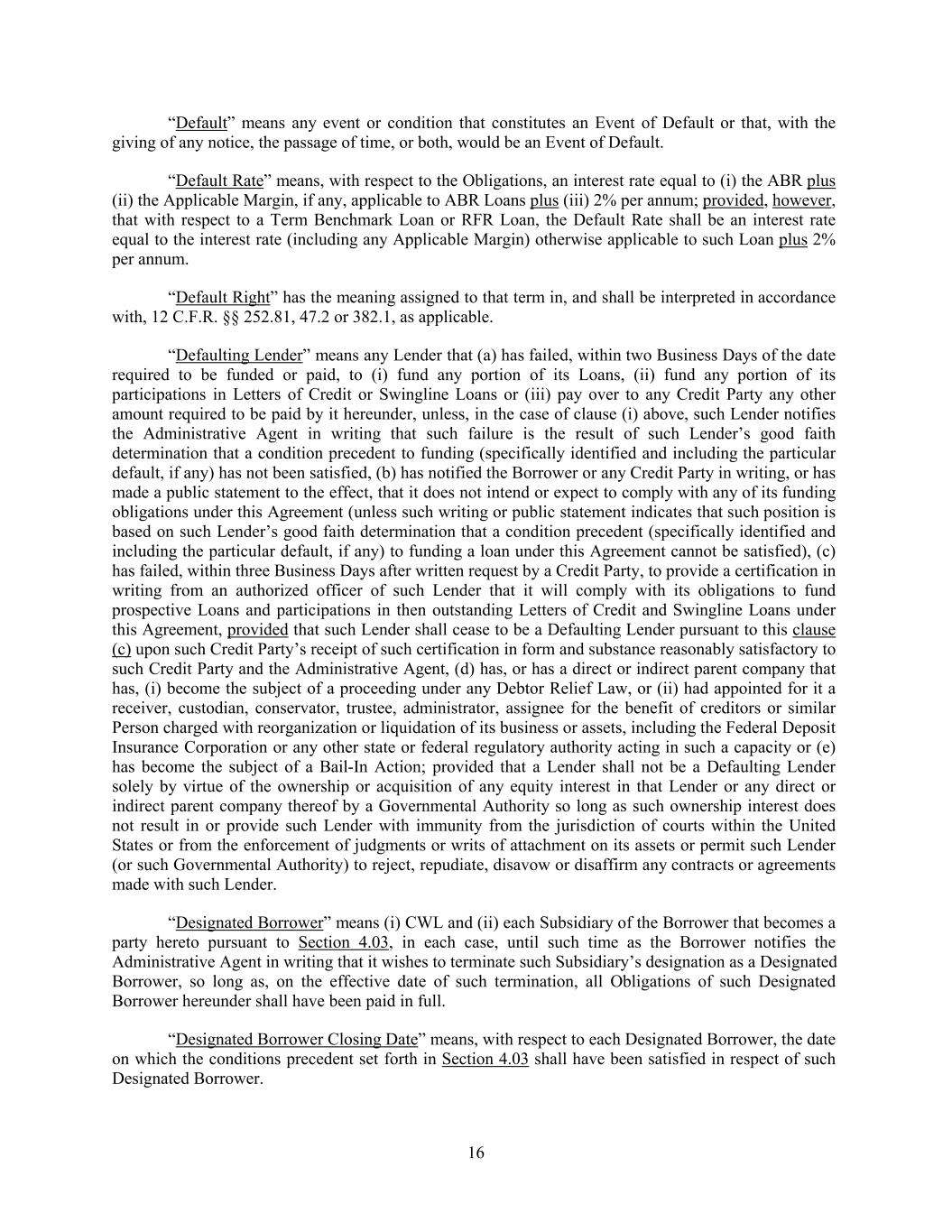 “Default” means any event or condition that constitutes an Event of Default or that, with the giving of any notice, the passage of time, or both, would be an Event of Default. “Default Rate” means, with respect to the Obligations, an interest rate equal to (i) the ABR plus (ii) the Applicable Margin, if any, applicable to ABR Loans plus (iii) 2% per annum; provided, however, that with respect to a Term Benchmark Loan or RFR Loan, the Default Rate shall be an interest rate equal to the interest rate (including any Applicable Margin) otherwise applicable to such Loan plus 2% per annum. “Default Right” has the meaning assigned to that term in, and shall be interpreted in accordance with, 12 C.F.R. §§ 252.81, 47.2 or 382.1, as applicable. “Defaulting Lender” means any Lender that (a) has failed, within two Business Days of the date required to be funded or paid, to (i) fund any portion of its Loans, (ii) fund any portion of its participations in Letters of Credit or Swingline Loans or (iii) pay over to any Credit Party any other amount required to be paid by it hereunder, unless, in the case of clause (i) above, such Lender notifies the Administrative Agent in writing that such failure is the result of such Lender’s good faith determination that a condition precedent to funding (specifically identified and including the particular default, if any) has not been satisfied, (b) has notified the Borrower or any Credit Party in writing, or has made a public statement to the effect, that it does not intend or expect to comply with any of its funding obligations under this Agreement (unless such writing or public statement indicates that such position is based on such Lender’s good faith determination that a condition precedent (specifically identified and including the particular default, if any) to funding a loan under this Agreement cannot be satisfied), (c) has failed, within three Business Days after written request by a Credit Party, to provide a certification in writing from an authorized officer of such Lender that it will comply with its obligations to fund prospective Loans and participations in then outstanding Letters of Credit and Swingline Loans under this Agreement, provided that such Lender shall cease to be a Defaulting Lender pursuant to this clause (c) upon such Credit Party’s receipt of such certification in form and substance reasonably satisfactory to such Credit Party and the Administrative Agent, (d) has, or has a direct or indirect parent company that has, (i) become the subject of a proceeding under any Debtor Relief Law, or (ii) had appointed for it a receiver, custodian, conservator, trustee, administrator, assignee for the benefit of creditors or similar Person charged with reorganization or liquidation of its business or assets, including the Federal Deposit Insurance Corporation or any other state or federal regulatory authority acting in such a capacity or (e) has become the subject of a Bail-In Action; provided that a Lender shall not be a Defaulting Lender solely by virtue of the ownership or acquisition of any equity interest in that Lender or any direct or indirect parent company thereof by a Governmental Authority so long as such ownership interest does not result in or provide such Lender with immunity from the jurisdiction of courts within the United States or from the enforcement of judgments or writs of attachment on its assets or permit such Lender (or such Governmental Authority) to reject, repudiate, disavow or disaffirm any contracts or agreements made with such Lender. “Designated Borrower” means (i) CWL and (ii) each Subsidiary of the Borrower that becomes a party hereto pursuant to Section 4.03, in each case, until such time as the Borrower notifies the Administrative Agent in writing that it wishes to terminate such Subsidiary’s designation as a Designated Borrower, so long as, on the effective date of such termination, all Obligations of such Designated Borrower hereunder shall have been paid in full. “Designated Borrower Closing Date” means, with respect to each Designated Borrower, the date on which the conditions precedent set forth in Section 4.03 shall have been satisfied in respect of such Designated Borrower. 16