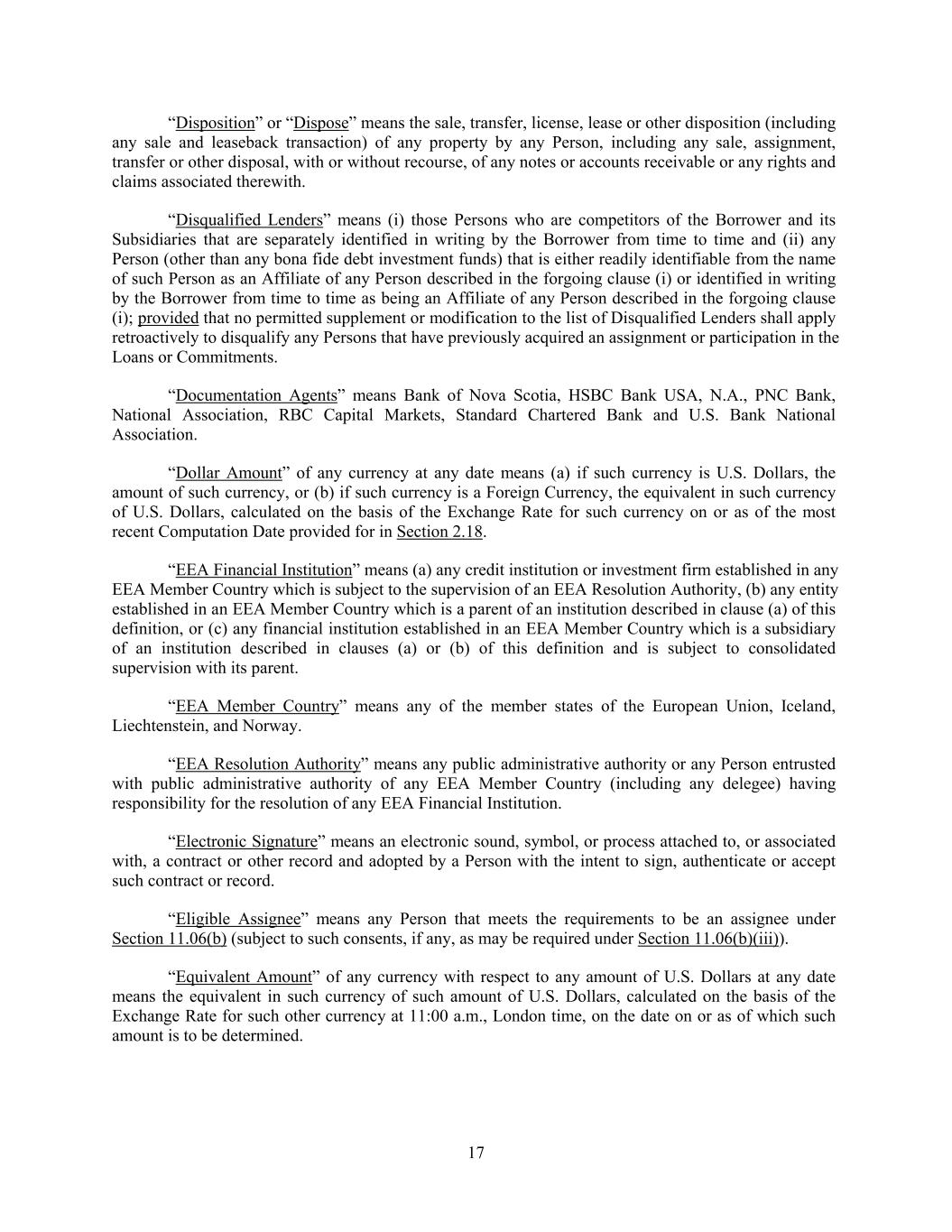 “Disposition” or “Dispose” means the sale, transfer, license, lease or other disposition (including any sale and leaseback transaction) of any property by any Person, including any sale, assignment, transfer or other disposal, with or without recourse, of any notes or accounts receivable or any rights and claims associated therewith. “Disqualified Lenders” means (i) those Persons who are competitors of the Borrower and its Subsidiaries that are separately identified in writing by the Borrower from time to time and (ii) any Person (other than any bona fide debt investment funds) that is either readily identifiable from the name of such Person as an Affiliate of any Person described in the forgoing clause (i) or identified in writing by the Borrower from time to time as being an Affiliate of any Person described in the forgoing clause (i); provided that no permitted supplement or modification to the list of Disqualified Lenders shall apply retroactively to disqualify any Persons that have previously acquired an assignment or participation in the Loans or Commitments. “Documentation Agents” means Bank of Nova Scotia, HSBC Bank USA, N.A., PNC Bank, National Association, RBC Capital Markets, Standard Chartered Bank and U.S. Bank National Association. “Dollar Amount” of any currency at any date means (a) if such currency is U.S. Dollars, the amount of such currency, or (b) if such currency is a Foreign Currency, the equivalent in such currency of U.S. Dollars, calculated on the basis of the Exchange Rate for such currency on or as of the most recent Computation Date provided for in Section 2.18. “EEA Financial Institution” means (a) any credit institution or investment firm established in any EEA Member Country which is subject to the supervision of an EEA Resolution Authority, (b) any entity established in an EEA Member Country which is a parent of an institution described in clause (a) of this definition, or (c) any financial institution established in an EEA Member Country which is a subsidiary of an institution described in clauses (a) or (b) of this definition and is subject to consolidated supervision with its parent. “EEA Member Country” means any of the member states of the European Union, Iceland, Liechtenstein, and Norway. “EEA Resolution Authority” means any public administrative authority or any Person entrusted with public administrative authority of any EEA Member Country (including any delegee) having responsibility for the resolution of any EEA Financial Institution. “Electronic Signature” means an electronic sound, symbol, or process attached to, or associated with, a contract or other record and adopted by a Person with the intent to sign, authenticate or accept such contract or record. “Eligible Assignee” means any Person that meets the requirements to be an assignee under Section 11.06(b) (subject to such consents, if any, as may be required under Section 11.06(b)(iii)). “Equivalent Amount” of any currency with respect to any amount of U.S. Dollars at any date means the equivalent in such currency of such amount of U.S. Dollars, calculated on the basis of the Exchange Rate for such other currency at 11:00 a.m., London time, on the date on or as of which such amount is to be determined. 17