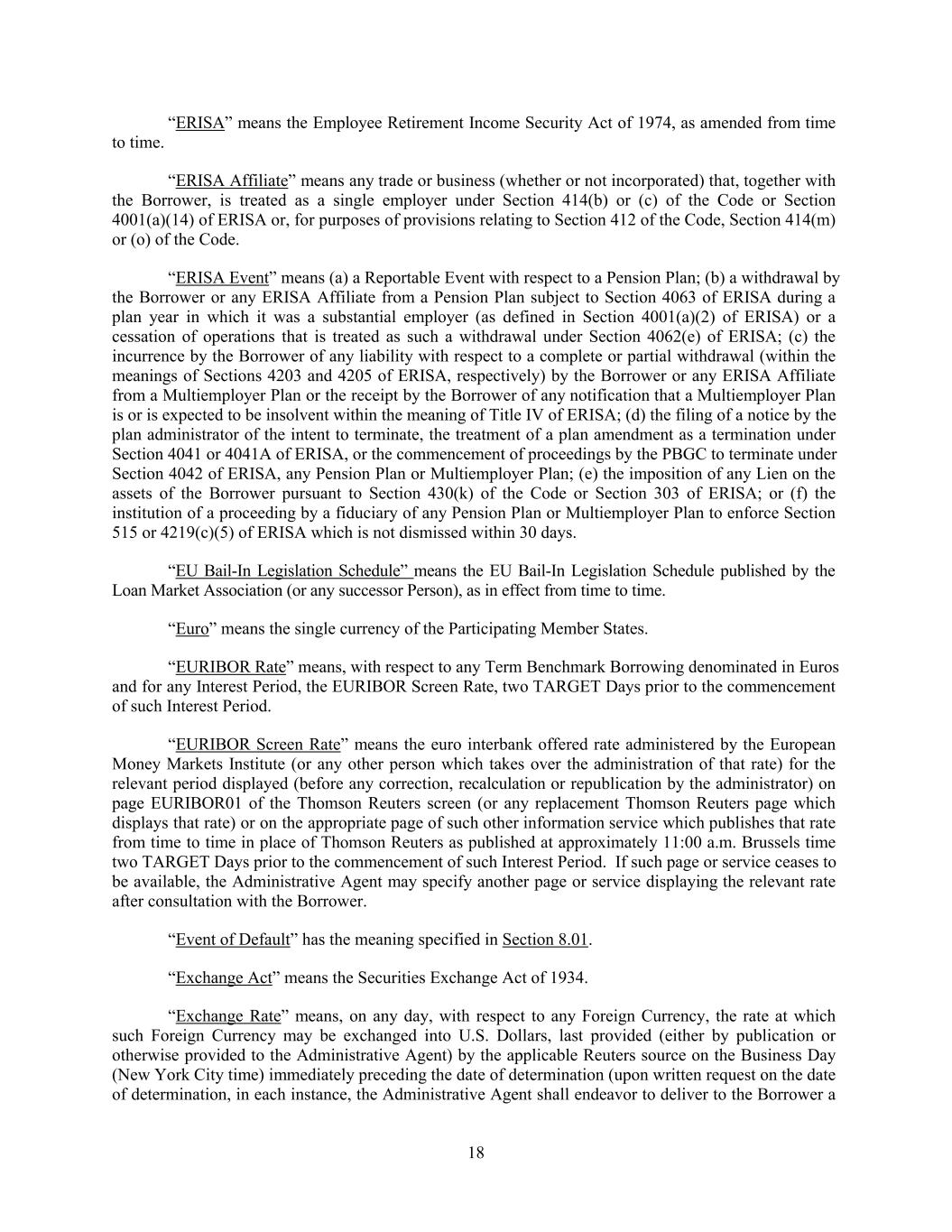 “ERISA” means the Employee Retirement Income Security Act of 1974, as amended from time to time. “ERISA Affiliate” means any trade or business (whether or not incorporated) that, together with the Borrower, is treated as a single employer under Section 414(b) or (c) of the Code or Section 4001(a)(14) of ERISA or, for purposes of provisions relating to Section 412 of the Code, Section 414(m) or (o) of the Code. “ERISA Event” means (a) a Reportable Event with respect to a Pension Plan; (b) a withdrawal by the Borrower or any ERISA Affiliate from a Pension Plan subject to Section 4063 of ERISA during a plan year in which it was a substantial employer (as defined in Section 4001(a)(2) of ERISA) or a cessation of operations that is treated as such a withdrawal under Section 4062(e) of ERISA; (c) the incurrence by the Borrower of any liability with respect to a complete or partial withdrawal (within the meanings of Sections 4203 and 4205 of ERISA, respectively) by the Borrower or any ERISA Affiliate from a Multiemployer Plan or the receipt by the Borrower of any notification that a Multiemployer Plan is or is expected to be insolvent within the meaning of Title IV of ERISA; (d) the filing of a notice by the plan administrator of the intent to terminate, the treatment of a plan amendment as a termination under Section 4041 or 4041A of ERISA, or the commencement of proceedings by the PBGC to terminate under Section 4042 of ERISA, any Pension Plan or Multiemployer Plan; (e) the imposition of any Lien on the assets of the Borrower pursuant to Section 430(k) of the Code or Section 303 of ERISA; or (f) the institution of a proceeding by a fiduciary of any Pension Plan or Multiemployer Plan to enforce Section 515 or 4219(c)(5) of ERISA which is not dismissed within 30 days. “EU Bail-In Legislation Schedule” means the EU Bail-In Legislation Schedule published by the Loan Market Association (or any successor Person), as in effect from time to time. “Euro” means the single currency of the Participating Member States. “EURIBOR Rate” means, with respect to any Term Benchmark Borrowing denominated in Euros and for any Interest Period, the EURIBOR Screen Rate, two TARGET Days prior to the commencement of such Interest Period. “EURIBOR Screen Rate” means the euro interbank offered rate administered by the European Money Markets Institute (or any other person which takes over the administration of that rate) for the relevant period displayed (before any correction, recalculation or republication by the administrator) on page EURIBOR01 of the Thomson Reuters screen (or any replacement Thomson Reuters page which displays that rate) or on the appropriate page of such other information service which publishes that rate from time to time in place of Thomson Reuters as published at approximately 11:00 a.m. Brussels time two TARGET Days prior to the commencement of such Interest Period. If such page or service ceases to be available, the Administrative Agent may specify another page or service displaying the relevant rate after consultation with the Borrower. “Event of Default” has the meaning specified in Section 8.01. “Exchange Act” means the Securities Exchange Act of 1934. “Exchange Rate” means, on any day, with respect to any Foreign Currency, the rate at which such Foreign Currency may be exchanged into U.S. Dollars, last provided (either by publication or otherwise provided to the Administrative Agent) by the applicable Reuters source on the Business Day (New York City time) immediately preceding the date of determination (upon written request on the date of determination, in each instance, the Administrative Agent shall endeavor to deliver to the Borrower a 18