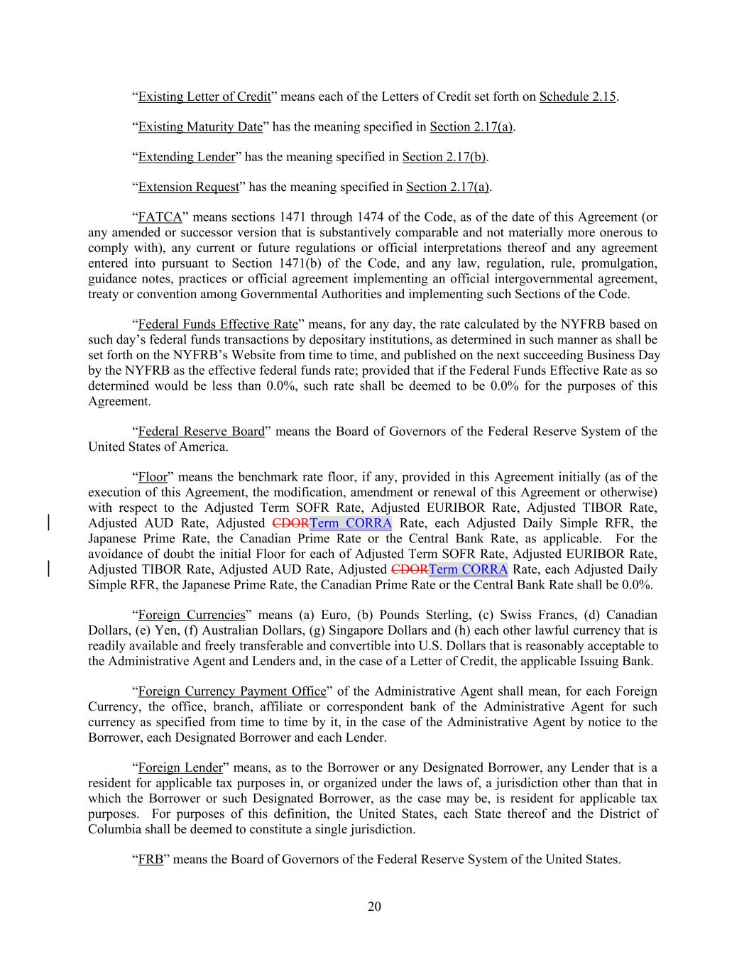 “Existing Letter of Credit” means each of the Letters of Credit set forth on Schedule 2.15. “Existing Maturity Date” has the meaning specified in Section 2.17(a). “Extending Lender” has the meaning specified in Section 2.17(b). “Extension Request” has the meaning specified in Section 2.17(a). “FATCA” means sections 1471 through 1474 of the Code, as of the date of this Agreement (or any amended or successor version that is substantively comparable and not materially more onerous to comply with), any current or future regulations or official interpretations thereof and any agreement entered into pursuant to Section 1471(b) of the Code, and any law, regulation, rule, promulgation, guidance notes, practices or official agreement implementing an official intergovernmental agreement, treaty or convention among Governmental Authorities and implementing such Sections of the Code. “Federal Funds Effective Rate” means, for any day, the rate calculated by the NYFRB based on such day’s federal funds transactions by depositary institutions, as determined in such manner as shall be set forth on the NYFRB’s Website from time to time, and published on the next succeeding Business Day by the NYFRB as the effective federal funds rate; provided that if the Federal Funds Effective Rate as so determined would be less than 0.0%, such rate shall be deemed to be 0.0% for the purposes of this Agreement. “Federal Reserve Board” means the Board of Governors of the Federal Reserve System of the United States of America. “Floor” means the benchmark rate floor, if any, provided in this Agreement initially (as of the execution of this Agreement, the modification, amendment or renewal of this Agreement or otherwise) with respect to the Adjusted Term SOFR Rate, Adjusted EURIBOR Rate, Adjusted TIBOR Rate, Adjusted AUD Rate, Adjusted CDORTerm CORRA Rate, each Adjusted Daily Simple RFR, the Japanese Prime Rate, the Canadian Prime Rate or the Central Bank Rate, as applicable. For the avoidance of doubt the initial Floor for each of Adjusted Term SOFR Rate, Adjusted EURIBOR Rate, Adjusted TIBOR Rate, Adjusted AUD Rate, Adjusted CDORTerm CORRA Rate, each Adjusted Daily Simple RFR, the Japanese Prime Rate, the Canadian Prime Rate or the Central Bank Rate shall be 0.0%. “Foreign Currencies” means (a) Euro, (b) Pounds Sterling, (c) Swiss Francs, (d) Canadian Dollars, (e) Yen, (f) Australian Dollars, (g) Singapore Dollars and (h) each other lawful currency that is readily available and freely transferable and convertible into U.S. Dollars that is reasonably acceptable to the Administrative Agent and Lenders and, in the case of a Letter of Credit, the applicable Issuing Bank. “Foreign Currency Payment Office” of the Administrative Agent shall mean, for each Foreign Currency, the office, branch, affiliate or correspondent bank of the Administrative Agent for such currency as specified from time to time by it, in the case of the Administrative Agent by notice to the Borrower, each Designated Borrower and each Lender. “Foreign Lender” means, as to the Borrower or any Designated Borrower, any Lender that is a resident for applicable tax purposes in, or organized under the laws of, a jurisdiction other than that in which the Borrower or such Designated Borrower, as the case may be, is resident for applicable tax purposes. For purposes of this definition, the United States, each State thereof and the District of Columbia shall be deemed to constitute a single jurisdiction. “FRB” means the Board of Governors of the Federal Reserve System of the United States. 20