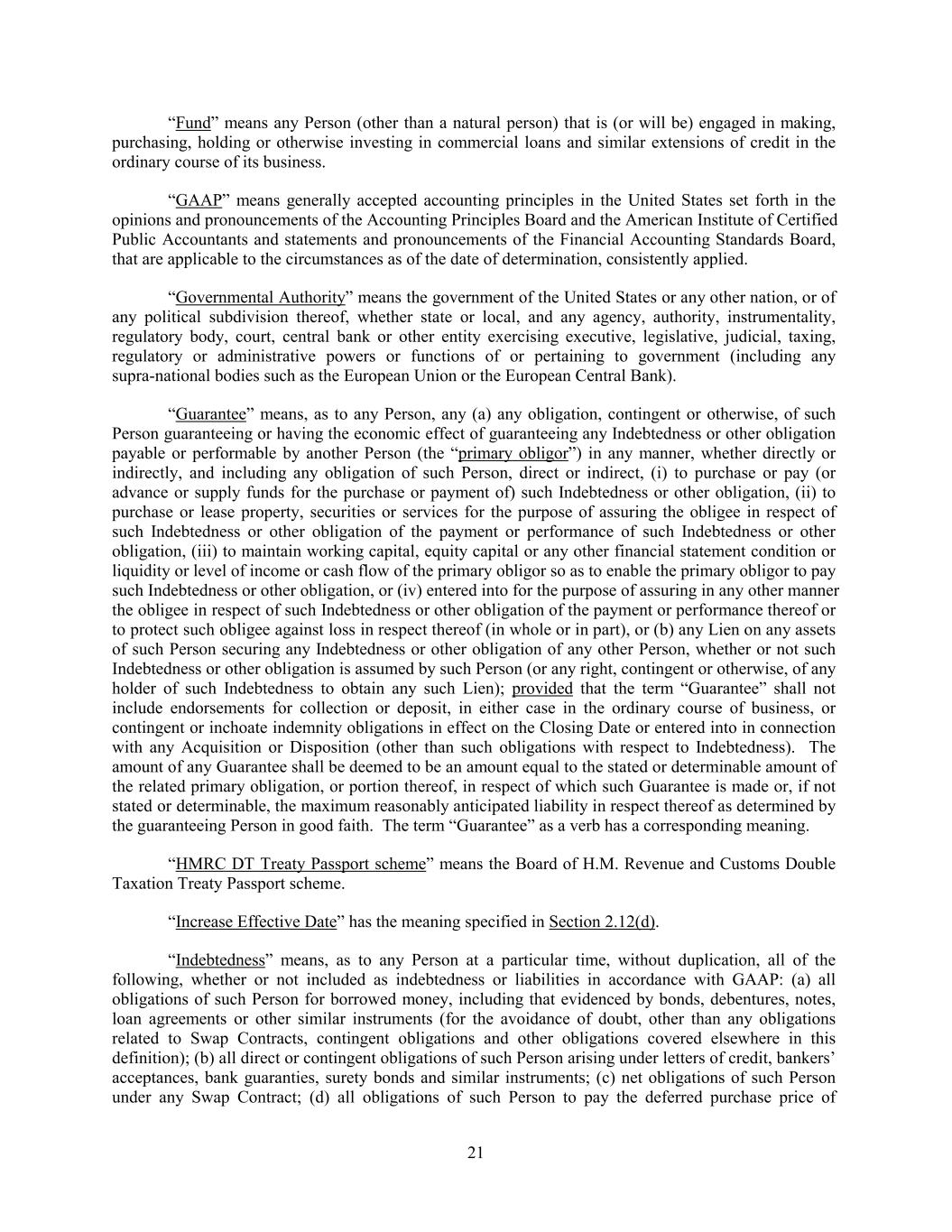 “Fund” means any Person (other than a natural person) that is (or will be) engaged in making, purchasing, holding or otherwise investing in commercial loans and similar extensions of credit in the ordinary course of its business. “GAAP” means generally accepted accounting principles in the United States set forth in the opinions and pronouncements of the Accounting Principles Board and the American Institute of Certified Public Accountants and statements and pronouncements of the Financial Accounting Standards Board, that are applicable to the circumstances as of the date of determination, consistently applied. “Governmental Authority” means the government of the United States or any other nation, or of any political subdivision thereof, whether state or local, and any agency, authority, instrumentality, regulatory body, court, central bank or other entity exercising executive, legislative, judicial, taxing, regulatory or administrative powers or functions of or pertaining to government (including any supra-national bodies such as the European Union or the European Central Bank). “Guarantee” means, as to any Person, any (a) any obligation, contingent or otherwise, of such Person guaranteeing or having the economic effect of guaranteeing any Indebtedness or other obligation payable or performable by another Person (the “primary obligor”) in any manner, whether directly or indirectly, and including any obligation of such Person, direct or indirect, (i) to purchase or pay (or advance or supply funds for the purchase or payment of) such Indebtedness or other obligation, (ii) to purchase or lease property, securities or services for the purpose of assuring the obligee in respect of such Indebtedness or other obligation of the payment or performance of such Indebtedness or other obligation, (iii) to maintain working capital, equity capital or any other financial statement condition or liquidity or level of income or cash flow of the primary obligor so as to enable the primary obligor to pay such Indebtedness or other obligation, or (iv) entered into for the purpose of assuring in any other manner the obligee in respect of such Indebtedness or other obligation of the payment or performance thereof or to protect such obligee against loss in respect thereof (in whole or in part), or (b) any Lien on any assets of such Person securing any Indebtedness or other obligation of any other Person, whether or not such Indebtedness or other obligation is assumed by such Person (or any right, contingent or otherwise, of any holder of such Indebtedness to obtain any such Lien); provided that the term “Guarantee” shall not include endorsements for collection or deposit, in either case in the ordinary course of business, or contingent or inchoate indemnity obligations in effect on the Closing Date or entered into in connection with any Acquisition or Disposition (other than such obligations with respect to Indebtedness). The amount of any Guarantee shall be deemed to be an amount equal to the stated or determinable amount of the related primary obligation, or portion thereof, in respect of which such Guarantee is made or, if not stated or determinable, the maximum reasonably anticipated liability in respect thereof as determined by the guaranteeing Person in good faith. The term “Guarantee” as a verb has a corresponding meaning. “HMRC DT Treaty Passport scheme” means the Board of H.M. Revenue and Customs Double Taxation Treaty Passport scheme. “Increase Effective Date” has the meaning specified in Section 2.12(d). “Indebtedness” means, as to any Person at a particular time, without duplication, all of the following, whether or not included as indebtedness or liabilities in accordance with GAAP: (a) all obligations of such Person for borrowed money, including that evidenced by bonds, debentures, notes, loan agreements or other similar instruments (for the avoidance of doubt, other than any obligations related to Swap Contracts, contingent obligations and other obligations covered elsewhere in this definition); (b) all direct or contingent obligations of such Person arising under letters of credit, bankers’ acceptances, bank guaranties, surety bonds and similar instruments; (c) net obligations of such Person under any Swap Contract; (d) all obligations of such Person to pay the deferred purchase price of 21
