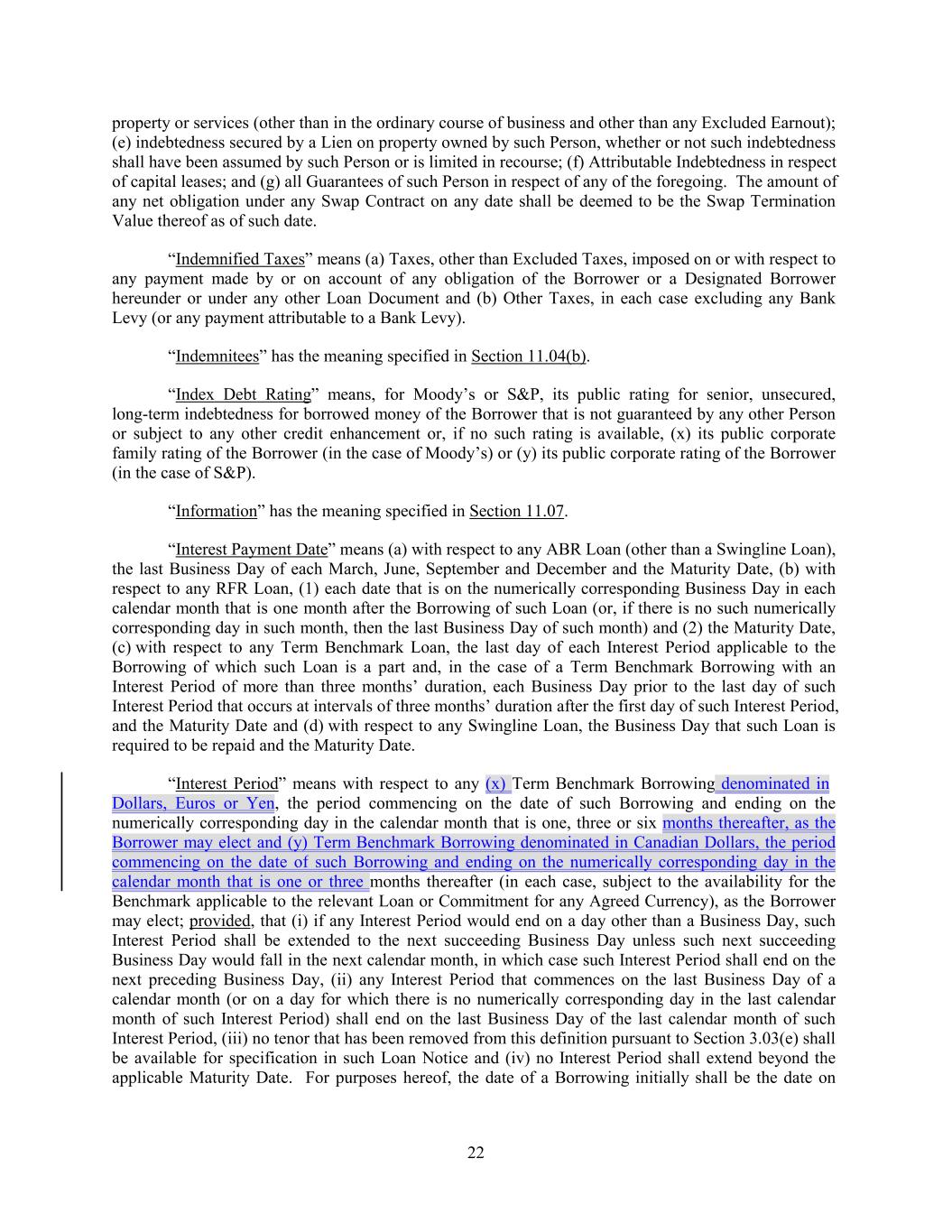 property or services (other than in the ordinary course of business and other than any Excluded Earnout); (e) indebtedness secured by a Lien on property owned by such Person, whether or not such indebtedness shall have been assumed by such Person or is limited in recourse; (f) Attributable Indebtedness in respect of capital leases; and (g) all Guarantees of such Person in respect of any of the foregoing. The amount of any net obligation under any Swap Contract on any date shall be deemed to be the Swap Termination Value thereof as of such date. “Indemnified Taxes” means (a) Taxes, other than Excluded Taxes, imposed on or with respect to any payment made by or on account of any obligation of the Borrower or a Designated Borrower hereunder or under any other Loan Document and (b) Other Taxes, in each case excluding any Bank Levy (or any payment attributable to a Bank Levy). “Indemnitees” has the meaning specified in Section 11.04(b). “Index Debt Rating” means, for Moody’s or S&P, its public rating for senior, unsecured, long-term indebtedness for borrowed money of the Borrower that is not guaranteed by any other Person or subject to any other credit enhancement or, if no such rating is available, (x) its public corporate family rating of the Borrower (in the case of Moody’s) or (y) its public corporate rating of the Borrower (in the case of S&P). “Information” has the meaning specified in Section 11.07. “Interest Payment Date” means (a) with respect to any ABR Loan (other than a Swingline Loan), the last Business Day of each March, June, September and December and the Maturity Date, (b) with respect to any RFR Loan, (1) each date that is on the numerically corresponding Business Day in each calendar month that is one month after the Borrowing of such Loan (or, if there is no such numerically corresponding day in such month, then the last Business Day of such month) and (2) the Maturity Date, (c) with respect to any Term Benchmark Loan, the last day of each Interest Period applicable to the Borrowing of which such Loan is a part and, in the case of a Term Benchmark Borrowing with an Interest Period of more than three months’ duration, each Business Day prior to the last day of such Interest Period that occurs at intervals of three months’ duration after the first day of such Interest Period, and the Maturity Date and (d) with respect to any Swingline Loan, the Business Day that such Loan is required to be repaid and the Maturity Date. “Interest Period” means with respect to any (x) Term Benchmark Borrowing denominated in Dollars, Euros or Yen, the period commencing on the date of such Borrowing and ending on the numerically corresponding day in the calendar month that is one, three or six months thereafter, as the Borrower may elect and (y) Term Benchmark Borrowing denominated in Canadian Dollars, the period commencing on the date of such Borrowing and ending on the numerically corresponding day in the calendar month that is one or three months thereafter (in each case, subject to the availability for the Benchmark applicable to the relevant Loan or Commitment for any Agreed Currency), as the Borrower may elect; provided, that (i) if any Interest Period would end on a day other than a Business Day, such Interest Period shall be extended to the next succeeding Business Day unless such next succeeding Business Day would fall in the next calendar month, in which case such Interest Period shall end on the next preceding Business Day, (ii) any Interest Period that commences on the last Business Day of a calendar month (or on a day for which there is no numerically corresponding day in the last calendar month of such Interest Period) shall end on the last Business Day of the last calendar month of such Interest Period, (iii) no tenor that has been removed from this definition pursuant to Section 3.03(e) shall be available for specification in such Loan Notice and (iv) no Interest Period shall extend beyond the applicable Maturity Date. For purposes hereof, the date of a Borrowing initially shall be the date on 22