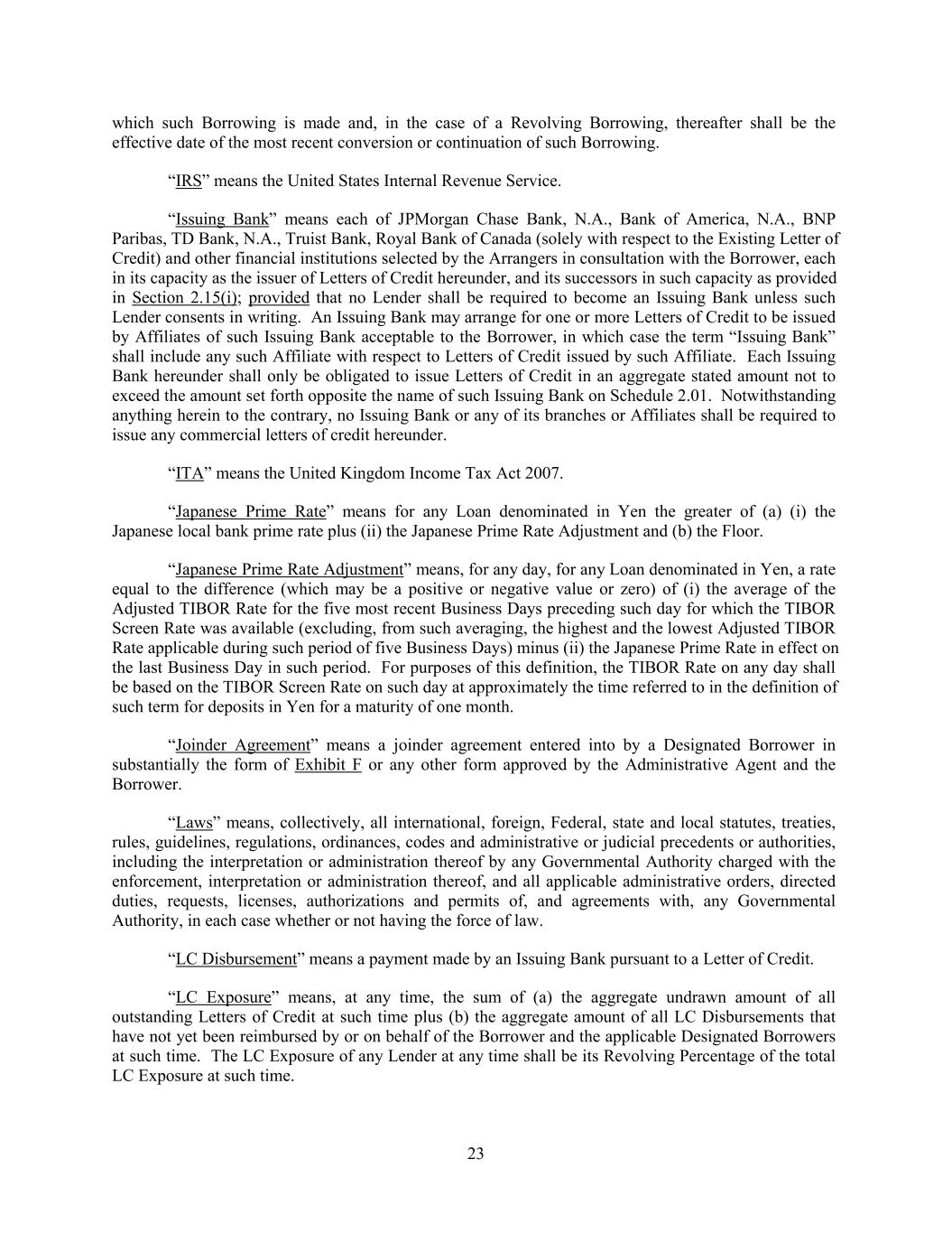 which such Borrowing is made and, in the case of a Revolving Borrowing, thereafter shall be the effective date of the most recent conversion or continuation of such Borrowing. “IRS” means the United States Internal Revenue Service. “Issuing Bank” means each of JPMorgan Chase Bank, N.A., Bank of America, N.A., BNP Paribas, TD Bank, N.A., Truist Bank, Royal Bank of Canada (solely with respect to the Existing Letter of Credit) and other financial institutions selected by the Arrangers in consultation with the Borrower, each in its capacity as the issuer of Letters of Credit hereunder, and its successors in such capacity as provided in Section 2.15(i); provided that no Lender shall be required to become an Issuing Bank unless such Lender consents in writing. An Issuing Bank may arrange for one or more Letters of Credit to be issued by Affiliates of such Issuing Bank acceptable to the Borrower, in which case the term “Issuing Bank” shall include any such Affiliate with respect to Letters of Credit issued by such Affiliate. Each Issuing Bank hereunder shall only be obligated to issue Letters of Credit in an aggregate stated amount not to exceed the amount set forth opposite the name of such Issuing Bank on Schedule 2.01. Notwithstanding anything herein to the contrary, no Issuing Bank or any of its branches or Affiliates shall be required to issue any commercial letters of credit hereunder. “ITA” means the United Kingdom Income Tax Act 2007. “Japanese Prime Rate” means for any Loan denominated in Yen the greater of (a) (i) the Japanese local bank prime rate plus (ii) the Japanese Prime Rate Adjustment and (b) the Floor. “Japanese Prime Rate Adjustment” means, for any day, for any Loan denominated in Yen, a rate equal to the difference (which may be a positive or negative value or zero) of (i) the average of the Adjusted TIBOR Rate for the five most recent Business Days preceding such day for which the TIBOR Screen Rate was available (excluding, from such averaging, the highest and the lowest Adjusted TIBOR Rate applicable during such period of five Business Days) minus (ii) the Japanese Prime Rate in effect on the last Business Day in such period. For purposes of this definition, the TIBOR Rate on any day shall be based on the TIBOR Screen Rate on such day at approximately the time referred to in the definition of such term for deposits in Yen for a maturity of one month. “Joinder Agreement” means a joinder agreement entered into by a Designated Borrower in substantially the form of Exhibit F or any other form approved by the Administrative Agent and the Borrower. “Laws” means, collectively, all international, foreign, Federal, state and local statutes, treaties, rules, guidelines, regulations, ordinances, codes and administrative or judicial precedents or authorities, including the interpretation or administration thereof by any Governmental Authority charged with the enforcement, interpretation or administration thereof, and all applicable administrative orders, directed duties, requests, licenses, authorizations and permits of, and agreements with, any Governmental Authority, in each case whether or not having the force of law. “LC Disbursement” means a payment made by an Issuing Bank pursuant to a Letter of Credit. “LC Exposure” means, at any time, the sum of (a) the aggregate undrawn amount of all outstanding Letters of Credit at such time plus (b) the aggregate amount of all LC Disbursements that have not yet been reimbursed by or on behalf of the Borrower and the applicable Designated Borrowers at such time. The LC Exposure of any Lender at any time shall be its Revolving Percentage of the total LC Exposure at such time. 23