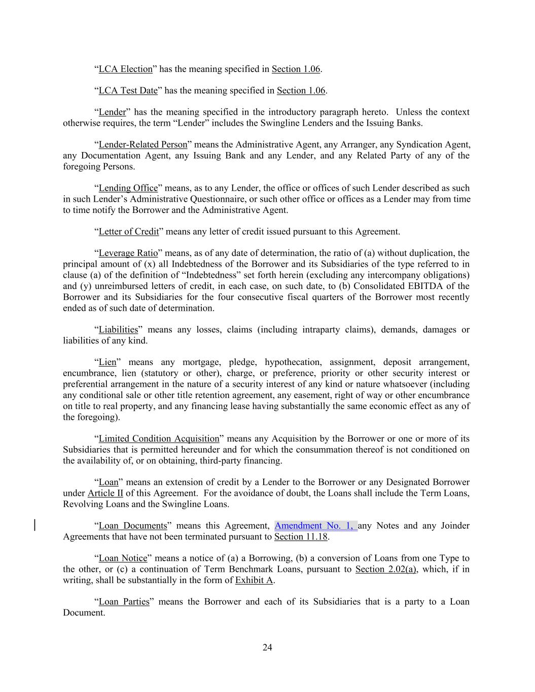 “LCA Election” has the meaning specified in Section 1.06. “LCA Test Date” has the meaning specified in Section 1.06. “Lender” has the meaning specified in the introductory paragraph hereto. Unless the context otherwise requires, the term “Lender” includes the Swingline Lenders and the Issuing Banks. “Lender-Related Person” means the Administrative Agent, any Arranger, any Syndication Agent, any Documentation Agent, any Issuing Bank and any Lender, and any Related Party of any of the foregoing Persons. “Lending Office” means, as to any Lender, the office or offices of such Lender described as such in such Lender’s Administrative Questionnaire, or such other office or offices as a Lender may from time to time notify the Borrower and the Administrative Agent. “Letter of Credit” means any letter of credit issued pursuant to this Agreement. “Leverage Ratio” means, as of any date of determination, the ratio of (a) without duplication, the principal amount of (x) all Indebtedness of the Borrower and its Subsidiaries of the type referred to in clause (a) of the definition of “Indebtedness” set forth herein (excluding any intercompany obligations) and (y) unreimbursed letters of credit, in each case, on such date, to (b) Consolidated EBITDA of the Borrower and its Subsidiaries for the four consecutive fiscal quarters of the Borrower most recently ended as of such date of determination. “Liabilities” means any losses, claims (including intraparty claims), demands, damages or liabilities of any kind. “Lien” means any mortgage, pledge, hypothecation, assignment, deposit arrangement, encumbrance, lien (statutory or other), charge, or preference, priority or other security interest or preferential arrangement in the nature of a security interest of any kind or nature whatsoever (including any conditional sale or other title retention agreement, any easement, right of way or other encumbrance on title to real property, and any financing lease having substantially the same economic effect as any of the foregoing). “Limited Condition Acquisition” means any Acquisition by the Borrower or one or more of its Subsidiaries that is permitted hereunder and for which the consummation thereof is not conditioned on the availability of, or on obtaining, third-party financing. “Loan” means an extension of credit by a Lender to the Borrower or any Designated Borrower under Article II of this Agreement. For the avoidance of doubt, the Loans shall include the Term Loans, Revolving Loans and the Swingline Loans. “Loan Documents” means this Agreement, Amendment No. 1, any Notes and any Joinder Agreements that have not been terminated pursuant to Section 11.18. “Loan Notice” means a notice of (a) a Borrowing, (b) a conversion of Loans from one Type to the other, or (c) a continuation of Term Benchmark Loans, pursuant to Section 2.02(a), which, if in writing, shall be substantially in the form of Exhibit A. “Loan Parties” means the Borrower and each of its Subsidiaries that is a party to a Loan Document. 24