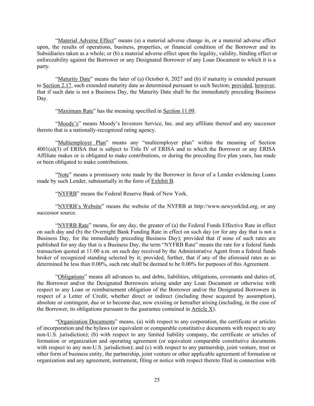 “Material Adverse Effect” means (a) a material adverse change in, or a material adverse effect upon, the results of operations, business, properties, or financial condition of the Borrower and its Subsidiaries taken as a whole; or (b) a material adverse effect upon the legality, validity, binding effect or enforceability against the Borrower or any Designated Borrower of any Loan Document to which it is a party. “Maturity Date” means the later of (a) October 6, 2027 and (b) if maturity is extended pursuant to Section 2.17, such extended maturity date as determined pursuant to such Section; provided, however, that if such date is not a Business Day, the Maturity Date shall be the immediately preceding Business Day. “Maximum Rate” has the meaning specified in Section 11.09. “Moody’s” means Moody’s Investors Service, Inc. and any affiliate thereof and any successor thereto that is a nationally-recognized rating agency. “Multiemployer Plan” means any “multiemployer plan” within the meaning of Section 4001(a)(3) of ERISA that is subject to Title IV of ERISA and to which the Borrower or any ERISA Affiliate makes or is obligated to make contributions, or during the preceding five plan years, has made or been obligated to make contributions. “Note” means a promissory note made by the Borrower in favor of a Lender evidencing Loans made by such Lender, substantially in the form of Exhibit B. “NYFRB” means the Federal Reserve Bank of New York. “NYFRB’s Website” means the website of the NYFRB at http://www.newyorkfed.org, or any successor source. “NYFRB Rate” means, for any day, the greater of (a) the Federal Funds Effective Rate in effect on such day and (b) the Overnight Bank Funding Rate in effect on such day (or for any day that is not a Business Day, for the immediately preceding Business Day); provided that if none of such rates are published for any day that is a Business Day, the term “NYFRB Rate” means the rate for a federal funds transaction quoted at 11:00 a.m. on such day received by the Administrative Agent from a federal funds broker of recognized standing selected by it; provided, further, that if any of the aforesaid rates as so determined be less than 0.00%, such rate shall be deemed to be 0.00% for purposes of this Agreement. “Obligations” means all advances to, and debts, liabilities, obligations, covenants and duties of, the Borrower and/or the Designated Borrowers arising under any Loan Document or otherwise with respect to any Loan or reimbursement obligation of the Borrower and/or the Designated Borrowers in respect of a Letter of Credit, whether direct or indirect (including those acquired by assumption), absolute or contingent, due or to become due, now existing or hereafter arising (including, in the case of the Borrower, its obligations pursuant to the guarantee contained in Article X). “Organization Documents” means, (a) with respect to any corporation, the certificate or articles of incorporation and the bylaws (or equivalent or comparable constitutive documents with respect to any non-U.S. jurisdiction); (b) with respect to any limited liability company, the certificate or articles of formation or organization and operating agreement (or equivalent comparable constitutive documents with respect to any non-U.S. jurisdiction); and (c) with respect to any partnership, joint venture, trust or other form of business entity, the partnership, joint venture or other applicable agreement of formation or organization and any agreement, instrument, filing or notice with respect thereto filed in connection with 25