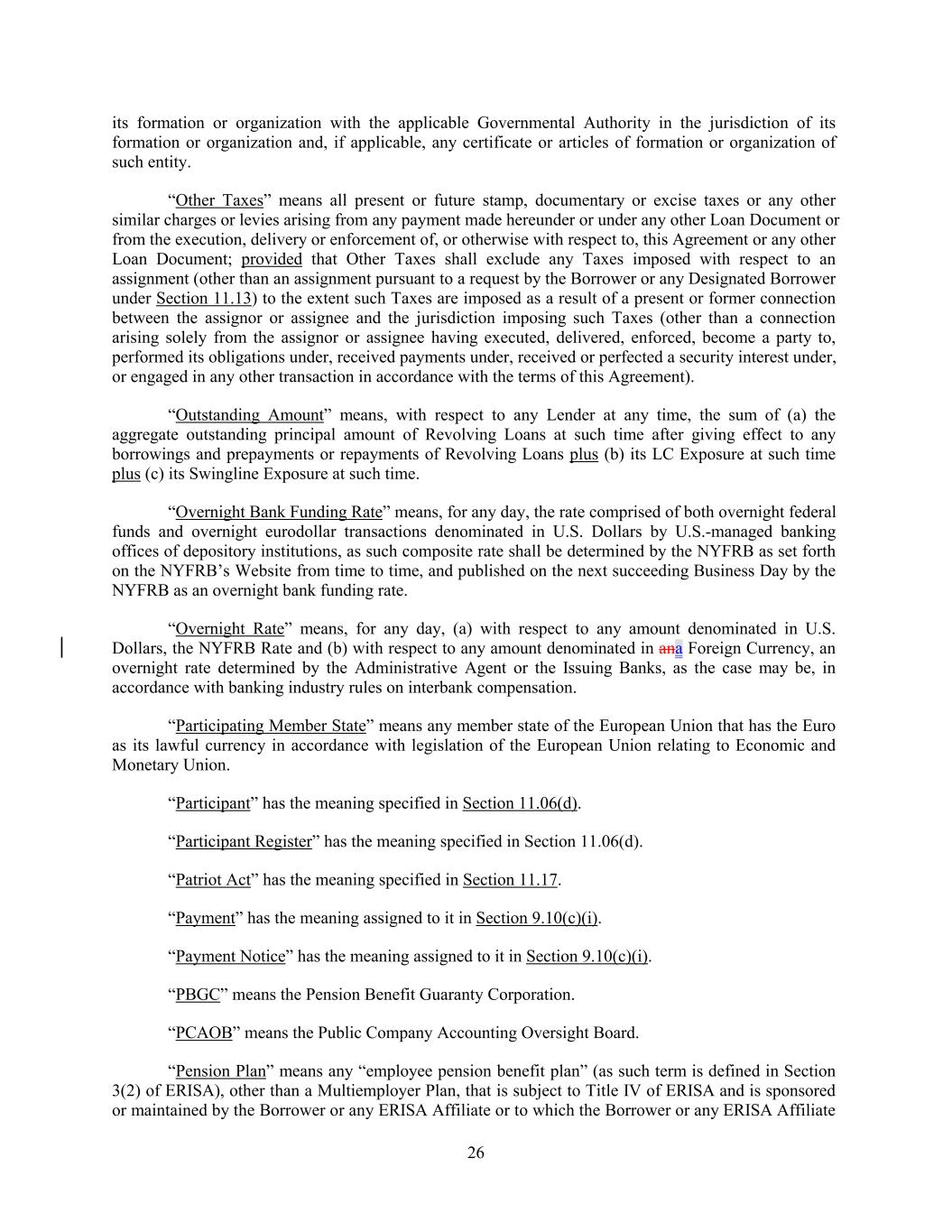 its formation or organization with the applicable Governmental Authority in the jurisdiction of its formation or organization and, if applicable, any certificate or articles of formation or organization of such entity. “Other Taxes” means all present or future stamp, documentary or excise taxes or any other similar charges or levies arising from any payment made hereunder or under any other Loan Document or from the execution, delivery or enforcement of, or otherwise with respect to, this Agreement or any other Loan Document; provided that Other Taxes shall exclude any Taxes imposed with respect to an assignment (other than an assignment pursuant to a request by the Borrower or any Designated Borrower under Section 11.13) to the extent such Taxes are imposed as a result of a present or former connection between the assignor or assignee and the jurisdiction imposing such Taxes (other than a connection arising solely from the assignor or assignee having executed, delivered, enforced, become a party to, performed its obligations under, received payments under, received or perfected a security interest under, or engaged in any other transaction in accordance with the terms of this Agreement). “Outstanding Amount” means, with respect to any Lender at any time, the sum of (a) the aggregate outstanding principal amount of Revolving Loans at such time after giving effect to any borrowings and prepayments or repayments of Revolving Loans plus (b) its LC Exposure at such time plus (c) its Swingline Exposure at such time. “Overnight Bank Funding Rate” means, for any day, the rate comprised of both overnight federal funds and overnight eurodollar transactions denominated in U.S. Dollars by U.S.-managed banking offices of depository institutions, as such composite rate shall be determined by the NYFRB as set forth on the NYFRB’s Website from time to time, and published on the next succeeding Business Day by the NYFRB as an overnight bank funding rate. “Overnight Rate” means, for any day, (a) with respect to any amount denominated in U.S. Dollars, the NYFRB Rate and (b) with respect to any amount denominated in ana Foreign Currency, an overnight rate determined by the Administrative Agent or the Issuing Banks, as the case may be, in accordance with banking industry rules on interbank compensation. “Participating Member State” means any member state of the European Union that has the Euro as its lawful currency in accordance with legislation of the European Union relating to Economic and Monetary Union. “Participant” has the meaning specified in Section 11.06(d). “Participant Register” has the meaning specified in Section 11.06(d). “Patriot Act” has the meaning specified in Section 11.17. “Payment” has the meaning assigned to it in Section 9.10(c)(i). “Payment Notice” has the meaning assigned to it in Section 9.10(c)(i). “PBGC” means the Pension Benefit Guaranty Corporation. “PCAOB” means the Public Company Accounting Oversight Board. “Pension Plan” means any “employee pension benefit plan” (as such term is defined in Section 3(2) of ERISA), other than a Multiemployer Plan, that is subject to Title IV of ERISA and is sponsored or maintained by the Borrower or any ERISA Affiliate or to which the Borrower or any ERISA Affiliate 26