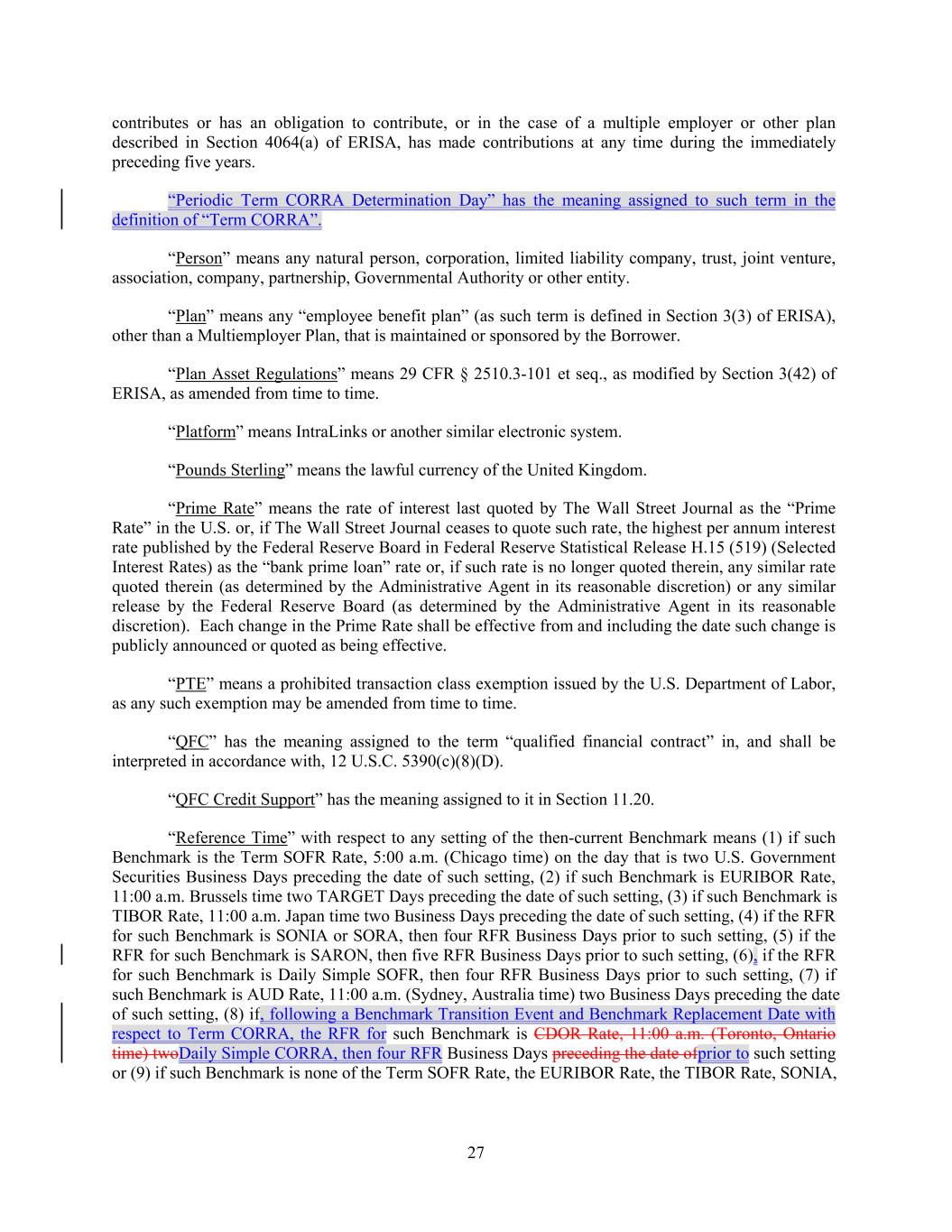 contributes or has an obligation to contribute, or in the case of a multiple employer or other plan described in Section 4064(a) of ERISA, has made contributions at any time during the immediately preceding five years. “Periodic Term CORRA Determination Day” has the meaning assigned to such term in the definition of “Term CORRA”. “Person” means any natural person, corporation, limited liability company, trust, joint venture, association, company, partnership, Governmental Authority or other entity. “Plan” means any “employee benefit plan” (as such term is defined in Section 3(3) of ERISA), other than a Multiemployer Plan, that is maintained or sponsored by the Borrower. “Plan Asset Regulations” means 29 CFR § 2510.3-101 et seq., as modified by Section 3(42) of ERISA, as amended from time to time. “Platform” means IntraLinks or another similar electronic system. “Pounds Sterling” means the lawful currency of the United Kingdom. “Prime Rate” means the rate of interest last quoted by The Wall Street Journal as the “Prime Rate” in the U.S. or, if The Wall Street Journal ceases to quote such rate, the highest per annum interest rate published by the Federal Reserve Board in Federal Reserve Statistical Release H.15 (519) (Selected Interest Rates) as the “bank prime loan” rate or, if such rate is no longer quoted therein, any similar rate quoted therein (as determined by the Administrative Agent in its reasonable discretion) or any similar release by the Federal Reserve Board (as determined by the Administrative Agent in its reasonable discretion). Each change in the Prime Rate shall be effective from and including the date such change is publicly announced or quoted as being effective. “PTE” means a prohibited transaction class exemption issued by the U.S. Department of Labor, as any such exemption may be amended from time to time. “QFC” has the meaning assigned to the term “qualified financial contract” in, and shall be interpreted in accordance with, 12 U.S.C. 5390(c)(8)(D). “QFC Credit Support” has the meaning assigned to it in Section 11.20. “Reference Time” with respect to any setting of the then-current Benchmark means (1) if such Benchmark is the Term SOFR Rate, 5:00 a.m. (Chicago time) on the day that is two U.S. Government Securities Business Days preceding the date of such setting, (2) if such Benchmark is EURIBOR Rate, 11:00 a.m. Brussels time two TARGET Days preceding the date of such setting, (3) if such Benchmark is TIBOR Rate, 11:00 a.m. Japan time two Business Days preceding the date of such setting, (4) if the RFR for such Benchmark is SONIA or SORA, then four RFR Business Days prior to such setting, (5) if the RFR for such Benchmark is SARON, then five RFR Business Days prior to such setting, (6), if the RFR for such Benchmark is Daily Simple SOFR, then four RFR Business Days prior to such setting, (7) if such Benchmark is AUD Rate, 11:00 a.m. (Sydney, Australia time) two Business Days preceding the date of such setting, (8) if, following a Benchmark Transition Event and Benchmark Replacement Date with respect to Term CORRA, the RFR for such Benchmark is CDOR Rate, 11:00 a.m. (Toronto, Ontario time) twoDaily Simple CORRA, then four RFR Business Days preceding the date ofprior to such setting or (9) if such Benchmark is none of the Term SOFR Rate, the EURIBOR Rate, the TIBOR Rate, SONIA, 27