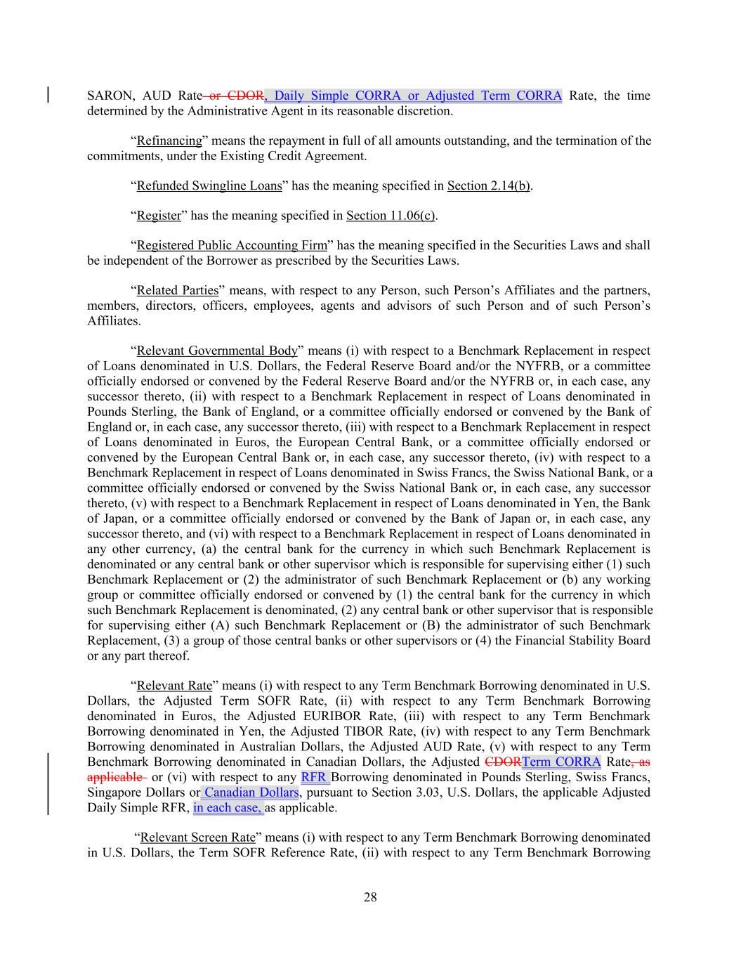 SARON, AUD Rate or CDOR, Daily Simple CORRA or Adjusted Term CORRA Rate, the time determined by the Administrative Agent in its reasonable discretion. “Refinancing” means the repayment in full of all amounts outstanding, and the termination of the commitments, under the Existing Credit Agreement. “Refunded Swingline Loans” has the meaning specified in Section 2.14(b). “Register” has the meaning specified in Section 11.06(c). “Registered Public Accounting Firm” has the meaning specified in the Securities Laws and shall be independent of the Borrower as prescribed by the Securities Laws. “Related Parties” means, with respect to any Person, such Person’s Affiliates and the partners, members, directors, officers, employees, agents and advisors of such Person and of such Person’s Affiliates. “Relevant Governmental Body” means (i) with respect to a Benchmark Replacement in respect of Loans denominated in U.S. Dollars, the Federal Reserve Board and/or the NYFRB, or a committee officially endorsed or convened by the Federal Reserve Board and/or the NYFRB or, in each case, any successor thereto, (ii) with respect to a Benchmark Replacement in respect of Loans denominated in Pounds Sterling, the Bank of England, or a committee officially endorsed or convened by the Bank of England or, in each case, any successor thereto, (iii) with respect to a Benchmark Replacement in respect of Loans denominated in Euros, the European Central Bank, or a committee officially endorsed or convened by the European Central Bank or, in each case, any successor thereto, (iv) with respect to a Benchmark Replacement in respect of Loans denominated in Swiss Francs, the Swiss National Bank, or a committee officially endorsed or convened by the Swiss National Bank or, in each case, any successor thereto, (v) with respect to a Benchmark Replacement in respect of Loans denominated in Yen, the Bank of Japan, or a committee officially endorsed or convened by the Bank of Japan or, in each case, any successor thereto, and (vi) with respect to a Benchmark Replacement in respect of Loans denominated in any other currency, (a) the central bank for the currency in which such Benchmark Replacement is denominated or any central bank or other supervisor which is responsible for supervising either (1) such Benchmark Replacement or (2) the administrator of such Benchmark Replacement or (b) any working group or committee officially endorsed or convened by (1) the central bank for the currency in which such Benchmark Replacement is denominated, (2) any central bank or other supervisor that is responsible for supervising either (A) such Benchmark Replacement or (B) the administrator of such Benchmark Replacement, (3) a group of those central banks or other supervisors or (4) the Financial Stability Board or any part thereof. “Relevant Rate” means (i) with respect to any Term Benchmark Borrowing denominated in U.S. Dollars, the Adjusted Term SOFR Rate, (ii) with respect to any Term Benchmark Borrowing denominated in Euros, the Adjusted EURIBOR Rate, (iii) with respect to any Term Benchmark Borrowing denominated in Yen, the Adjusted TIBOR Rate, (iv) with respect to any Term Benchmark Borrowing denominated in Australian Dollars, the Adjusted AUD Rate, (v) with respect to any Term Benchmark Borrowing denominated in Canadian Dollars, the Adjusted CDORTerm CORRA Rate, as applicable or (vi) with respect to any RFR Borrowing denominated in Pounds Sterling, Swiss Francs, Singapore Dollars or Canadian Dollars, pursuant to Section 3.03, U.S. Dollars, the applicable Adjusted Daily Simple RFR, in each case, as applicable. “Relevant Screen Rate” means (i) with respect to any Term Benchmark Borrowing denominated in U.S. Dollars, the Term SOFR Reference Rate, (ii) with respect to any Term Benchmark Borrowing 28