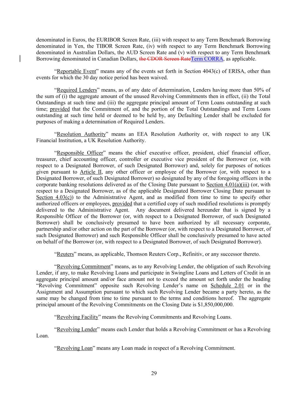 denominated in Euros, the EURIBOR Screen Rate, (iii) with respect to any Term Benchmark Borrowing denominated in Yen, the TIBOR Screen Rate, (iv) with respect to any Term Benchmark Borrowing denominated in Australian Dollars, the AUD Screen Rate and (v) with respect to any Term Benchmark Borrowing denominated in Canadian Dollars, the CDOR Screen RateTerm CORRA, as applicable. “Reportable Event” means any of the events set forth in Section 4043(c) of ERISA, other than events for which the 30 day notice period has been waived. “Required Lenders” means, as of any date of determination, Lenders having more than 50% of the sum of (i) the aggregate amount of the unused Revolving Commitments then in effect, (ii) the Total Outstandings at such time and (iii) the aggregate principal amount of Term Loans outstanding at such time; provided that the Commitment of, and the portion of the Total Outstandings and Term Loans outstanding at such time held or deemed to be held by, any Defaulting Lender shall be excluded for purposes of making a determination of Required Lenders. “Resolution Authority” means an EEA Resolution Authority or, with respect to any UK Financial Institution, a UK Resolution Authority. “Responsible Officer” means the chief executive officer, president, chief financial officer, treasurer, chief accounting officer, controller or executive vice president of the Borrower (or, with respect to a Designated Borrower, of such Designated Borrower) and, solely for purposes of notices given pursuant to Article II, any other officer or employee of the Borrower (or, with respect to a Designated Borrower, of such Designated Borrower) so designated by any of the foregoing officers in the corporate banking resolutions delivered as of the Closing Date pursuant to Section 4.01(a)(iii) (or, with respect to a Designated Borrower, as of the applicable Designated Borrower Closing Date pursuant to Section 4.03(c)) to the Administrative Agent, and as modified from time to time to specify other authorized officers or employees, provided that a certified copy of such modified resolutions is promptly delivered to the Administrative Agent. Any document delivered hereunder that is signed by a Responsible Officer of the Borrower (or, with respect to a Designated Borrower, of such Designated Borrower) shall be conclusively presumed to have been authorized by all necessary corporate, partnership and/or other action on the part of the Borrower (or, with respect to a Designated Borrower, of such Designated Borrower) and such Responsible Officer shall be conclusively presumed to have acted on behalf of the Borrower (or, with respect to a Designated Borrower, of such Designated Borrower). “Reuters” means, as applicable, Thomson Reuters Corp., Refinitiv, or any successor thereto. “Revolving Commitment” means, as to any Revolving Lender, the obligation of such Revolving Lender, if any, to make Revolving Loans and participate in Swingline Loans and Letters of Credit in an aggregate principal amount and/or face amount not to exceed the amount set forth under the heading “Revolving Commitment” opposite such Revolving Lender’s name on Schedule 2.01 or in the Assignment and Assumption pursuant to which such Revolving Lender became a party hereto, as the same may be changed from time to time pursuant to the terms and conditions hereof. The aggregate principal amount of the Revolving Commitments on the Closing Date is $1,850,000,000. “Revolving Facility” means the Revolving Commitments and Revolving Loans. “Revolving Lender” means each Lender that holds a Revolving Commitment or has a Revolving Loan. “Revolving Loan” means any Loan made in respect of a Revolving Commitment. 29