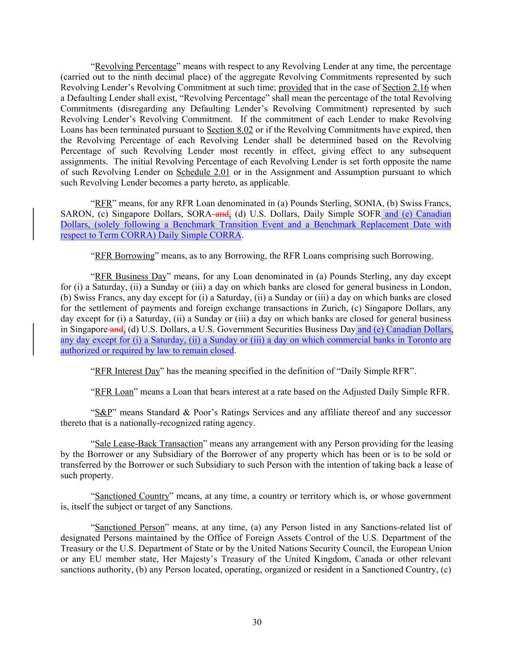 “Revolving Percentage” means with respect to any Revolving Lender at any time, the percentage (carried out to the ninth decimal place) of the aggregate Revolving Commitments represented by such Revolving Lender’s Revolving Commitment at such time; provided that in the case of Section 2.16 when a Defaulting Lender shall exist, “Revolving Percentage” shall mean the percentage of the total Revolving Commitments (disregarding any Defaulting Lender’s Revolving Commitment) represented by such Revolving Lender’s Revolving Commitment. If the commitment of each Lender to make Revolving Loans has been terminated pursuant to Section 8.02 or if the Revolving Commitments have expired, then the Revolving Percentage of each Revolving Lender shall be determined based on the Revolving Percentage of such Revolving Lender most recently in effect, giving effect to any subsequent assignments. The initial Revolving Percentage of each Revolving Lender is set forth opposite the name of such Revolving Lender on Schedule 2.01 or in the Assignment and Assumption pursuant to which such Revolving Lender becomes a party hereto, as applicable. “RFR” means, for any RFR Loan denominated in (a) Pounds Sterling, SONIA, (b) Swiss Francs, SARON, (c) Singapore Dollars, SORA and, (d) U.S. Dollars, Daily Simple SOFR and (e) Canadian Dollars, (solely following a Benchmark Transition Event and a Benchmark Replacement Date with respect to Term CORRA) Daily Simple CORRA. “RFR Borrowing” means, as to any Borrowing, the RFR Loans comprising such Borrowing. “RFR Business Day” means, for any Loan denominated in (a) Pounds Sterling, any day except for (i) a Saturday, (ii) a Sunday or (iii) a day on which banks are closed for general business in London, (b) Swiss Francs, any day except for (i) a Saturday, (ii) a Sunday or (iii) a day on which banks are closed for the settlement of payments and foreign exchange transactions in Zurich, (c) Singapore Dollars, any day except for (i) a Saturday, (ii) a Sunday or (iii) a day on which banks are closed for general business in Singapore and, (d) U.S. Dollars, a U.S. Government Securities Business Day and (e) Canadian Dollars, any day except for (i) a Saturday, (ii) a Sunday or (iii) a day on which commercial banks in Toronto are authorized or required by law to remain closed. “RFR Interest Day” has the meaning specified in the definition of “Daily Simple RFR”. “RFR Loan” means a Loan that bears interest at a rate based on the Adjusted Daily Simple RFR. “S&P” means Standard & Poor’s Ratings Services and any affiliate thereof and any successor thereto that is a nationally-recognized rating agency. “Sale Lease-Back Transaction” means any arrangement with any Person providing for the leasing by the Borrower or any Subsidiary of the Borrower of any property which has been or is to be sold or transferred by the Borrower or such Subsidiary to such Person with the intention of taking back a lease of such property. “Sanctioned Country” means, at any time, a country or territory which is, or whose government is, itself the subject or target of any Sanctions. “Sanctioned Person” means, at any time, (a) any Person listed in any Sanctions-related list of designated Persons maintained by the Office of Foreign Assets Control of the U.S. Department of the Treasury or the U.S. Department of State or by the United Nations Security Council, the European Union or any EU member state, Her Majesty’s Treasury of the United Kingdom, Canada or other relevant sanctions authority, (b) any Person located, operating, organized or resident in a Sanctioned Country, (c) 30