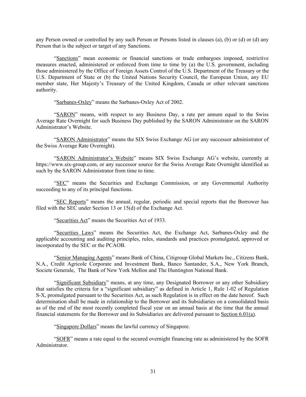 any Person owned or controlled by any such Person or Persons listed in clauses (a), (b) or (d) or (d) any Person that is the subject or target of any Sanctions. “Sanctions” mean economic or financial sanctions or trade embargoes imposed, restrictive measures enacted, administered or enforced from time to time by (a) the U.S. government, including those administered by the Office of Foreign Assets Control of the U.S. Department of the Treasury or the U.S. Department of State or (b) the United Nations Security Council, the European Union, any EU member state, Her Majesty’s Treasury of the United Kingdom, Canada or other relevant sanctions authority. “Sarbanes-Oxley” means the Sarbanes-Oxley Act of 2002. “SARON” means, with respect to any Business Day, a rate per annum equal to the Swiss Average Rate Overnight for such Business Day published by the SARON Administrator on the SARON Administrator’s Website. “SARON Administrator” means the SIX Swiss Exchange AG (or any successor administrator of the Swiss Average Rate Overnight). “SARON Administrator’s Website” means SIX Swiss Exchange AG’s website, currently at https://www.six-group.com, or any successor source for the Swiss Average Rate Overnight identified as such by the SARON Administrator from time to time. “SEC” means the Securities and Exchange Commission, or any Governmental Authority succeeding to any of its principal functions. “SEC Reports” means the annual, regular, periodic and special reports that the Borrower has filed with the SEC under Section 13 or 15(d) of the Exchange Act. “Securities Act” means the Securities Act of 1933. “Securities Laws” means the Securities Act, the Exchange Act, Sarbanes-Oxley and the applicable accounting and auditing principles, rules, standards and practices promulgated, approved or incorporated by the SEC or the PCAOB. “Senior Managing Agents” means Bank of China, Citigroup Global Markets Inc., Citizens Bank, N.A., Credit Agricole Corporate and Investment Bank, Banco Santander, S.A., New York Branch, Societe Generale, The Bank of New York Mellon and The Huntington National Bank. “Significant Subsidiary” means, at any time, any Designated Borrower or any other Subsidiary that satisfies the criteria for a “significant subsidiary” as defined in Article 1, Rule 1-02 of Regulation S-X, promulgated pursuant to the Securities Act, as such Regulation is in effect on the date hereof. Such determination shall be made in relationship to the Borrower and its Subsidiaries on a consolidated basis as of the end of the most recently completed fiscal year on an annual basis at the time that the annual financial statements for the Borrower and its Subsidiaries are delivered pursuant to Section 6.01(a). “Singapore Dollars” means the lawful currency of Singapore. “SOFR” means a rate equal to the secured overnight financing rate as administered by the SOFR Administrator. 31