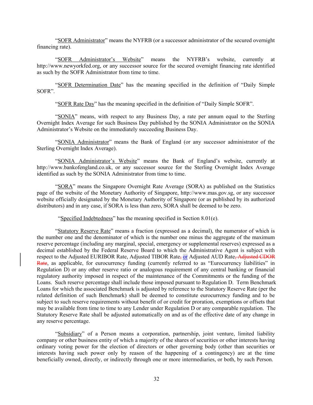 “SOFR Administrator” means the NYFRB (or a successor administrator of the secured overnight financing rate). “SOFR Administrator’s Website” means the NYFRB’s website, currently at http://www.newyorkfed.org, or any successor source for the secured overnight financing rate identified as such by the SOFR Administrator from time to time. “SOFR Determination Date” has the meaning specified in the definition of “Daily Simple SOFR”. “SOFR Rate Day” has the meaning specified in the definition of “Daily Simple SOFR”. “SONIA” means, with respect to any Business Day, a rate per annum equal to the Sterling Overnight Index Average for such Business Day published by the SONIA Administrator on the SONIA Administrator’s Website on the immediately succeeding Business Day. “SONIA Administrator” means the Bank of England (or any successor administrator of the Sterling Overnight Index Average). “SONIA Administrator’s Website” means the Bank of England’s website, currently at http://www.bankofengland.co.uk, or any successor source for the Sterling Overnight Index Average identified as such by the SONIA Administrator from time to time. “SORA” means the Singapore Overnight Rate Average (SORA) as published on the Statistics page of the website of the Monetary Authority of Singapore, http://www.mas.gov.sg, or any successor website officially designated by the Monetary Authority of Singapore (or as published by its authorized distributors) and in any case, if SORA is less than zero, SORA shall be deemed to be zero. “Specified Indebtedness” has the meaning specified in Section 8.01(e). “Statutory Reserve Rate” means a fraction (expressed as a decimal), the numerator of which is the number one and the denominator of which is the number one minus the aggregate of the maximum reserve percentage (including any marginal, special, emergency or supplemental reserves) expressed as a decimal established by the Federal Reserve Board to which the Administrative Agent is subject with respect to the Adjusted EURIBOR Rate, Adjusted TIBOR Rate, or Adjusted AUD Rate, Adjusted CDOR Rate, as applicable, for eurocurrency funding (currently referred to as “Eurocurrency liabilities” in Regulation D) or any other reserve ratio or analogous requirement of any central banking or financial regulatory authority imposed in respect of the maintenance of the Commitments or the funding of the Loans. Such reserve percentage shall include those imposed pursuant to Regulation D. Term Benchmark Loans for which the associated Benchmark is adjusted by reference to the Statutory Reserve Rate (per the related definition of such Benchmark) shall be deemed to constitute eurocurrency funding and to be subject to such reserve requirements without benefit of or credit for proration, exemptions or offsets that may be available from time to time to any Lender under Regulation D or any comparable regulation. The Statutory Reserve Rate shall be adjusted automatically on and as of the effective date of any change in any reserve percentage. “Subsidiary” of a Person means a corporation, partnership, joint venture, limited liability company or other business entity of which a majority of the shares of securities or other interests having ordinary voting power for the election of directors or other governing body (other than securities or interests having such power only by reason of the happening of a contingency) are at the time beneficially owned, directly, or indirectly through one or more intermediaries, or both, by such Person. 32