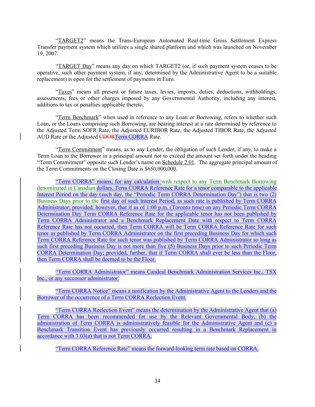 “TARGET2” means the Trans-European Automated Real-time Gross Settlement Express Transfer payment system which utilizes a single shared platform and which was launched on November 19, 2007. “TARGET Day” means any day on which TARGET2 (or, if such payment system ceases to be operative, such other payment system, if any, determined by the Administrative Agent to be a suitable replacement) is open for the settlement of payments in Euro. “Taxes” means all present or future taxes, levies, imposts, duties, deductions, withholdings, assessments, fees or other charges imposed by any Governmental Authority, including any interest, additions to tax or penalties applicable thereto. “Term Benchmark” when used in reference to any Loan or Borrowing, refers to whether such Loan, or the Loans comprising such Borrowing, are bearing interest at a rate determined by reference to the Adjusted Term SOFR Rate, the Adjusted EURIBOR Rate, the Adjusted TIBOR Rate, the Adjusted AUD Rate or the Adjusted CDORTerm CORRA Rate. “Term Commitment” means, as to any Lender, the obligation of such Lender, if any, to make a Term Loan to the Borrower in a principal amount not to exceed the amount set forth under the heading “Term Commitment” opposite such Lender’s name on Schedule 2.01. The aggregate principal amount of the Term Commitments on the Closing Date is $650,000,000. “Term CORRA” means, for any calculation with respect to any Term Benchmark Borrowing denominated in Canadian dollars, Term CORRA Reference Rate for a tenor comparable to the applicable Interest Period on the day (such day, the “Periodic Term CORRA Determination Day”) that is two (2) Business Days prior to the first day of such Interest Period, as such rate is published by Term CORRA Administrator; provided, however, that if as of 1:00 p.m. (Toronto time) on any Periodic Term CORRA Determination Day Term CORRA Reference Rate for the applicable tenor has not been published by Term CORRA Administrator and a Benchmark Replacement Date with respect to Term CORRA Reference Rate has not occurred, then Term CORRA will be Term CORRA Reference Rate for such tenor as published by Term CORRA Administrator on the first preceding Business Day for which such Term CORRA Reference Rate for such tenor was published by Term CORRA Administrator so long as such first preceding Business Day is not more than five (5) Business Days prior to such Periodic Term CORRA Determination Day; provided, further, that if Term CORRA shall ever be less than the Floor, then Term CORRA shall be deemed to be the Floor. “Term CORRA Administrator” means Candeal Benchmark Administration Services Inc., TSX Inc., or any successor administrator. “Term CORRA Notice” means a notification by the Administrative Agent to the Lenders and the Borrower of the occurrence of a Term CORRA Reelection Event. “Term CORRA Reelection Event” means the determination by the Administrative Agent that (a) Term CORRA has been recommended for use by the Relevant Governmental Body, (b) the administration of Term CORRA is administratively feasible for the Administrative Agent and (c) a Benchmark Transition Event has previously occurred resulting in a Benchmark Replacement in accordance with 3.03(a) that is not Term CORRA. “Term CORRA Reference Rate” means the forward-looking term rate based on CORRA. 34