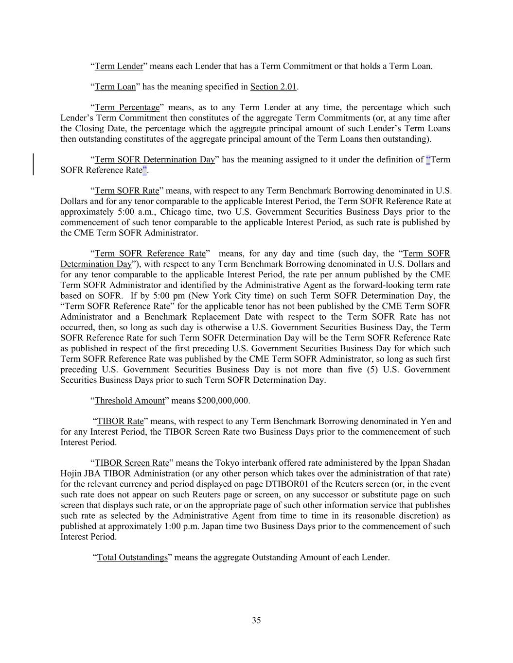 “Term Lender” means each Lender that has a Term Commitment or that holds a Term Loan. “Term Loan” has the meaning specified in Section 2.01. “Term Percentage” means, as to any Term Lender at any time, the percentage which such Lender’s Term Commitment then constitutes of the aggregate Term Commitments (or, at any time after the Closing Date, the percentage which the aggregate principal amount of such Lender’s Term Loans then outstanding constitutes of the aggregate principal amount of the Term Loans then outstanding). “Term SOFR Determination Day” has the meaning assigned to it under the definition of “Term SOFR Reference Rate”. “Term SOFR Rate” means, with respect to any Term Benchmark Borrowing denominated in U.S. Dollars and for any tenor comparable to the applicable Interest Period, the Term SOFR Reference Rate at approximately 5:00 a.m., Chicago time, two U.S. Government Securities Business Days prior to the commencement of such tenor comparable to the applicable Interest Period, as such rate is published by the CME Term SOFR Administrator. “Term SOFR Reference Rate” means, for any day and time (such day, the “Term SOFR Determination Day”), with respect to any Term Benchmark Borrowing denominated in U.S. Dollars and for any tenor comparable to the applicable Interest Period, the rate per annum published by the CME Term SOFR Administrator and identified by the Administrative Agent as the forward-looking term rate based on SOFR. If by 5:00 pm (New York City time) on such Term SOFR Determination Day, the “Term SOFR Reference Rate” for the applicable tenor has not been published by the CME Term SOFR Administrator and a Benchmark Replacement Date with respect to the Term SOFR Rate has not occurred, then, so long as such day is otherwise a U.S. Government Securities Business Day, the Term SOFR Reference Rate for such Term SOFR Determination Day will be the Term SOFR Reference Rate as published in respect of the first preceding U.S. Government Securities Business Day for which such Term SOFR Reference Rate was published by the CME Term SOFR Administrator, so long as such first preceding U.S. Government Securities Business Day is not more than five (5) U.S. Government Securities Business Days prior to such Term SOFR Determination Day. “Threshold Amount” means $200,000,000. “TIBOR Rate” means, with respect to any Term Benchmark Borrowing denominated in Yen and for any Interest Period, the TIBOR Screen Rate two Business Days prior to the commencement of such Interest Period. “TIBOR Screen Rate” means the Tokyo interbank offered rate administered by the Ippan Shadan Hojin JBA TIBOR Administration (or any other person which takes over the administration of that rate) for the relevant currency and period displayed on page DTIBOR01 of the Reuters screen (or, in the event such rate does not appear on such Reuters page or screen, on any successor or substitute page on such screen that displays such rate, or on the appropriate page of such other information service that publishes such rate as selected by the Administrative Agent from time to time in its reasonable discretion) as published at approximately 1:00 p.m. Japan time two Business Days prior to the commencement of such Interest Period. “Total Outstandings” means the aggregate Outstanding Amount of each Lender. 35