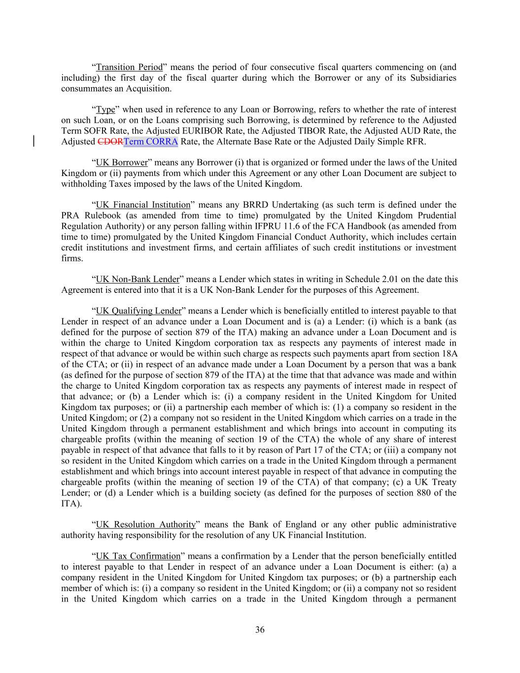 “Transition Period” means the period of four consecutive fiscal quarters commencing on (and including) the first day of the fiscal quarter during which the Borrower or any of its Subsidiaries consummates an Acquisition. “Type” when used in reference to any Loan or Borrowing, refers to whether the rate of interest on such Loan, or on the Loans comprising such Borrowing, is determined by reference to the Adjusted Term SOFR Rate, the Adjusted EURIBOR Rate, the Adjusted TIBOR Rate, the Adjusted AUD Rate, the Adjusted CDORTerm CORRA Rate, the Alternate Base Rate or the Adjusted Daily Simple RFR. “UK Borrower” means any Borrower (i) that is organized or formed under the laws of the United Kingdom or (ii) payments from which under this Agreement or any other Loan Document are subject to withholding Taxes imposed by the laws of the United Kingdom. “UK Financial Institution” means any BRRD Undertaking (as such term is defined under the PRA Rulebook (as amended from time to time) promulgated by the United Kingdom Prudential Regulation Authority) or any person falling within IFPRU 11.6 of the FCA Handbook (as amended from time to time) promulgated by the United Kingdom Financial Conduct Authority, which includes certain credit institutions and investment firms, and certain affiliates of such credit institutions or investment firms. “UK Non-Bank Lender” means a Lender which states in writing in Schedule 2.01 on the date this Agreement is entered into that it is a UK Non-Bank Lender for the purposes of this Agreement. “UK Qualifying Lender” means a Lender which is beneficially entitled to interest payable to that Lender in respect of an advance under a Loan Document and is (a) a Lender: (i) which is a bank (as defined for the purpose of section 879 of the ITA) making an advance under a Loan Document and is within the charge to United Kingdom corporation tax as respects any payments of interest made in respect of that advance or would be within such charge as respects such payments apart from section 18A of the CTA; or (ii) in respect of an advance made under a Loan Document by a person that was a bank (as defined for the purpose of section 879 of the ITA) at the time that that advance was made and within the charge to United Kingdom corporation tax as respects any payments of interest made in respect of that advance; or (b) a Lender which is: (i) a company resident in the United Kingdom for United Kingdom tax purposes; or (ii) a partnership each member of which is: (1) a company so resident in the United Kingdom; or (2) a company not so resident in the United Kingdom which carries on a trade in the United Kingdom through a permanent establishment and which brings into account in computing its chargeable profits (within the meaning of section 19 of the CTA) the whole of any share of interest payable in respect of that advance that falls to it by reason of Part 17 of the CTA; or (iii) a company not so resident in the United Kingdom which carries on a trade in the United Kingdom through a permanent establishment and which brings into account interest payable in respect of that advance in computing the chargeable profits (within the meaning of section 19 of the CTA) of that company; (c) a UK Treaty Lender; or (d) a Lender which is a building society (as defined for the purposes of section 880 of the ITA). “UK Resolution Authority” means the Bank of England or any other public administrative authority having responsibility for the resolution of any UK Financial Institution. “UK Tax Confirmation” means a confirmation by a Lender that the person beneficially entitled to interest payable to that Lender in respect of an advance under a Loan Document is either: (a) a company resident in the United Kingdom for United Kingdom tax purposes; or (b) a partnership each member of which is: (i) a company so resident in the United Kingdom; or (ii) a company not so resident in the United Kingdom which carries on a trade in the United Kingdom through a permanent 36